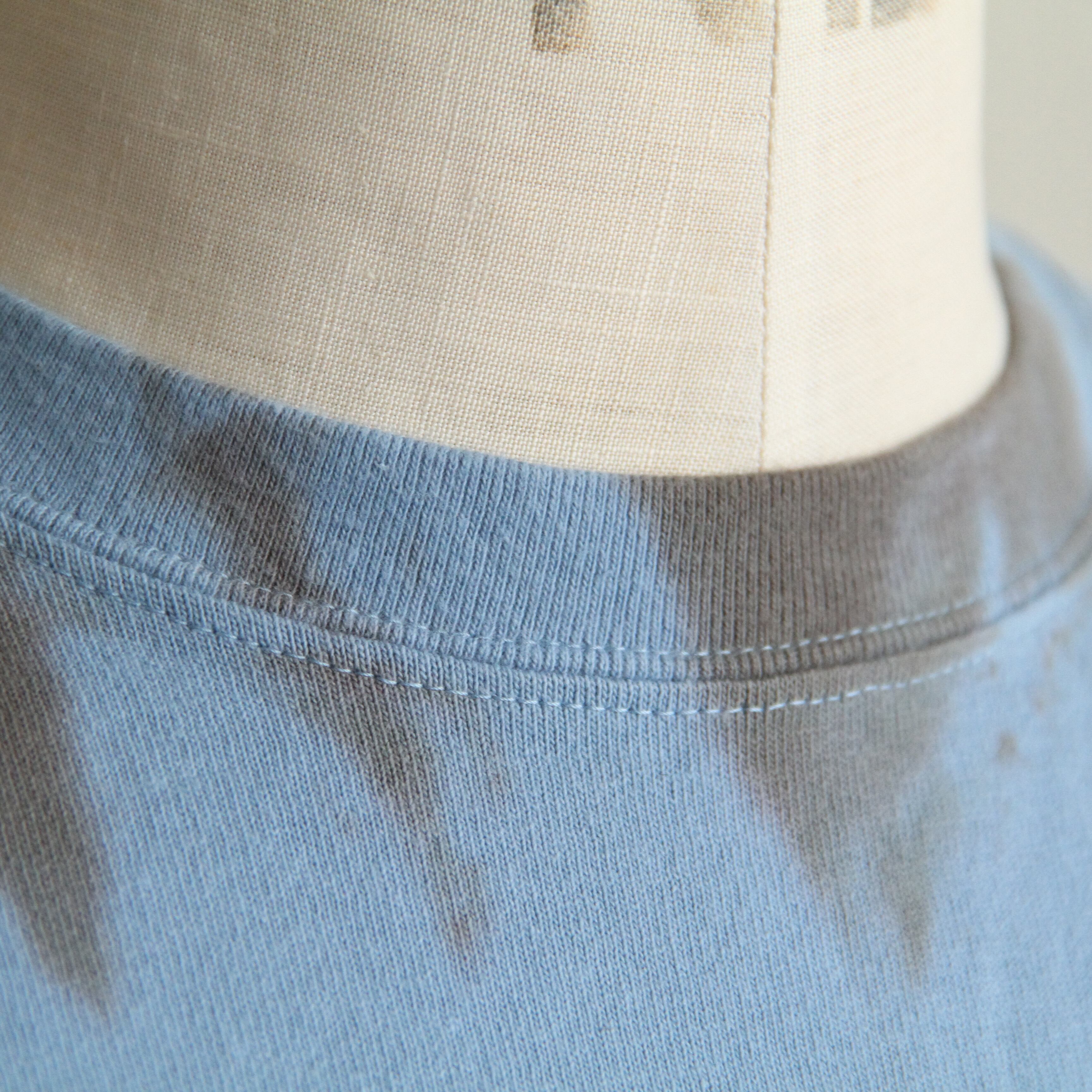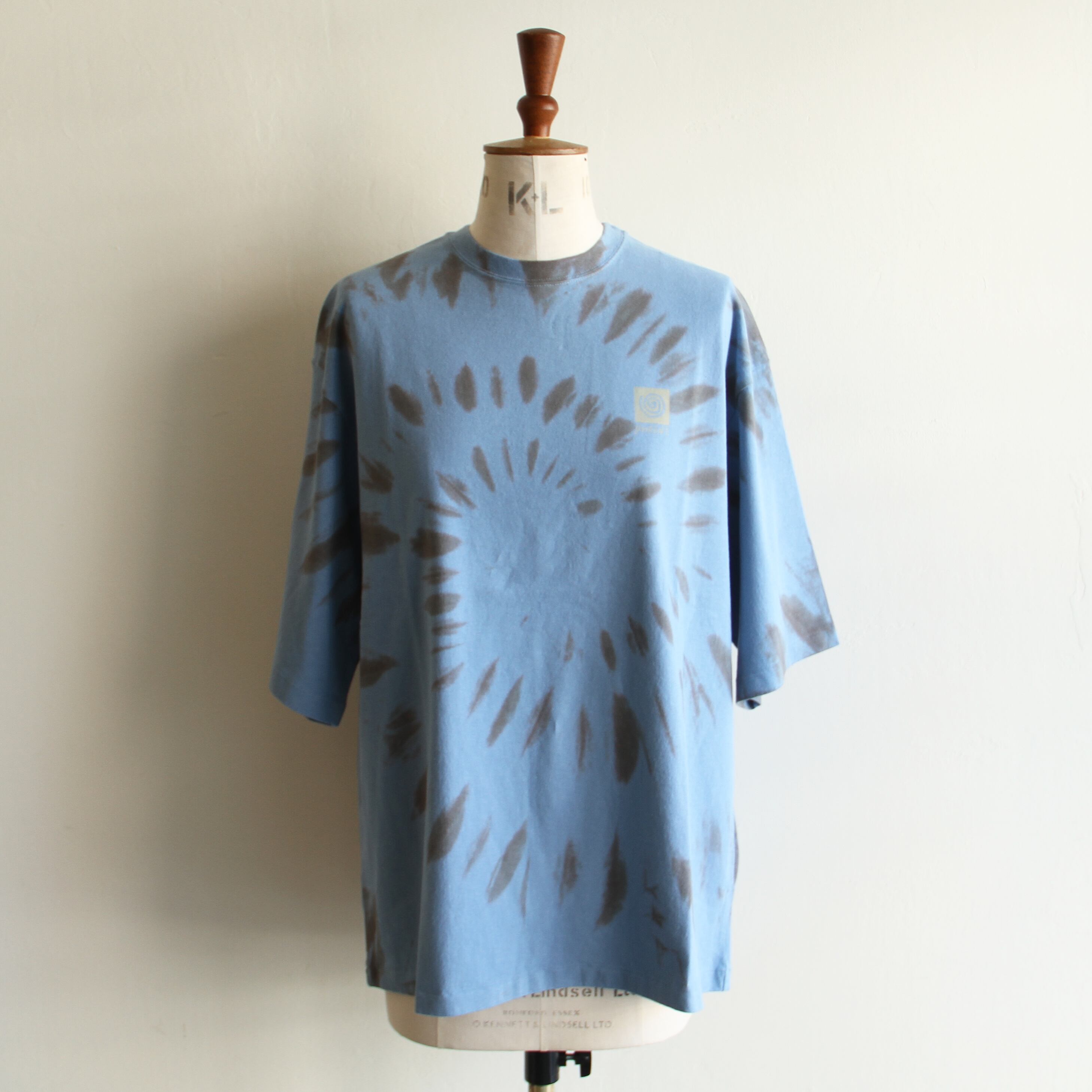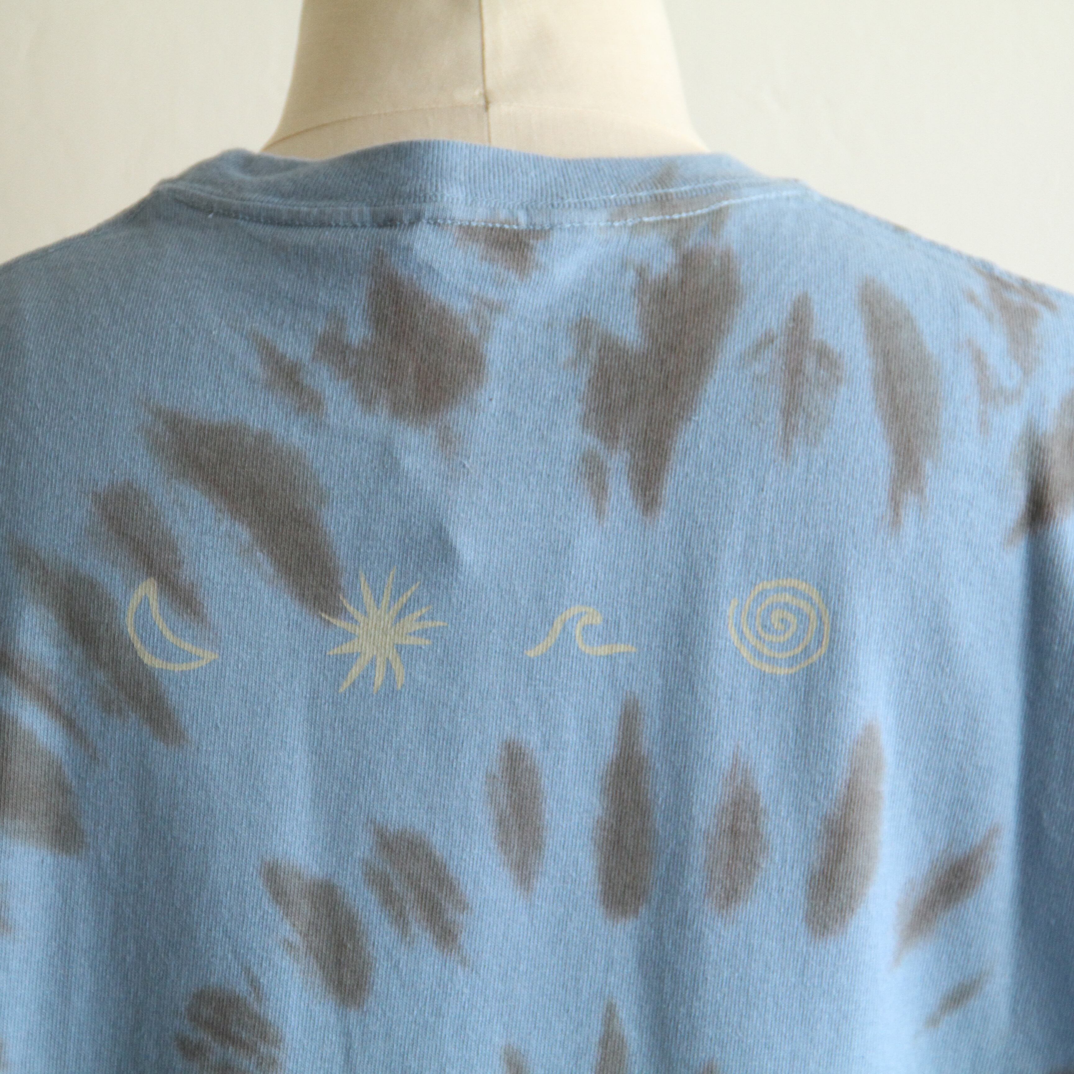 ブラウンはランダムな染め柄、ブルーは渦巻き模様、左胸と背中にはワンポイントのプリントが施されたデザイン。