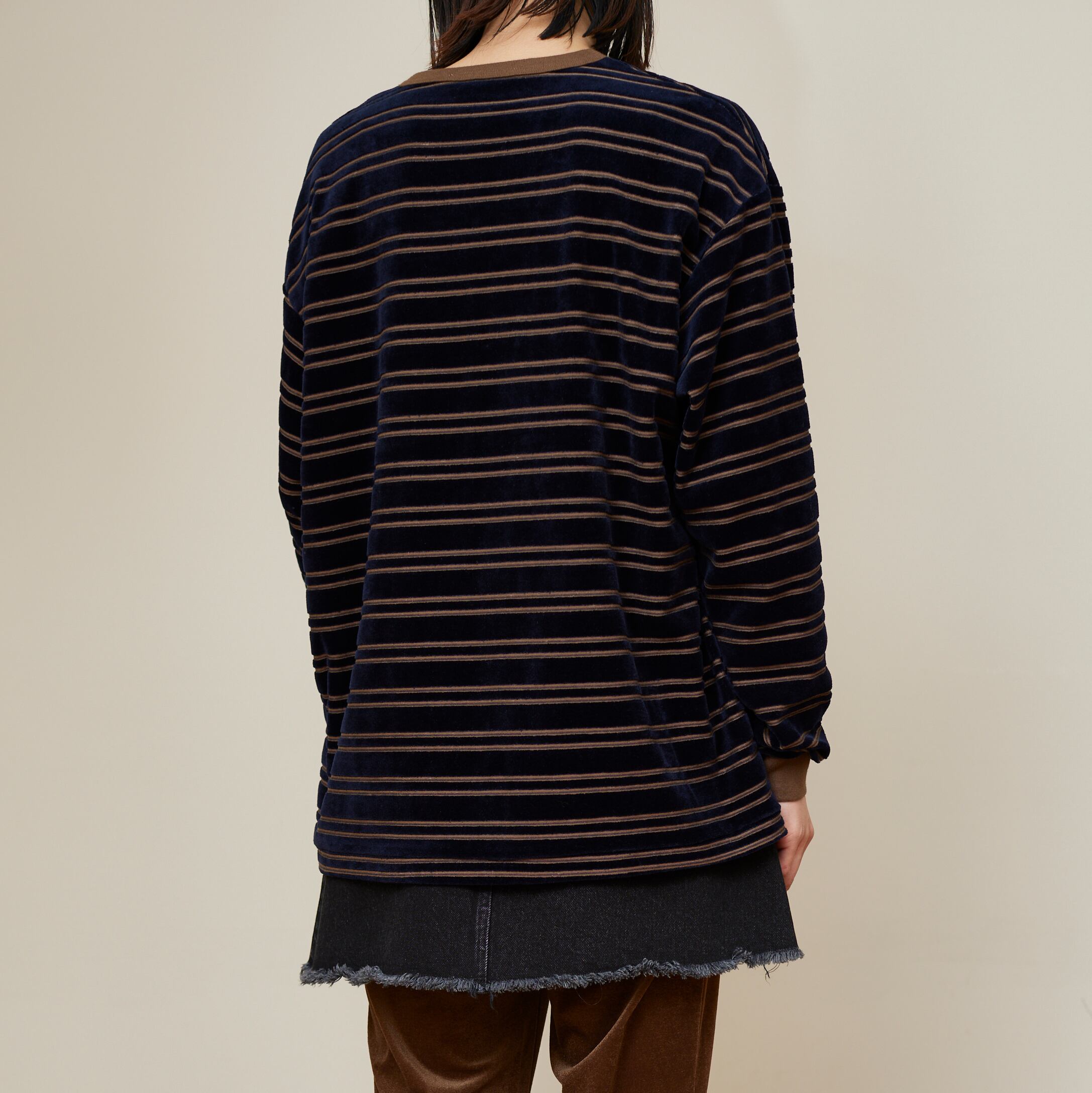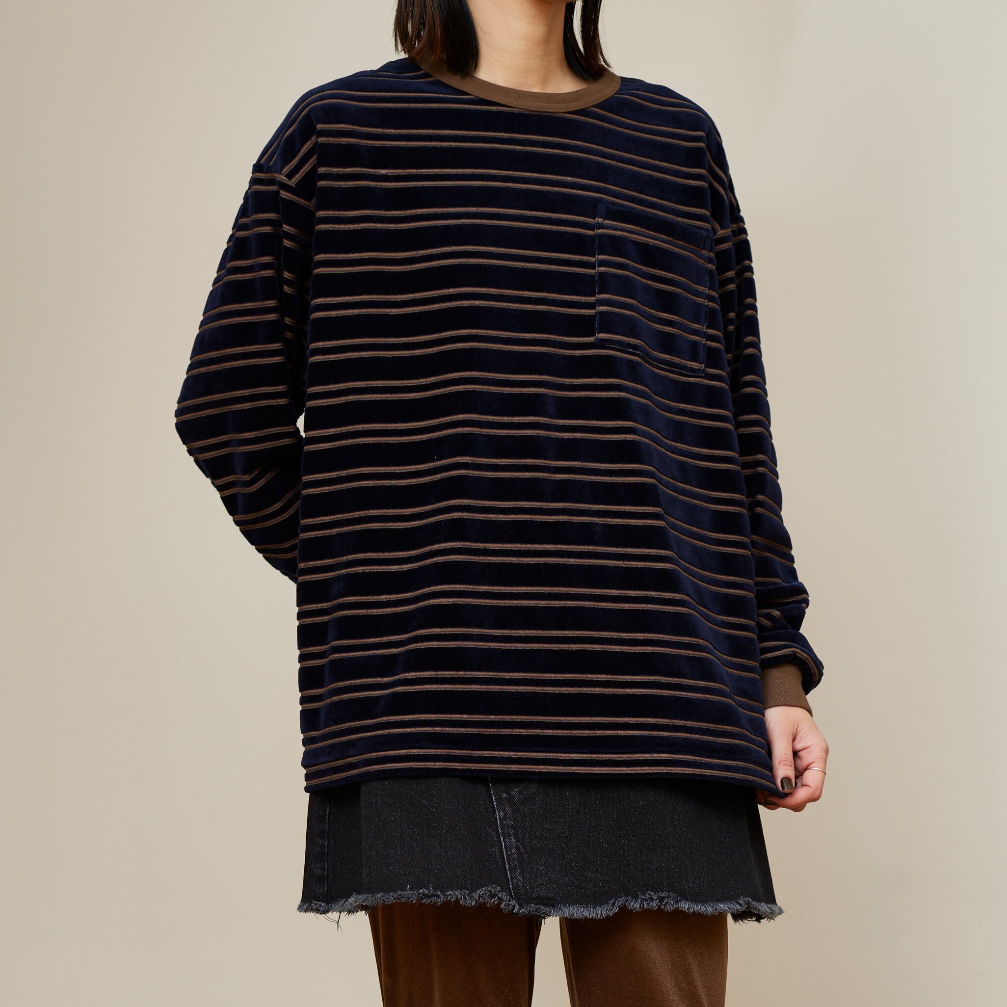リラックス感のあるボクシーなシルエットのベロアボーダーのロングスリーブTシャツ。