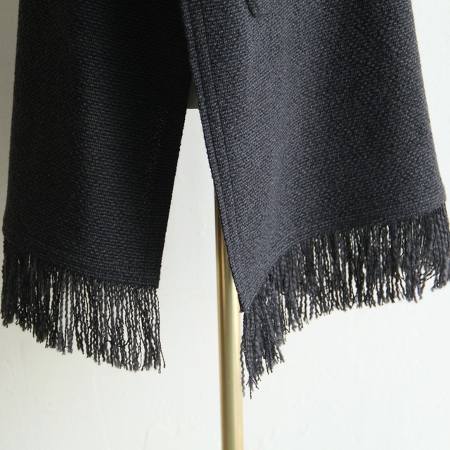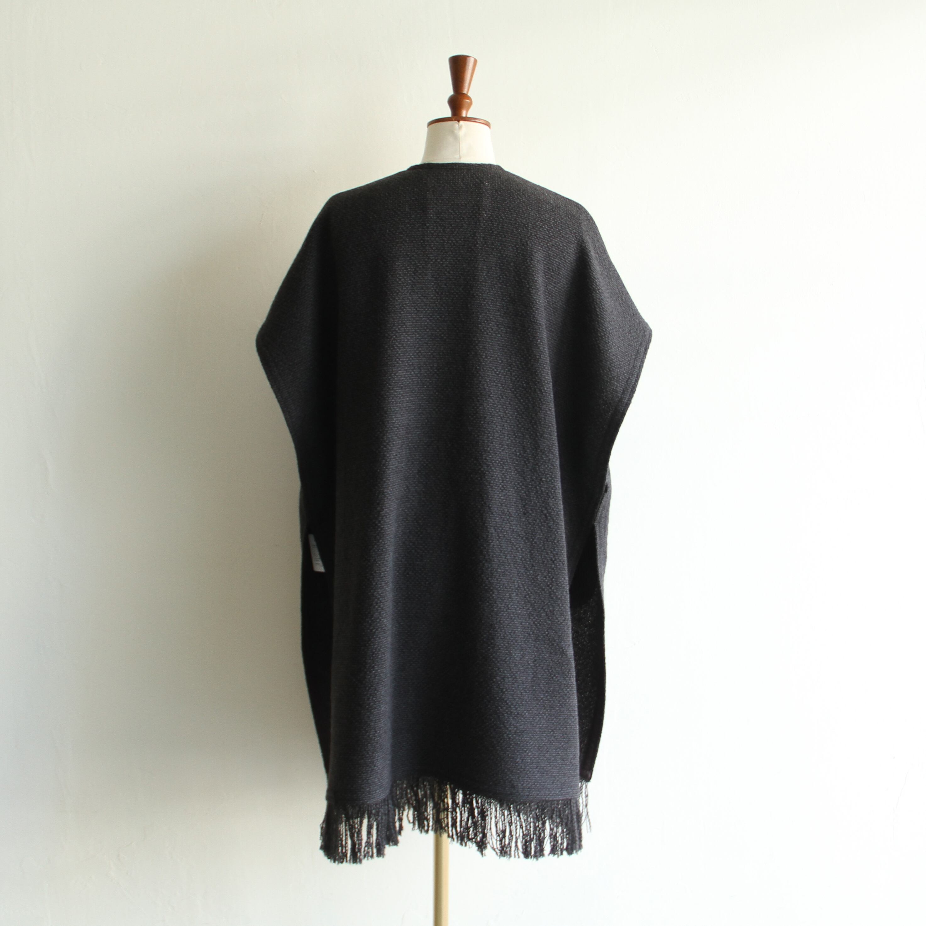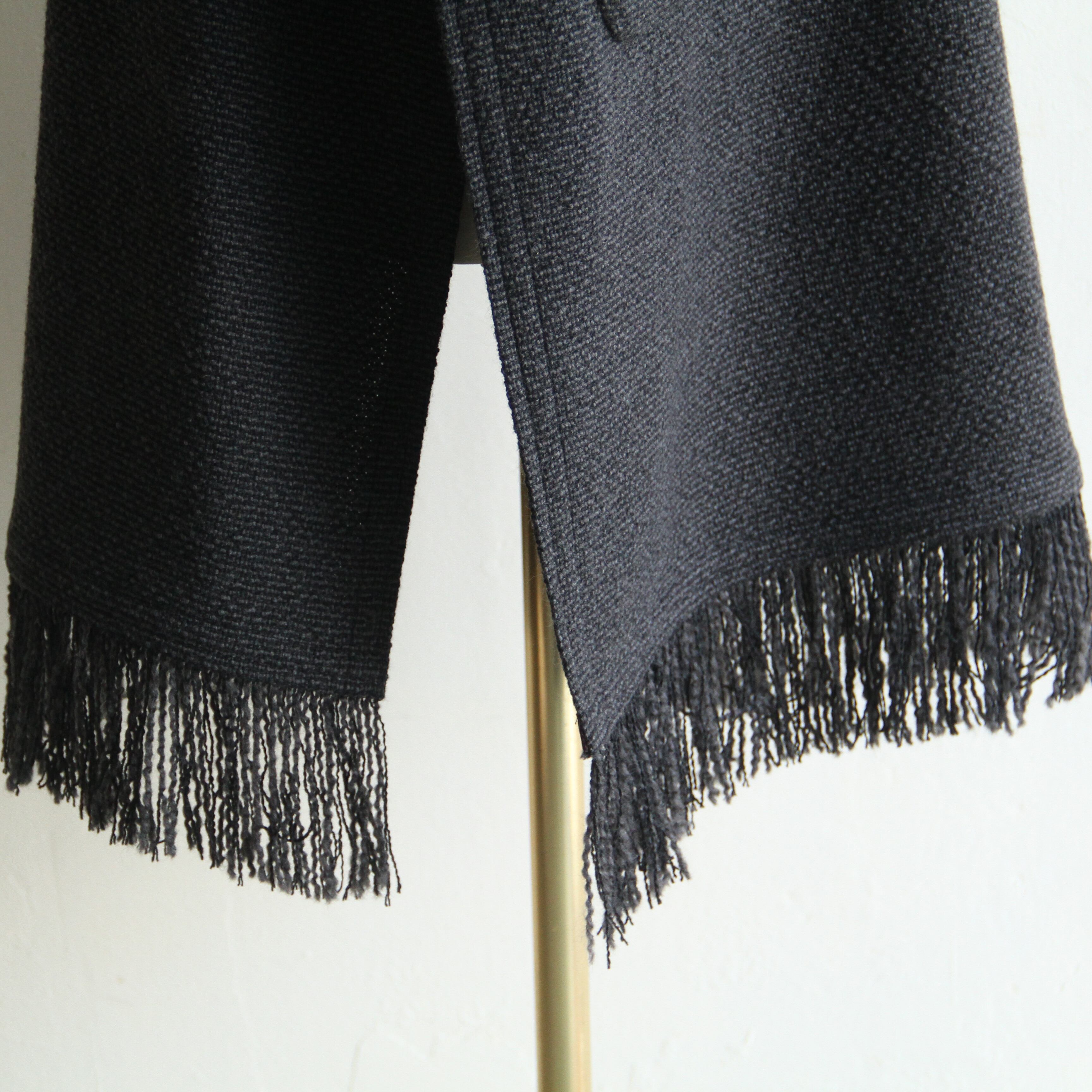 ラグをイメージして経糸に太番と細番を交互に織り、伸縮で凸凹感を出しネップ感が強調された素材を使用したケープ。