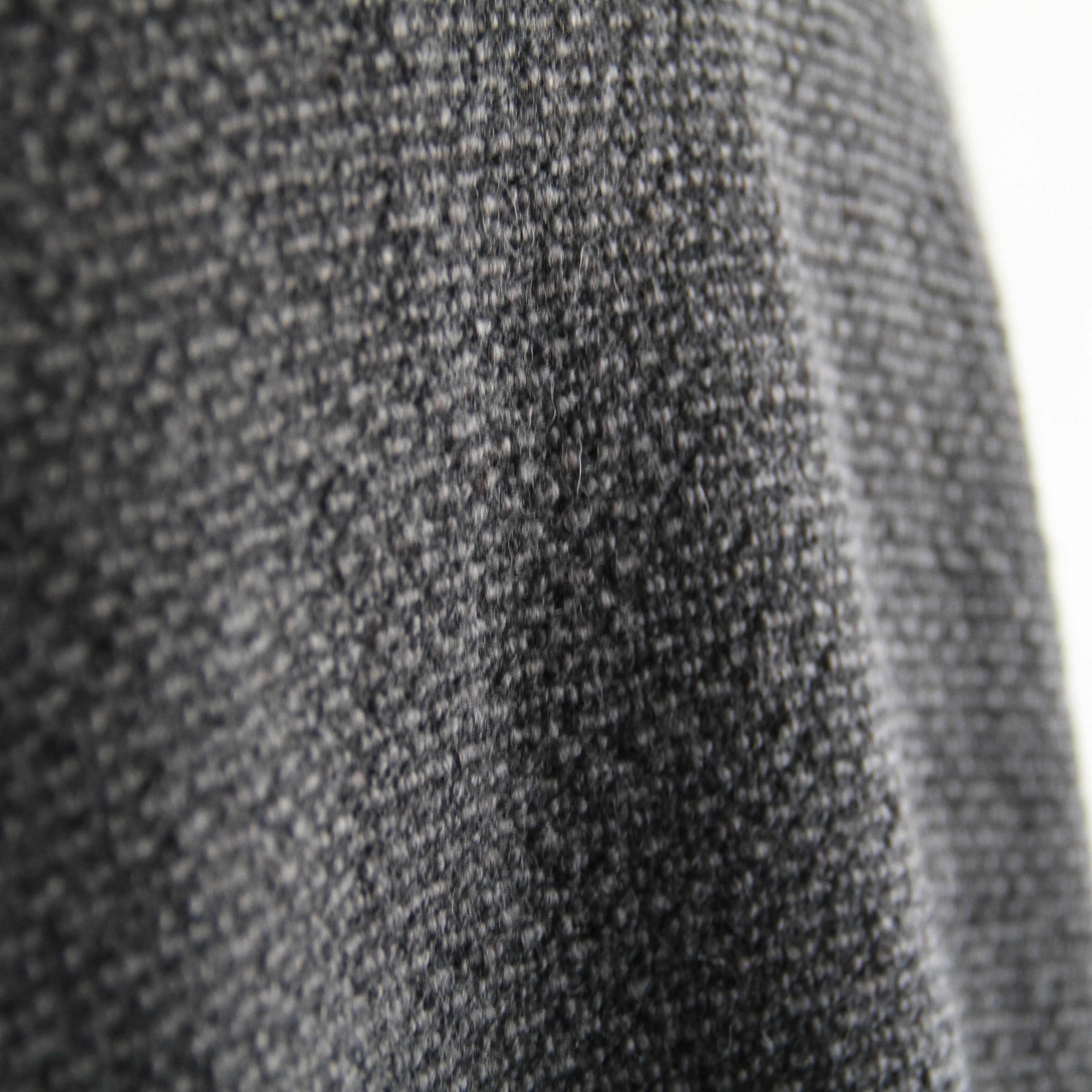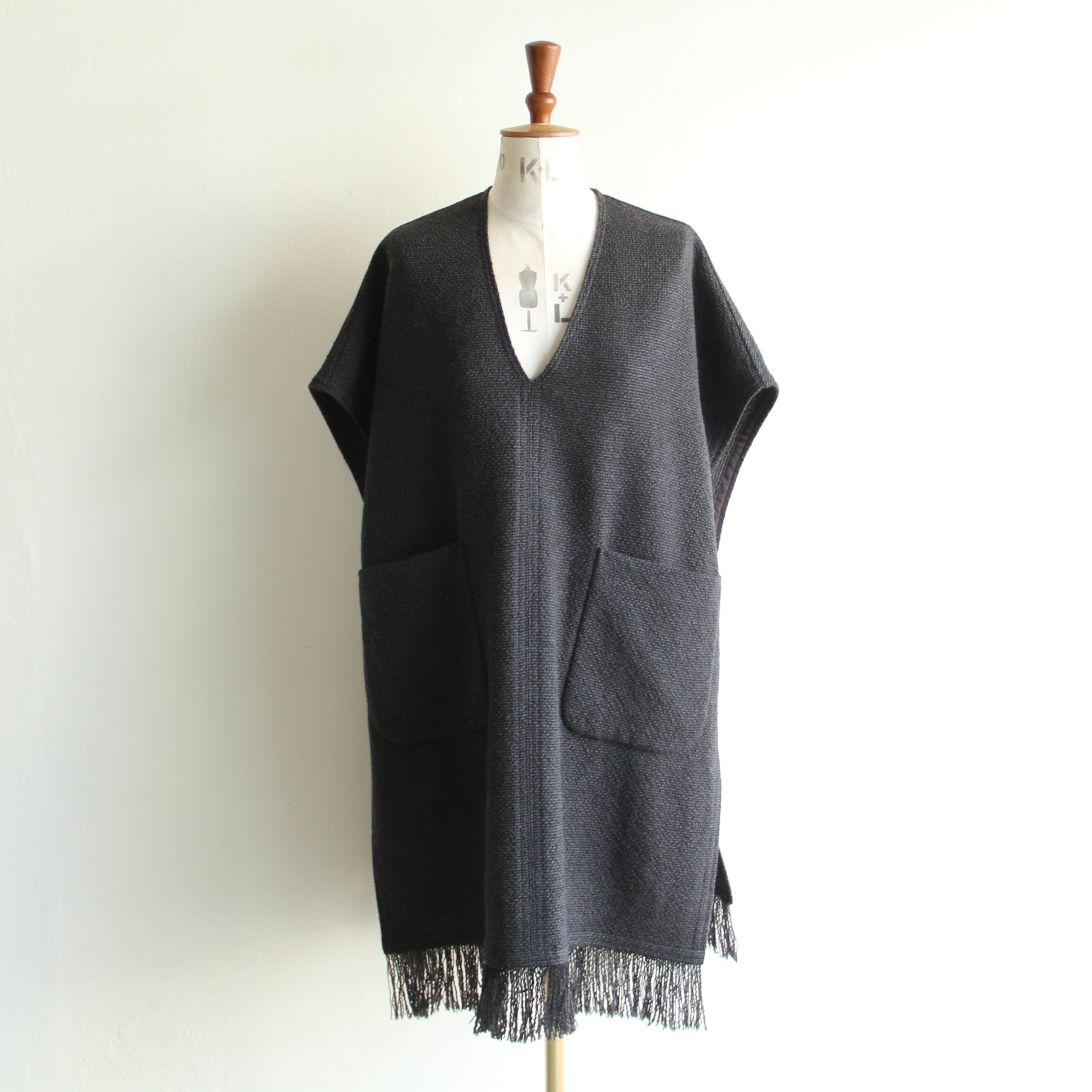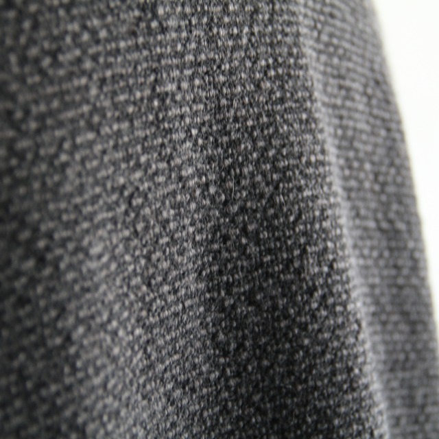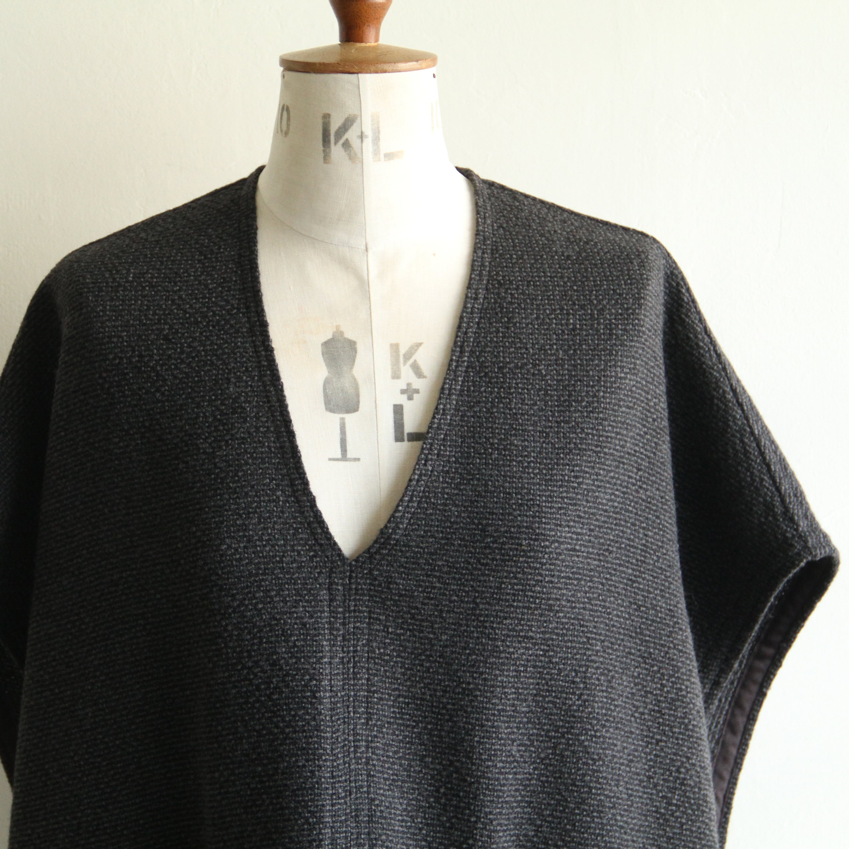 ラグをイメージして経糸に太番と細番を交互に織り、伸縮で凸凹感を出しネップ感が強調された素材を使用したケープ。