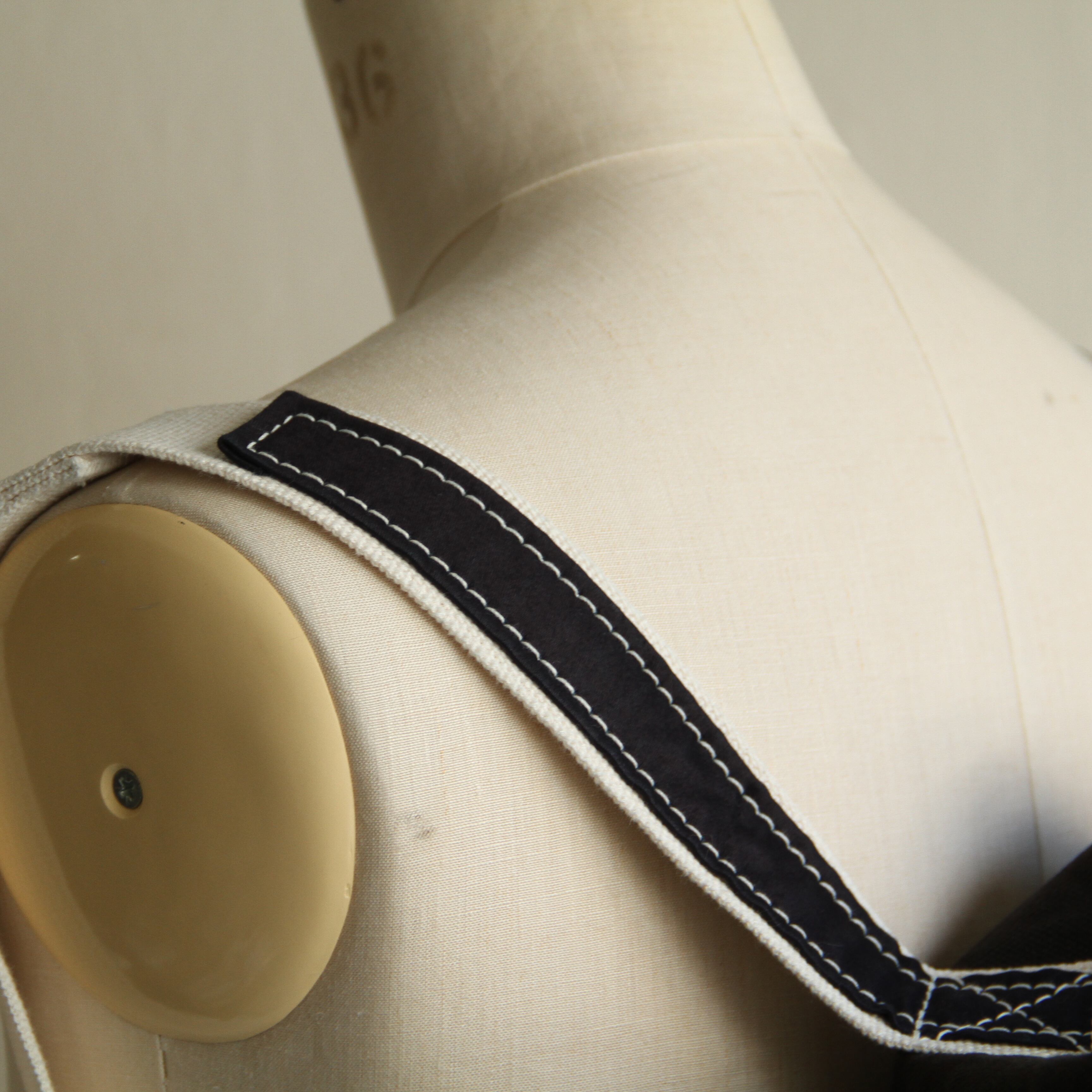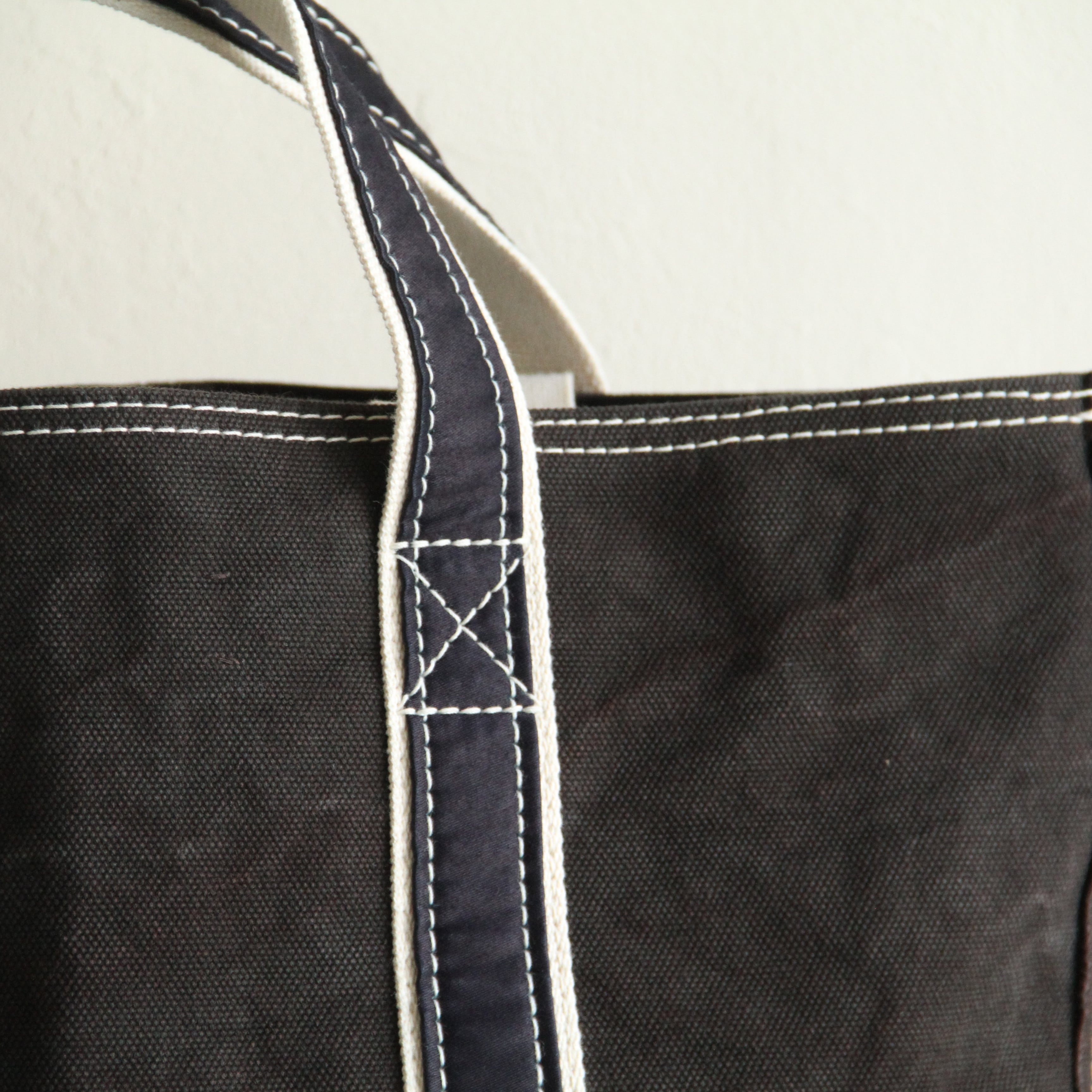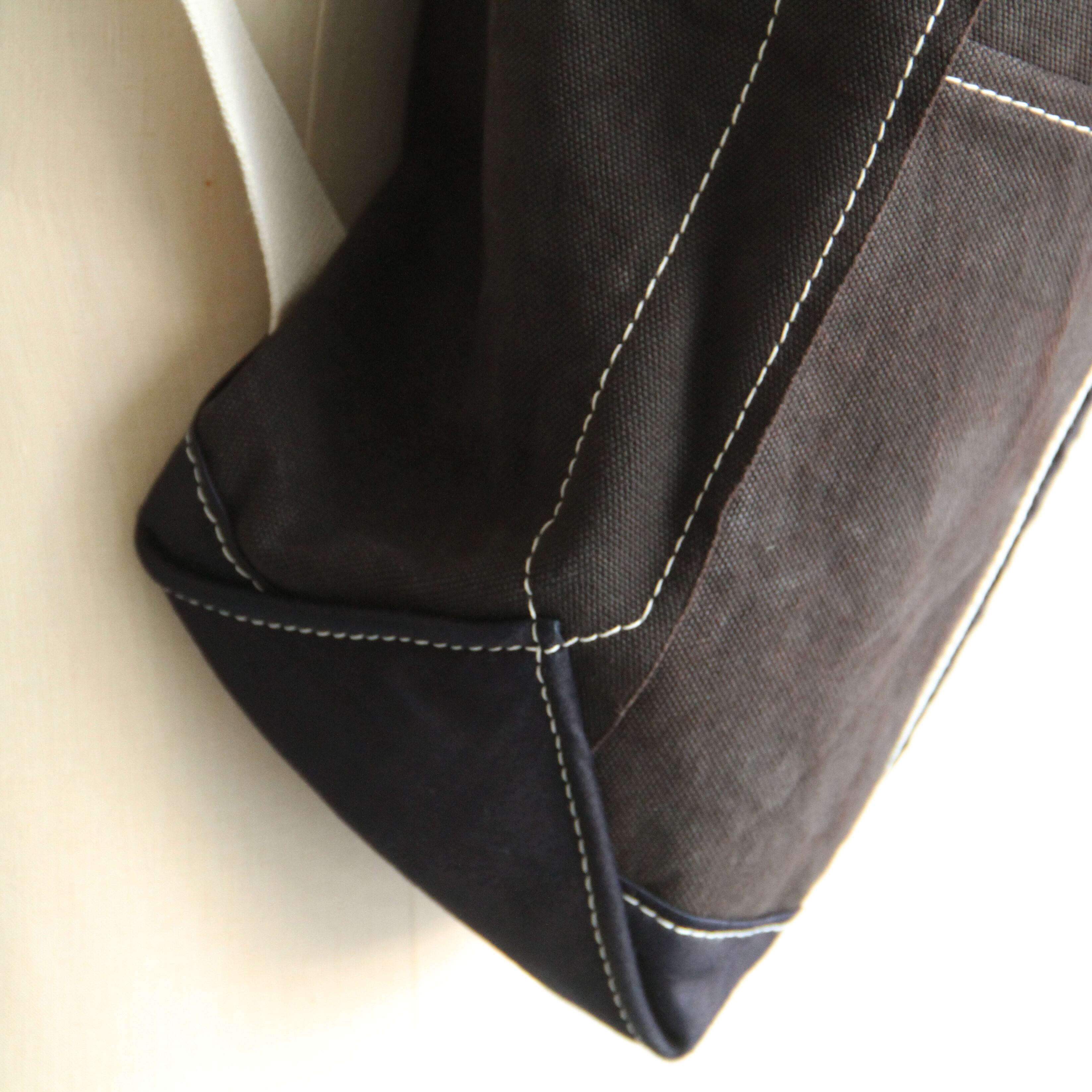 ベースの4号帆布を手染めでインディゴ染を施し、outil素材とコンビで使用。