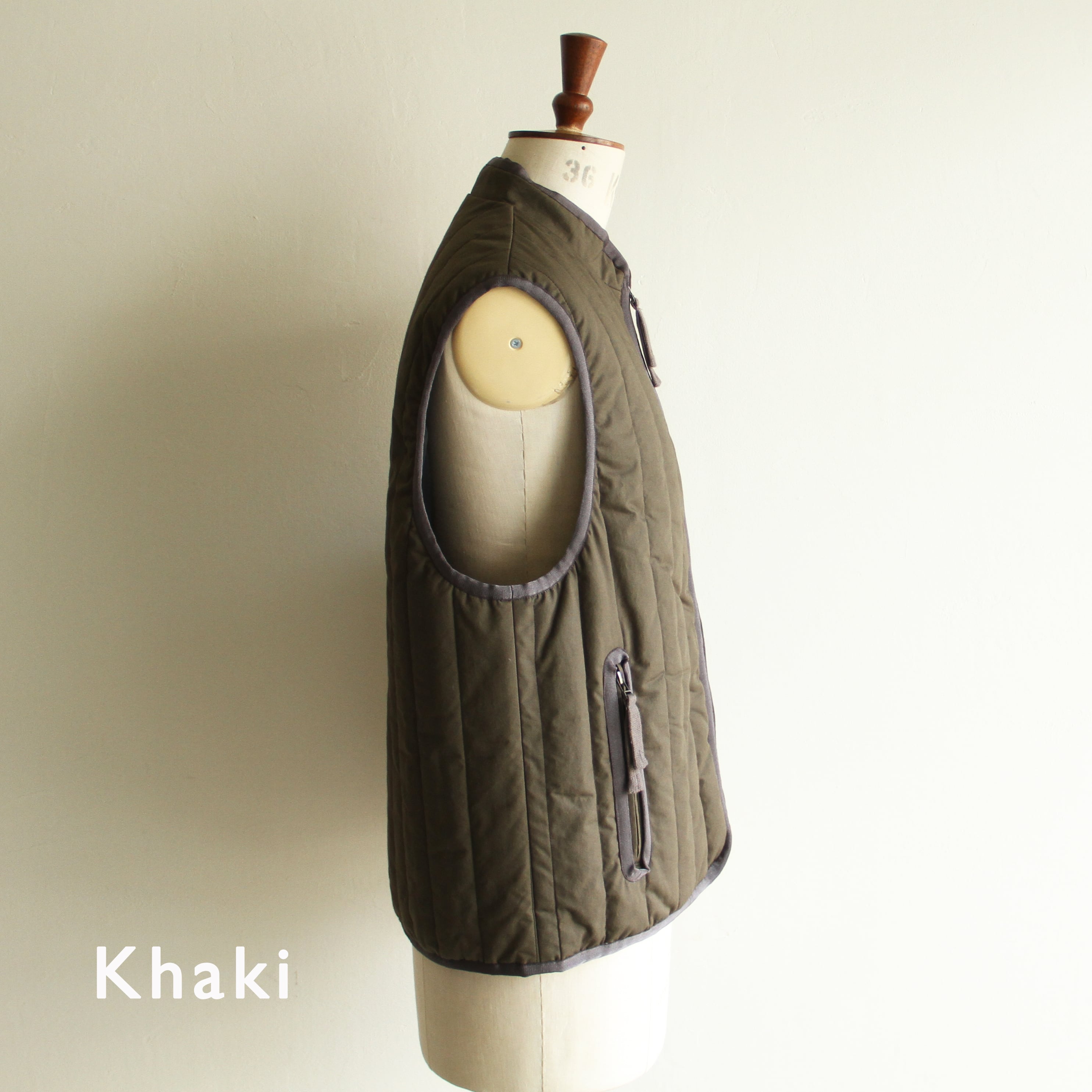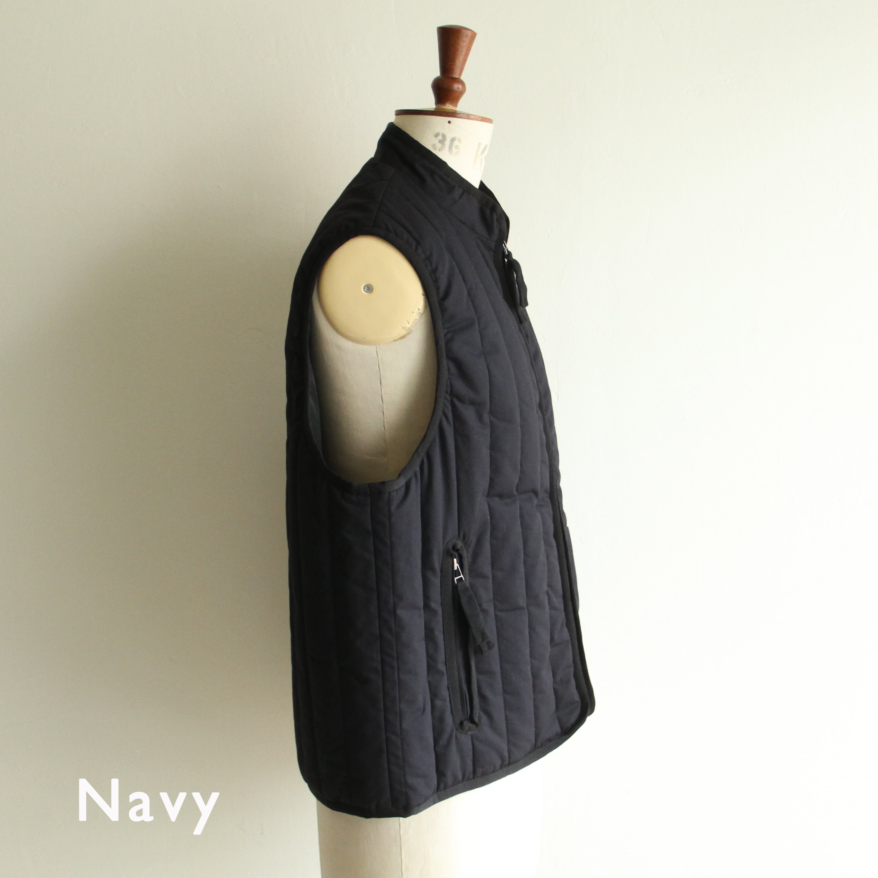 縦キルティングステッチを採用したベストは、随所にバインダーテープを施したデザインが特徴的で、秋季にはアウターとして、冬季にはアウターの内外どちらにも着用できる非常に利便性の高いアイテムです。