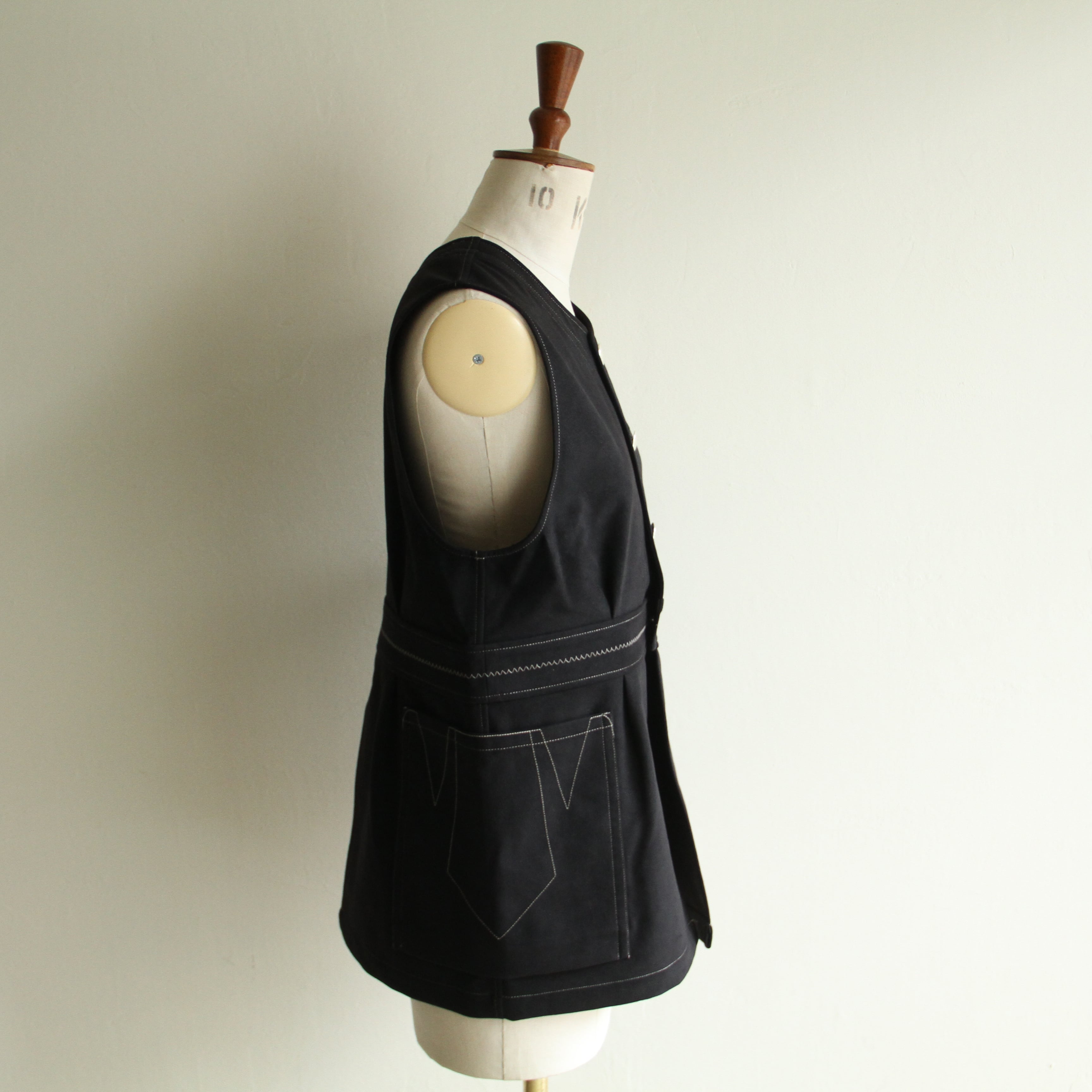 丈の短いニットやアウターの中に合わせてベストの裾を出して重ね着するのもおすすめです。大きなポケットはバッグがわりになるぐらい、大容量です。