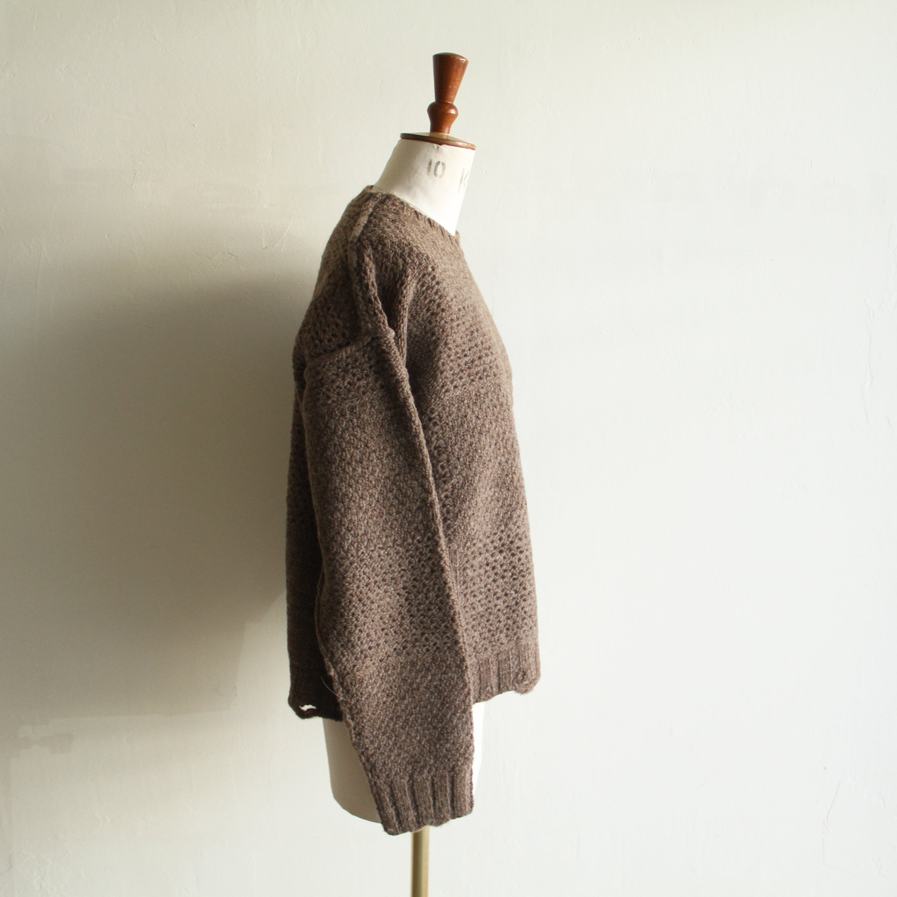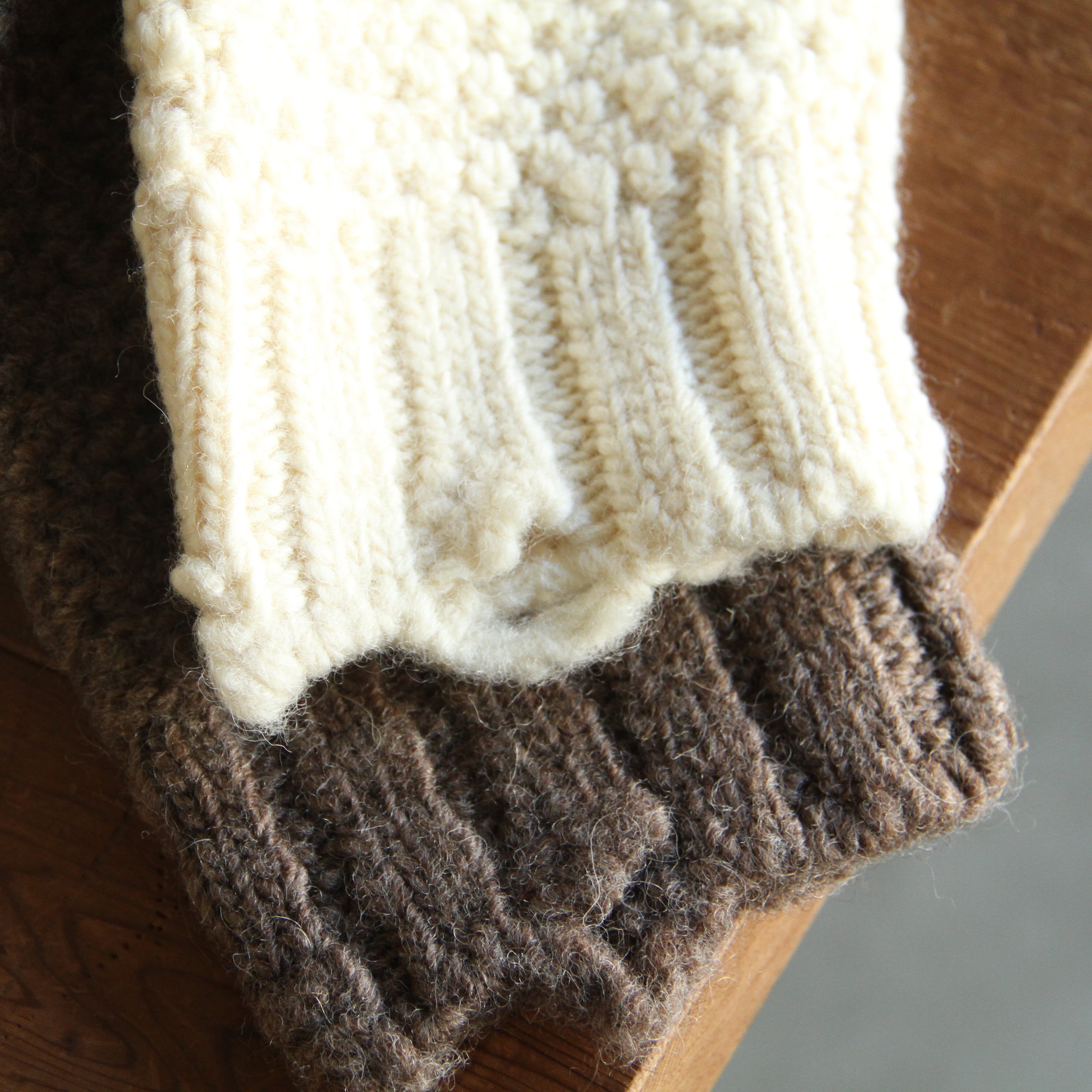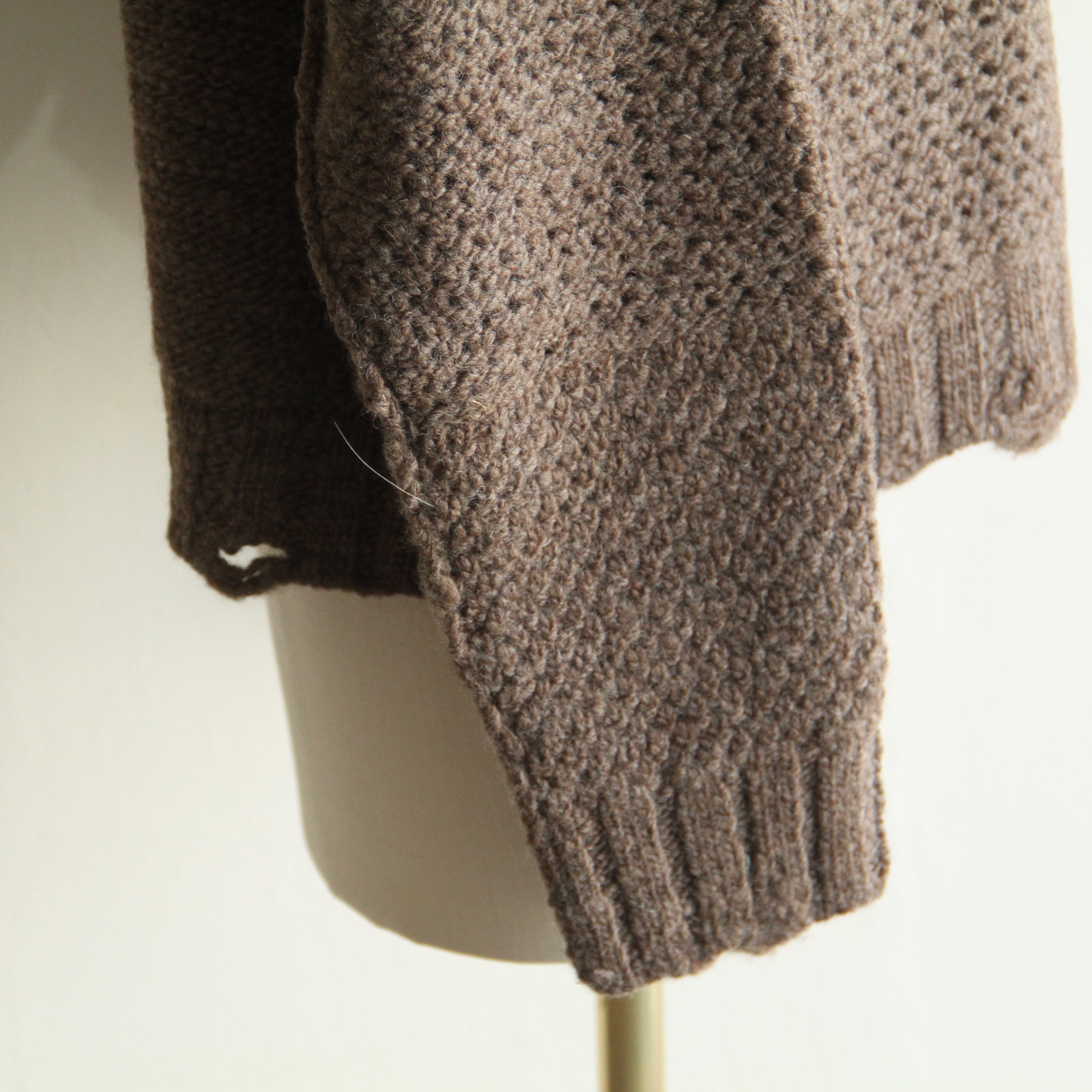袖口や裾にはダメージ加工を施し、着古したような表情を演出。素材にはウルグアイ産の天然色羊毛スラブヤーンを使用しており、染料や助剤を一切使わず羊毛本来のナチュラルな色合いや風合いを最大限に活かしたアイテムです。