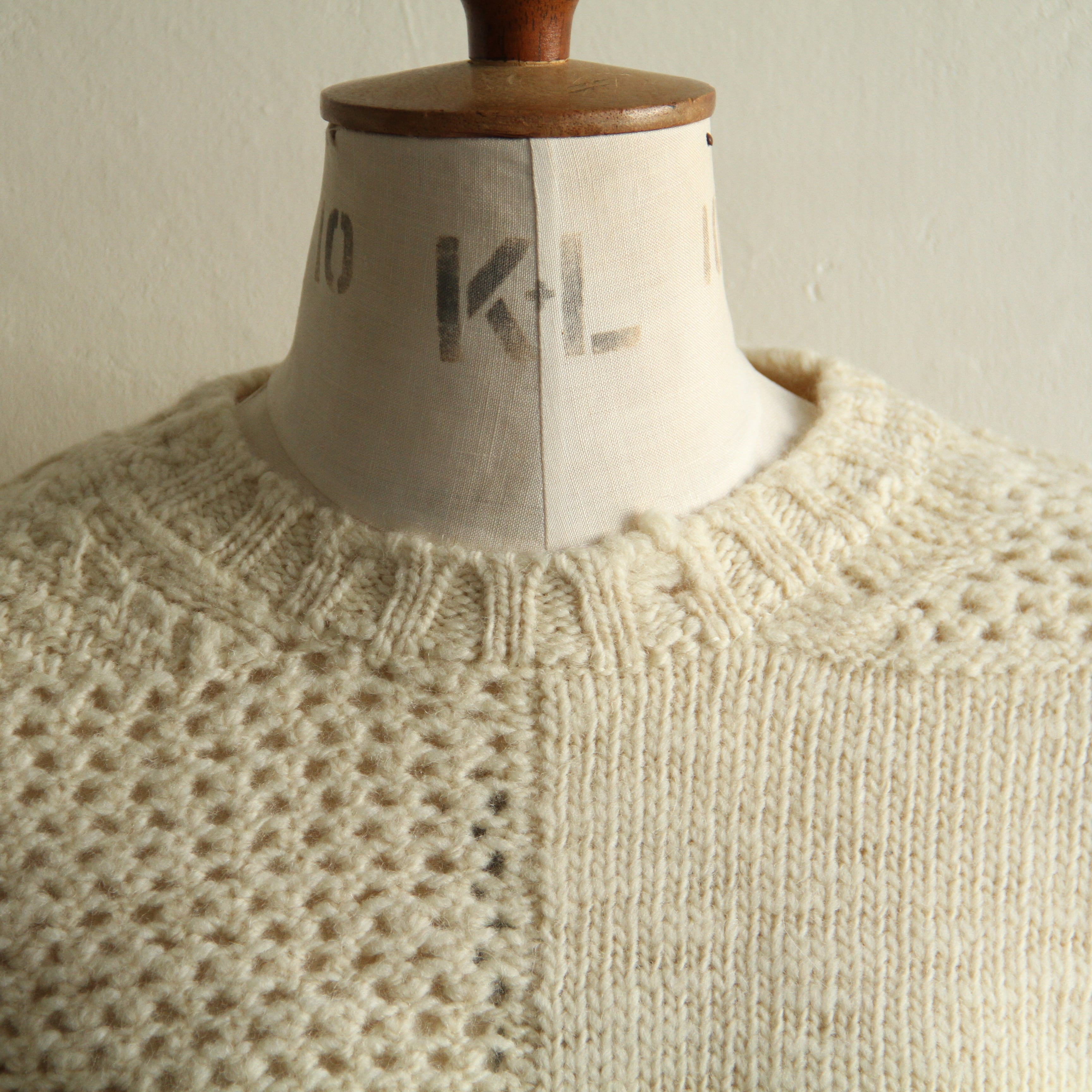 表編み、裏編み、透かし編みを組み合わせたパッチワーク切り替えのプルオーバーセーター。