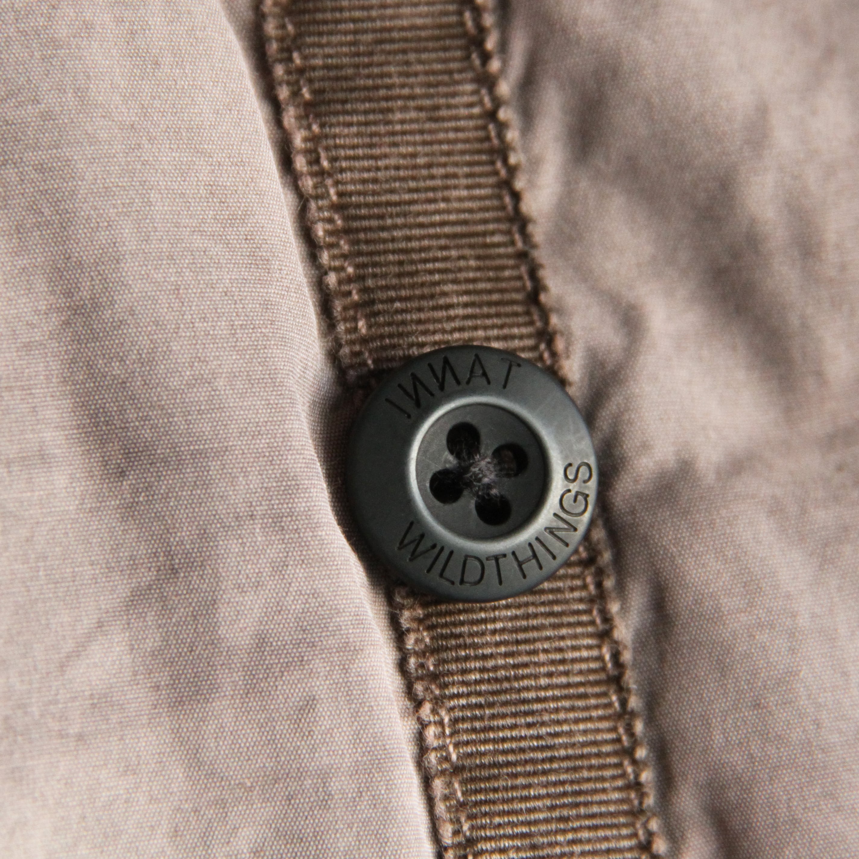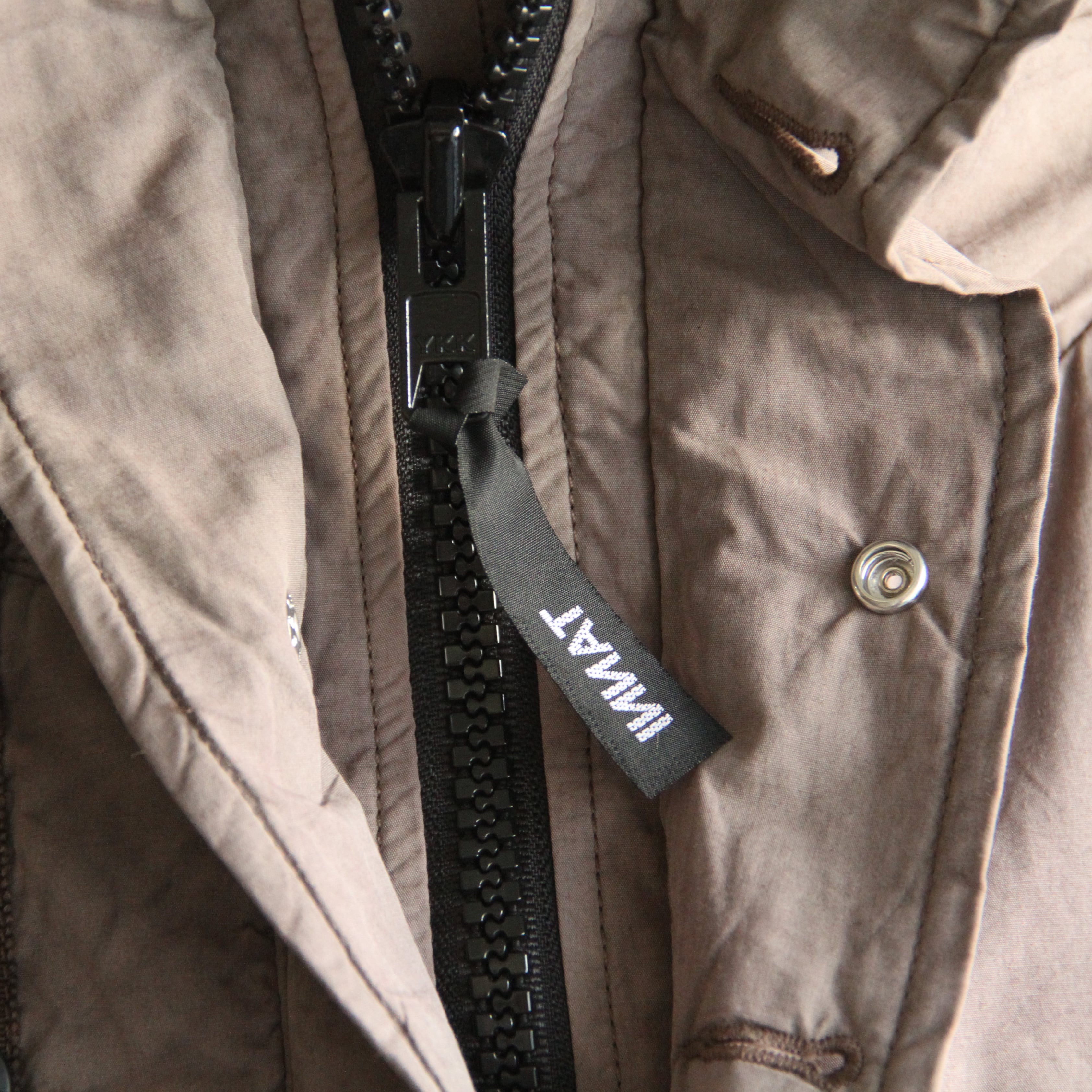 大きめのフードは衿部分に収納できる2WAY仕様にアップデート。収納時の後ろ衿にはINNATのブランドコンセプトを刺繍で表現しています。また、フィッシングジャケットのように後丈を調整できるドットボタン仕様を追加し、前立てにはボタンホールとボタンを配することで、ファスナーとボタンの両方で着方を調整可能に。さらに背面には大きなゲームポケットを配置し、デザインのアクセントとしています。