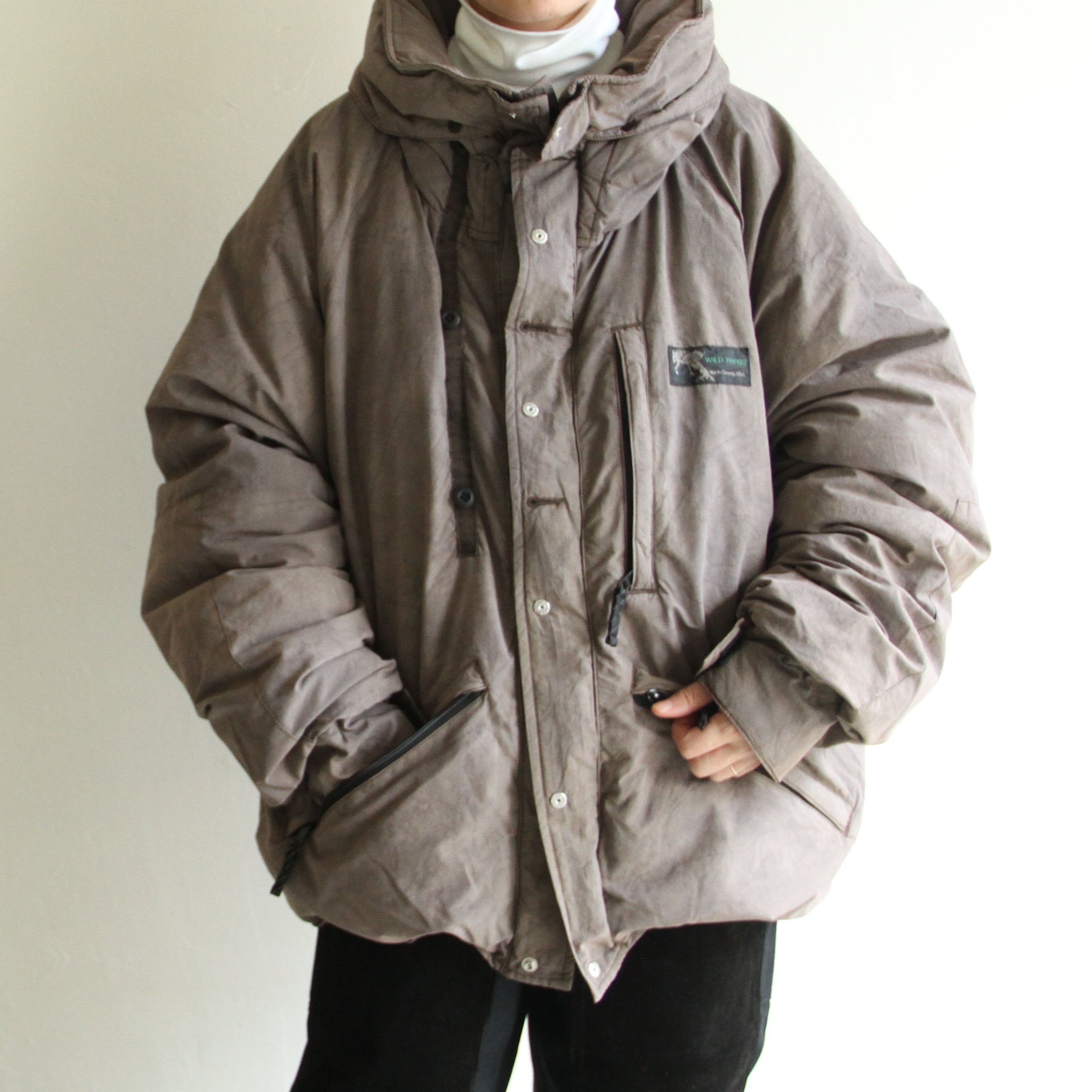 WILD THINGSのアーカイブ「MAKALU JACKET」をベースに、INNAT独自の解釈を加えて再構築したダウンジャケット。胸元のWILD CAT旧ロゴネームや、丸みを帯びたシルエットによるレトロアウトドアな雰囲気はそのままに、全体のボリューム感を調整しています。