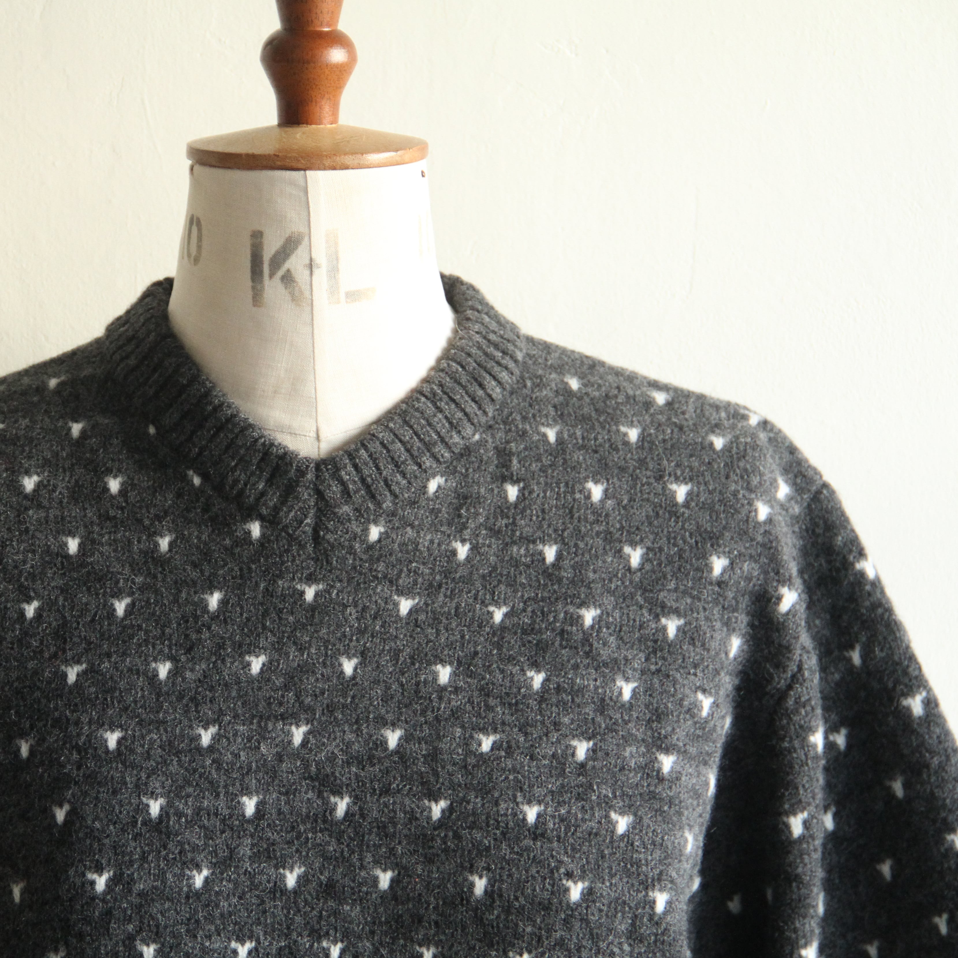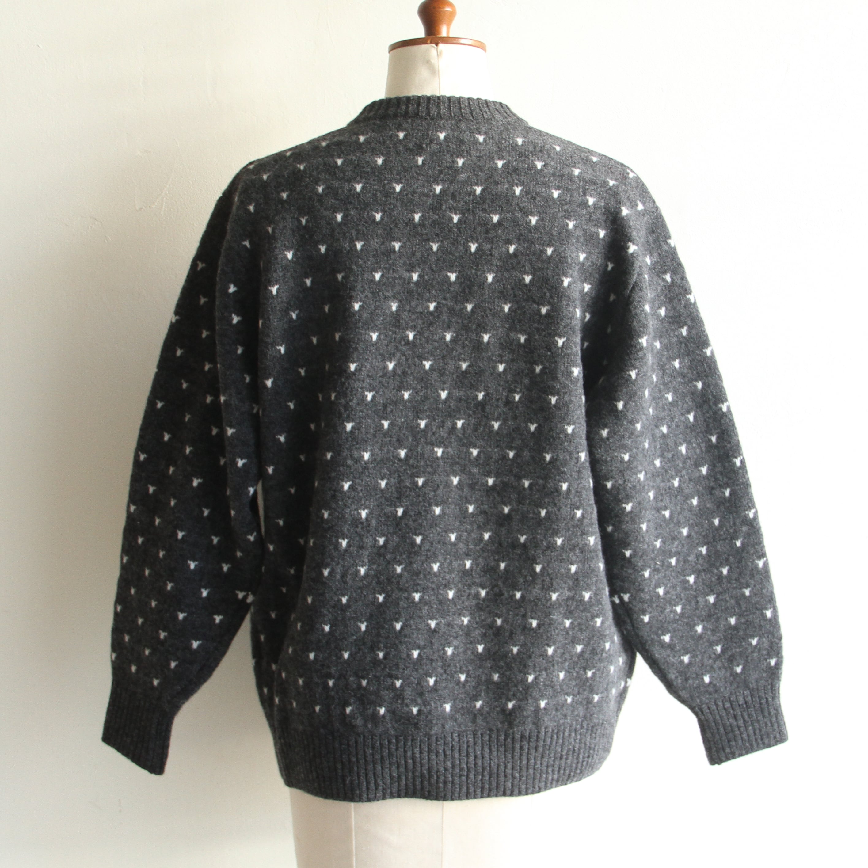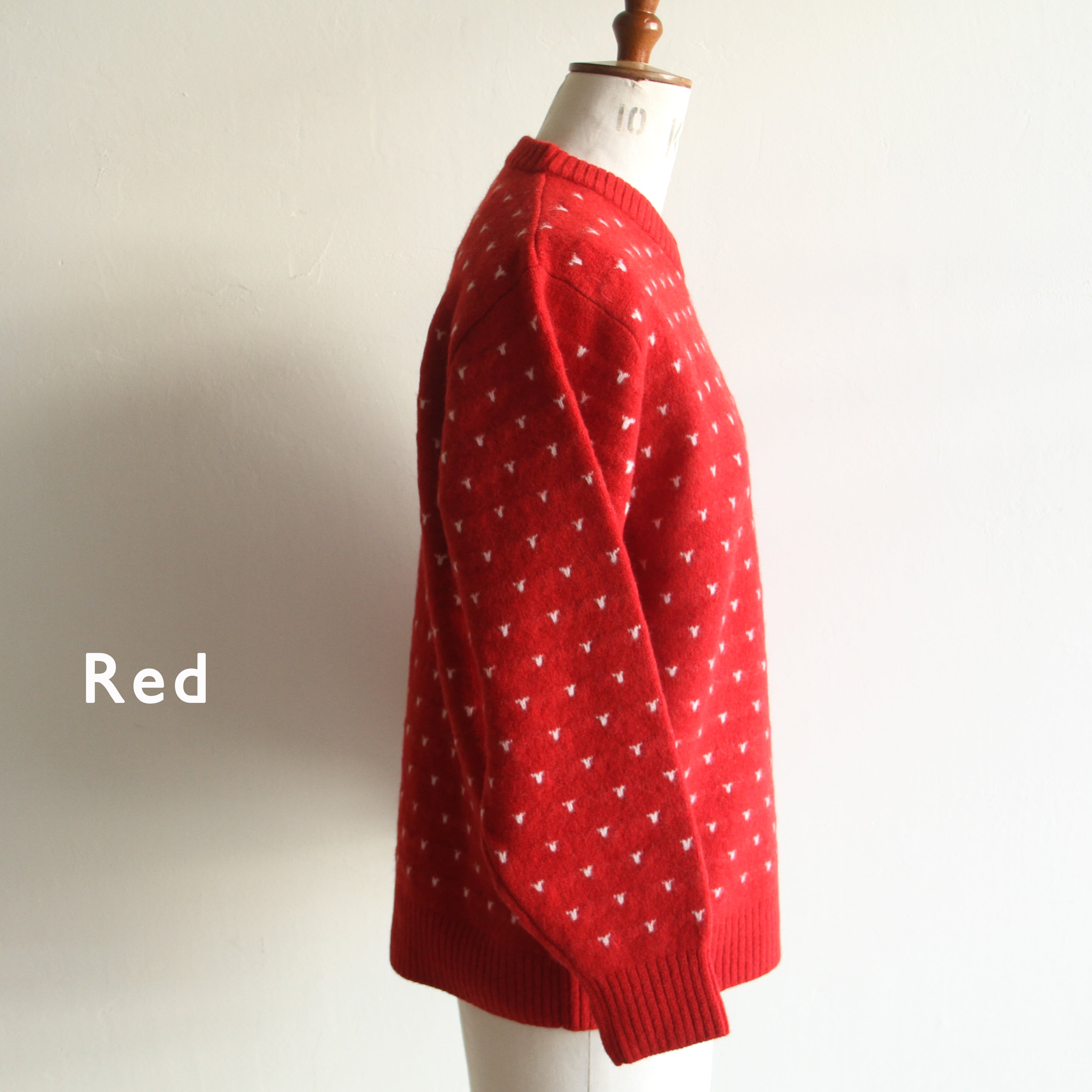 シングルジャガードで比較的薄く編んだニットで、素材はメリノ種と英国羊毛種を掛け合わせたカムバックラム種のウール100%です。