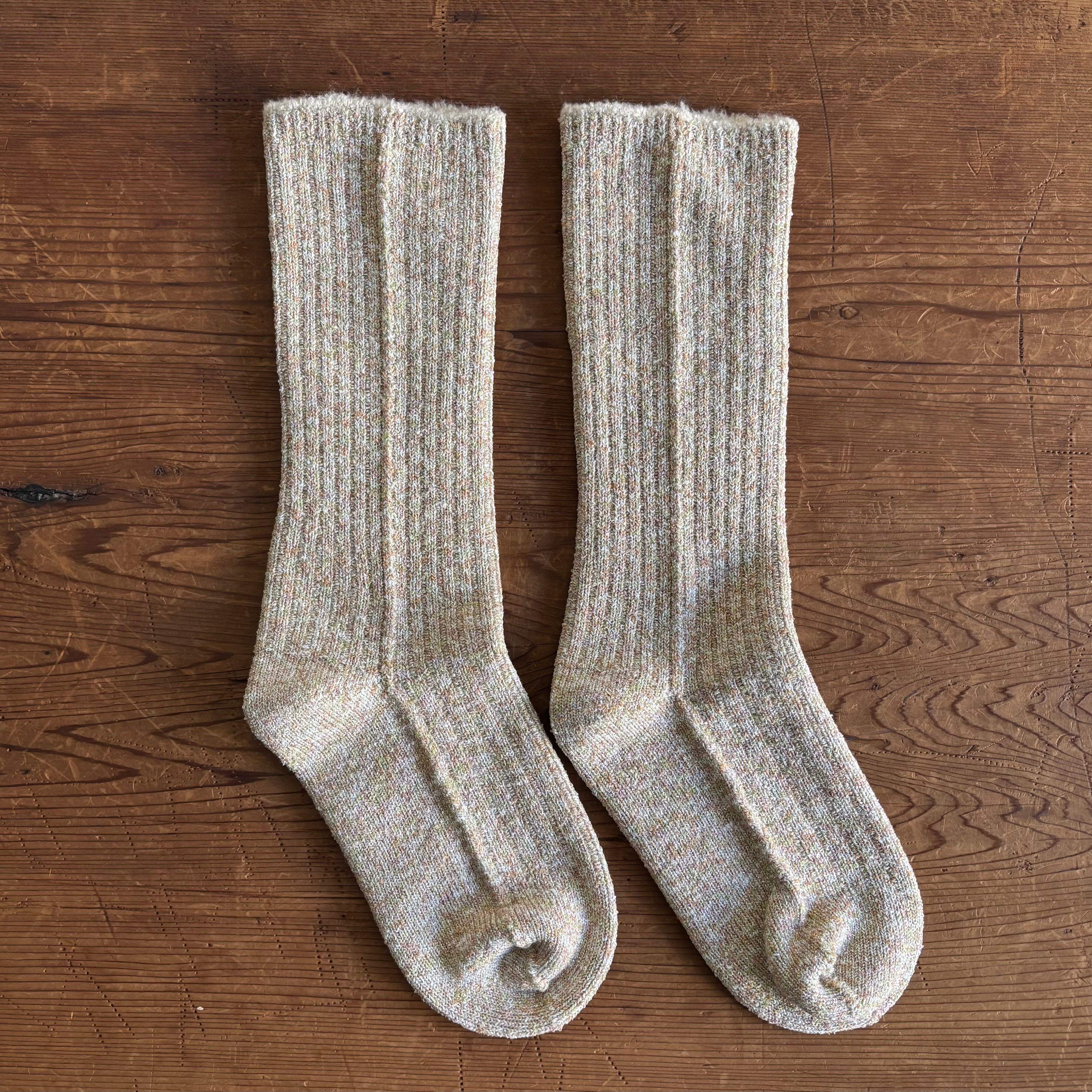 綿100%の糸を引き揃える事でラメの輝きは程よく残して吸水効果を上げました。履いた後の湿りも気にならず通年履いていただけます。ラメ主張の強すぎない糸ですので様々なスタイルにお合わせください。