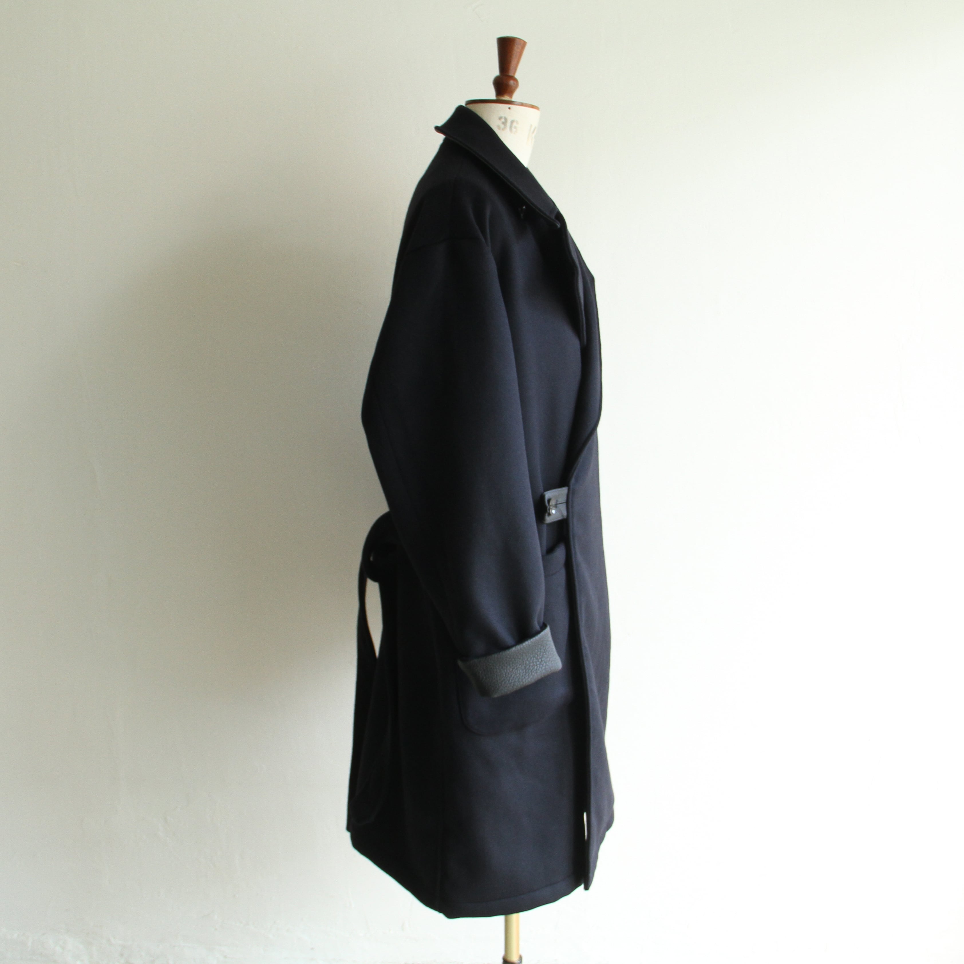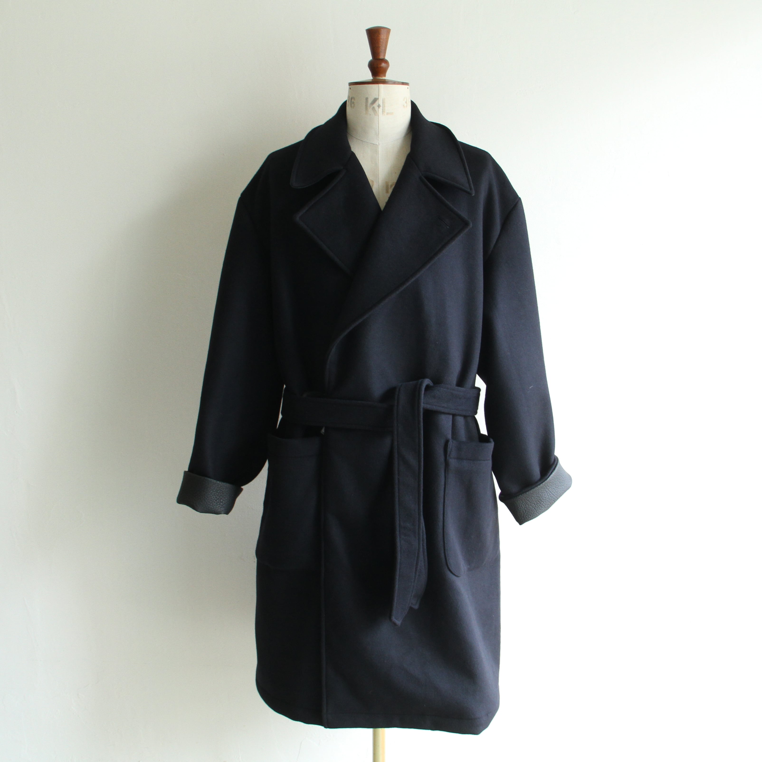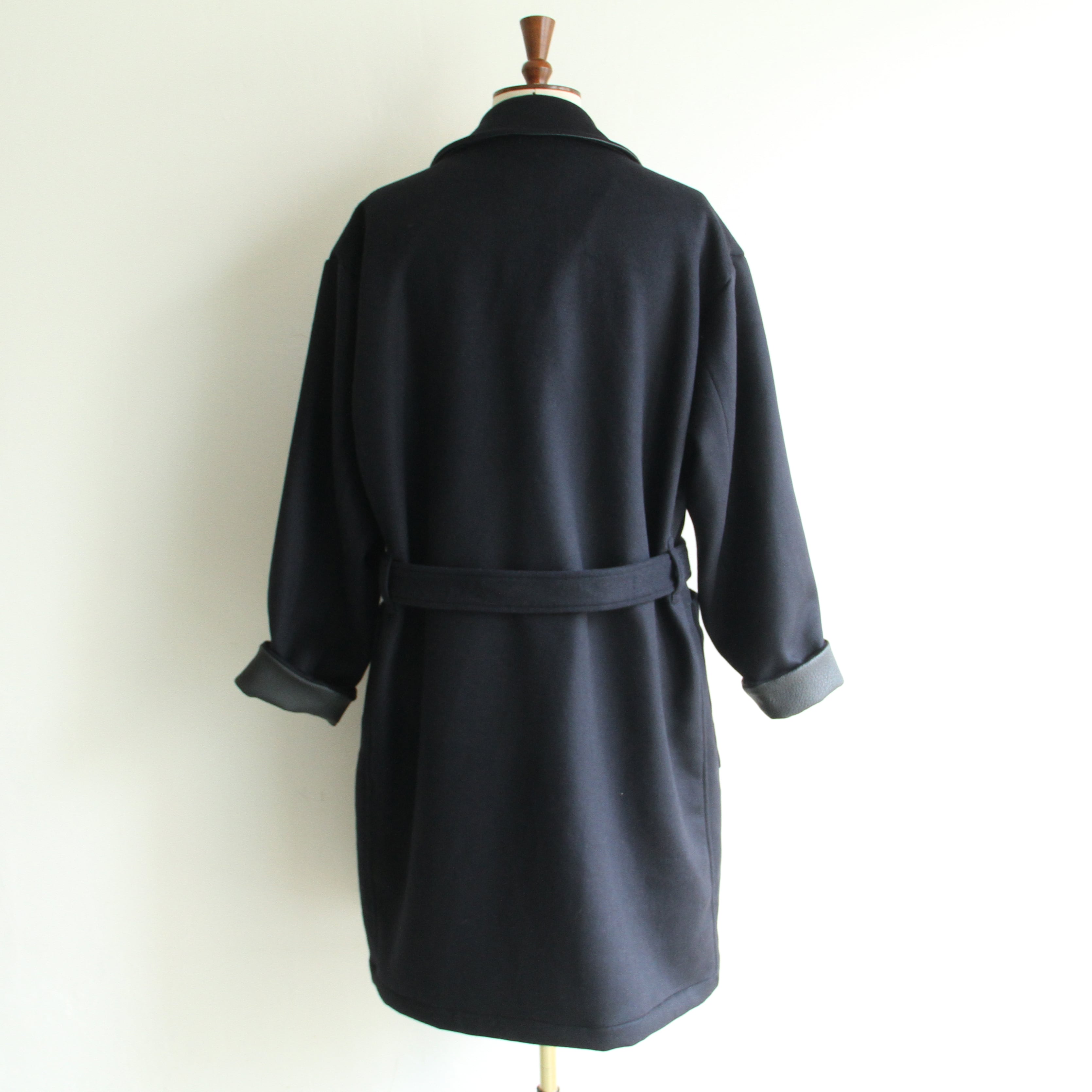 ルックでも二人のモデルに2通りのコーディネイトをいたしました。大きめな襟、ダブルの前見頃の大分量を生かした動きのあるラフな着こなし、そしてすべてのボタンを閉めかっちりまとめるとミリタリーを思わせる端正な顔立ちとなります。ウエストを止めるレザーダブはエルメス傘下のタンナー、デュピュイ社カーフを使用。
