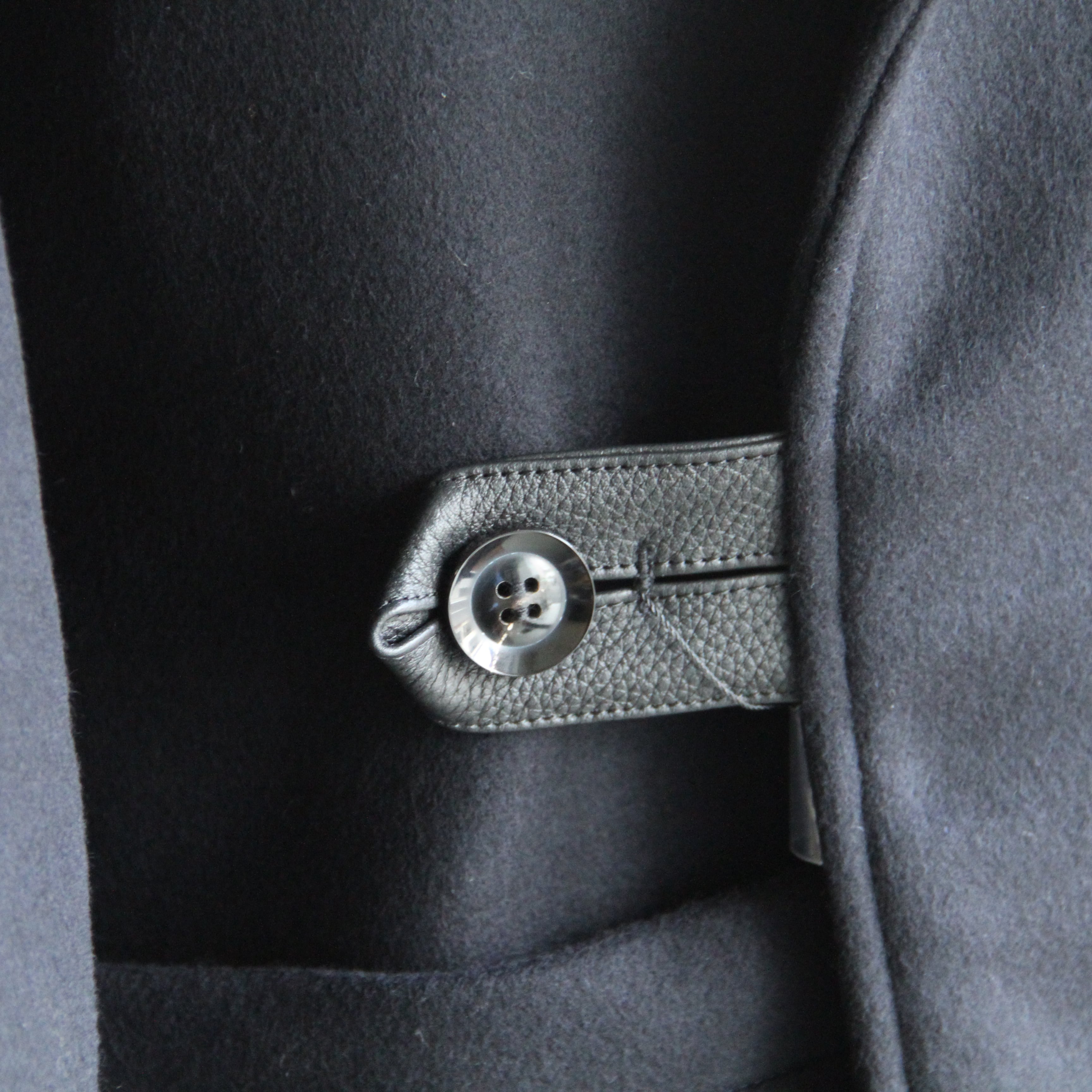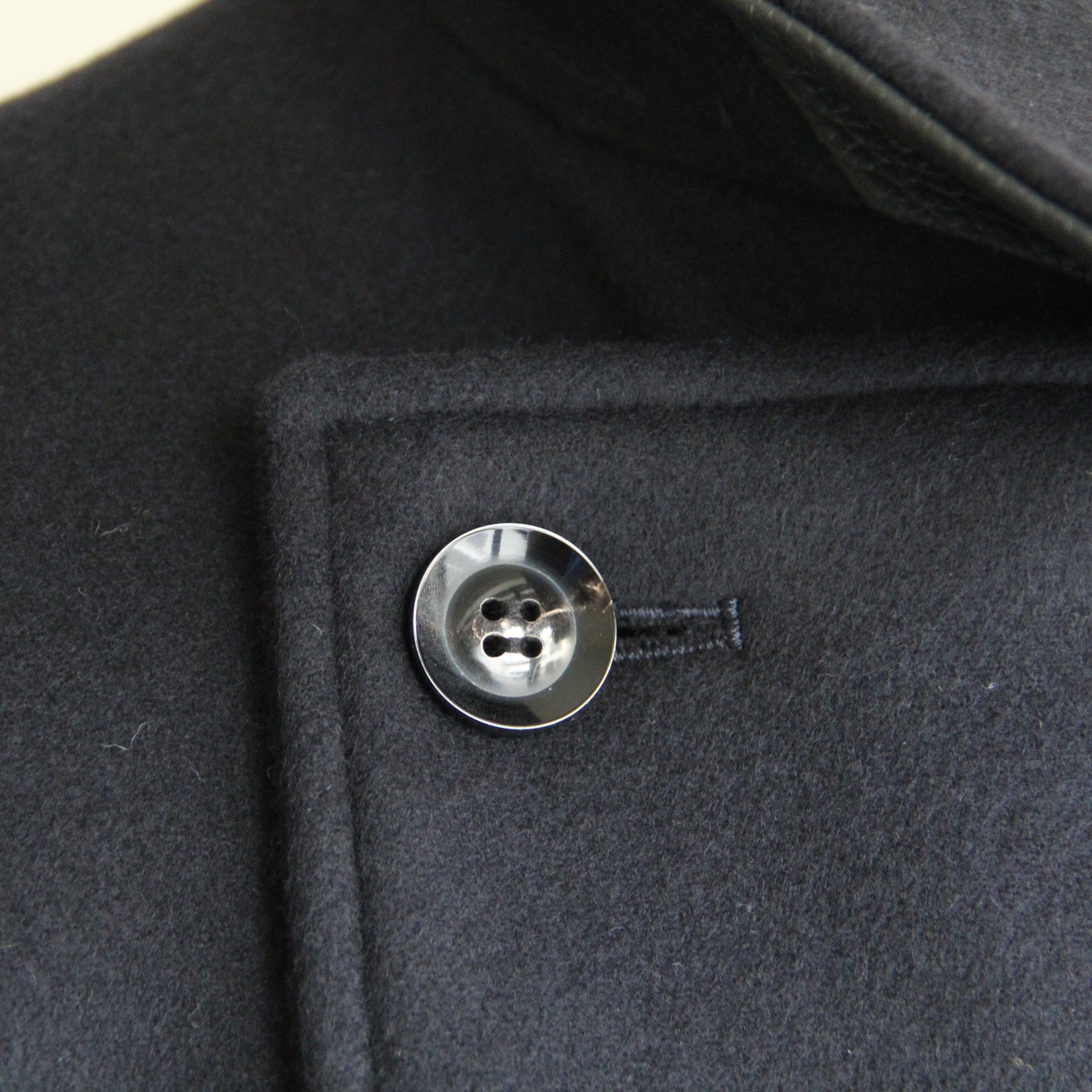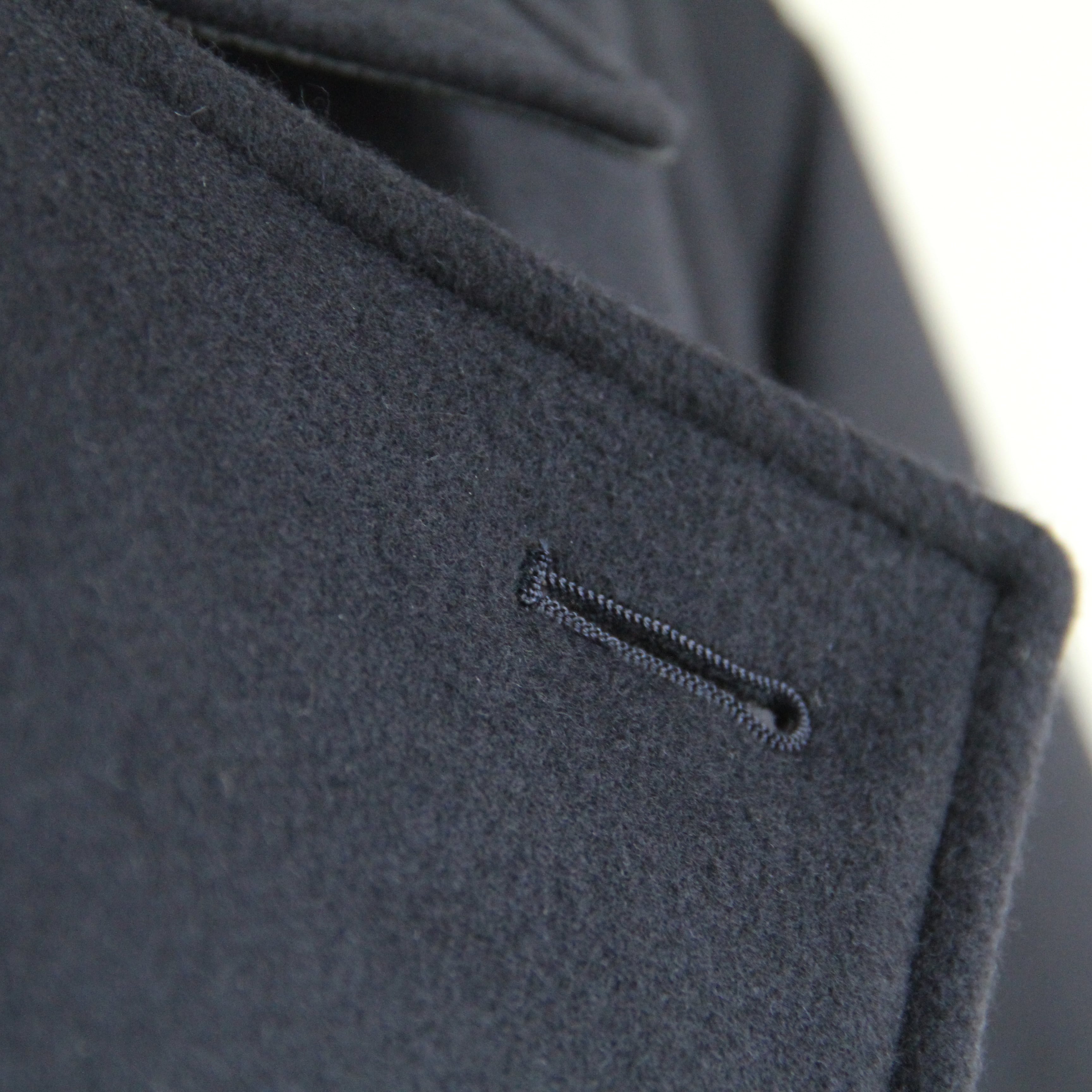 テキスタイル・・・史上最もエレガントなアメリカ海軍メルトンを目指し、辿り着いたのがこのスーパ-160’SウールxカシミアxビキューナのMIXであった。高級獣毛だけではキューティクルが足らず糸が絡まないのでコシの強さが出ず、マニッシュなアウターとしては優しすぎる顔になってしまう。そこでスーパー原料としては最高位の160’Sにカシミアと幻のヴィキューナのミックスにより適度な縮絨感と光沢、しっとりとしたぬめり感の表現に成功した。