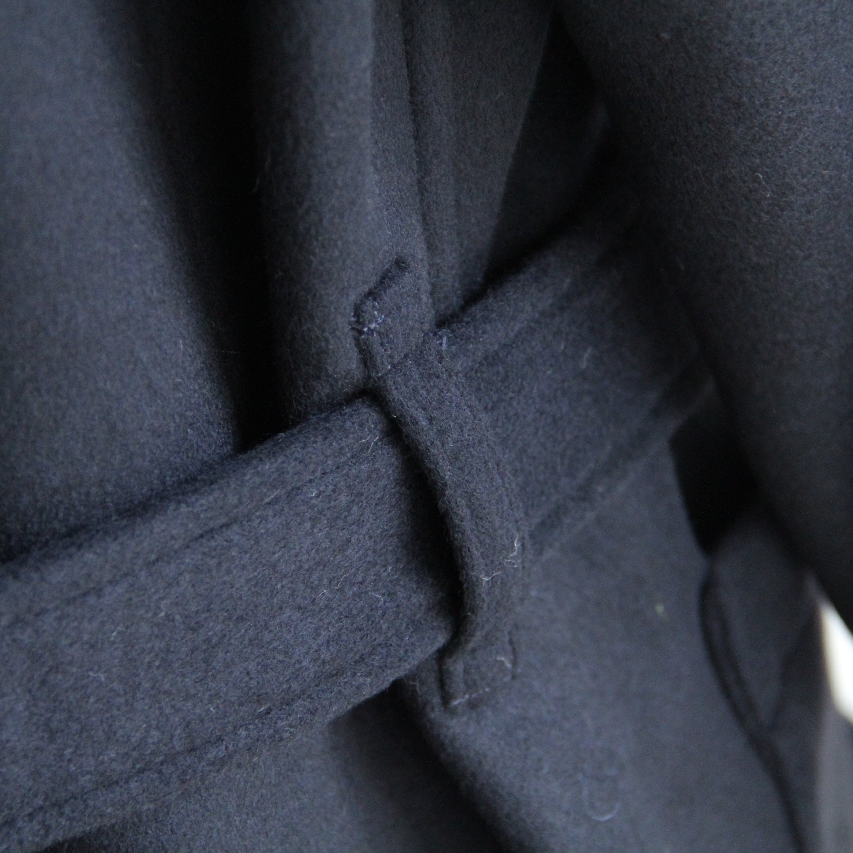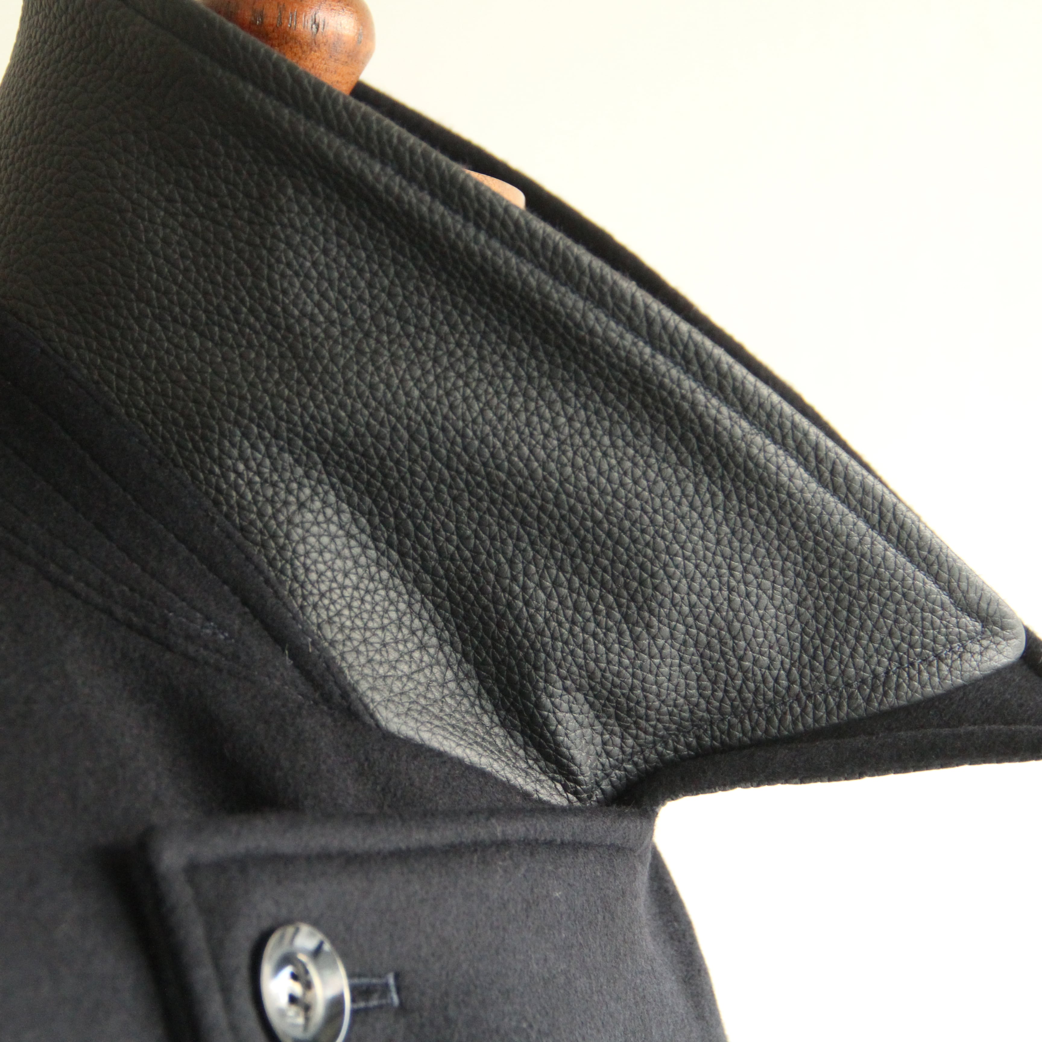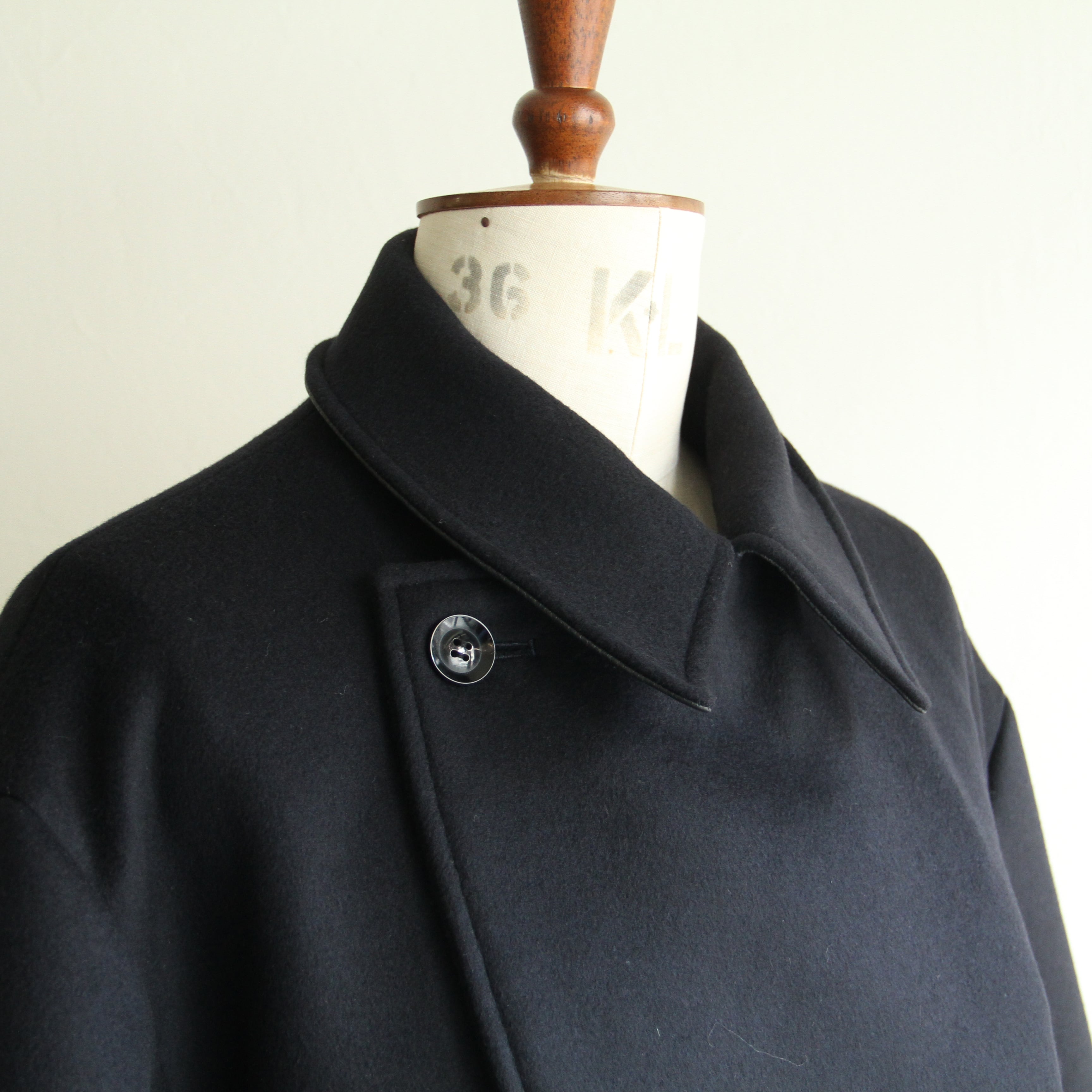 テキスタイル・・・史上最もエレガントなアメリカ海軍メルトンを目指し、辿り着いたのがこのスーパ-160’SウールxカシミアxビキューナのMIXであった。高級獣毛だけではキューティクルが足らず糸が絡まないのでコシの強さが出ず、マニッシュなアウターとしては優しすぎる顔になってしまう。そこでスーパー原料としては最高位の160’Sにカシミアと幻のヴィキューナのミックスにより適度な縮絨感と光沢、しっとりとしたぬめり感の表現に成功した。