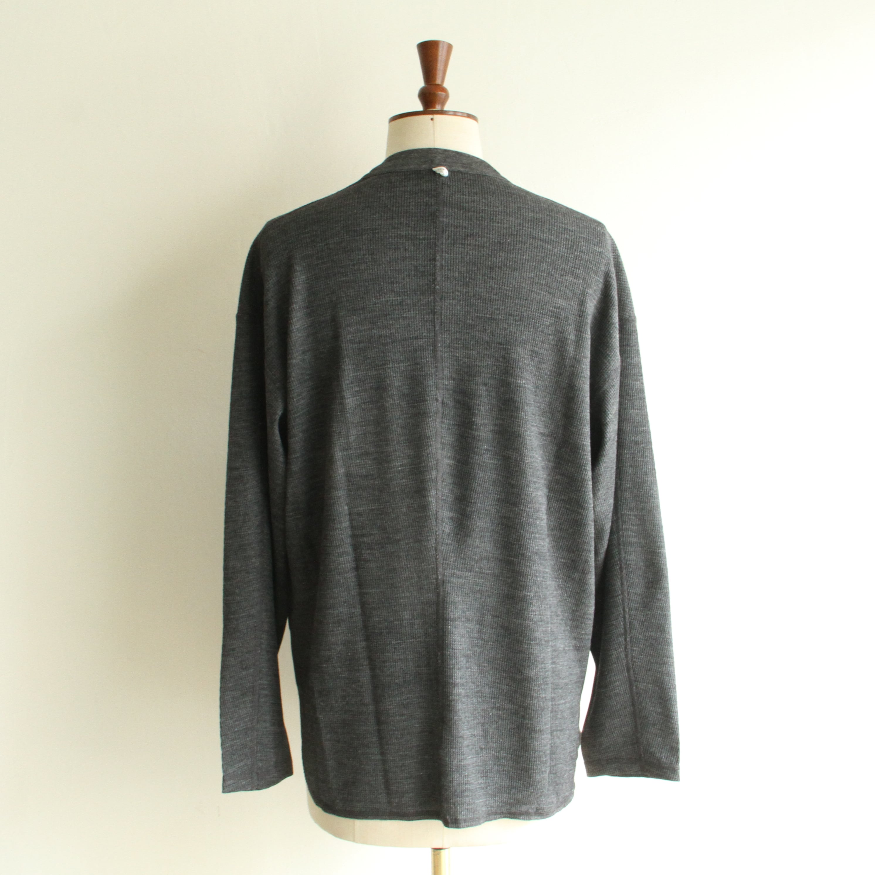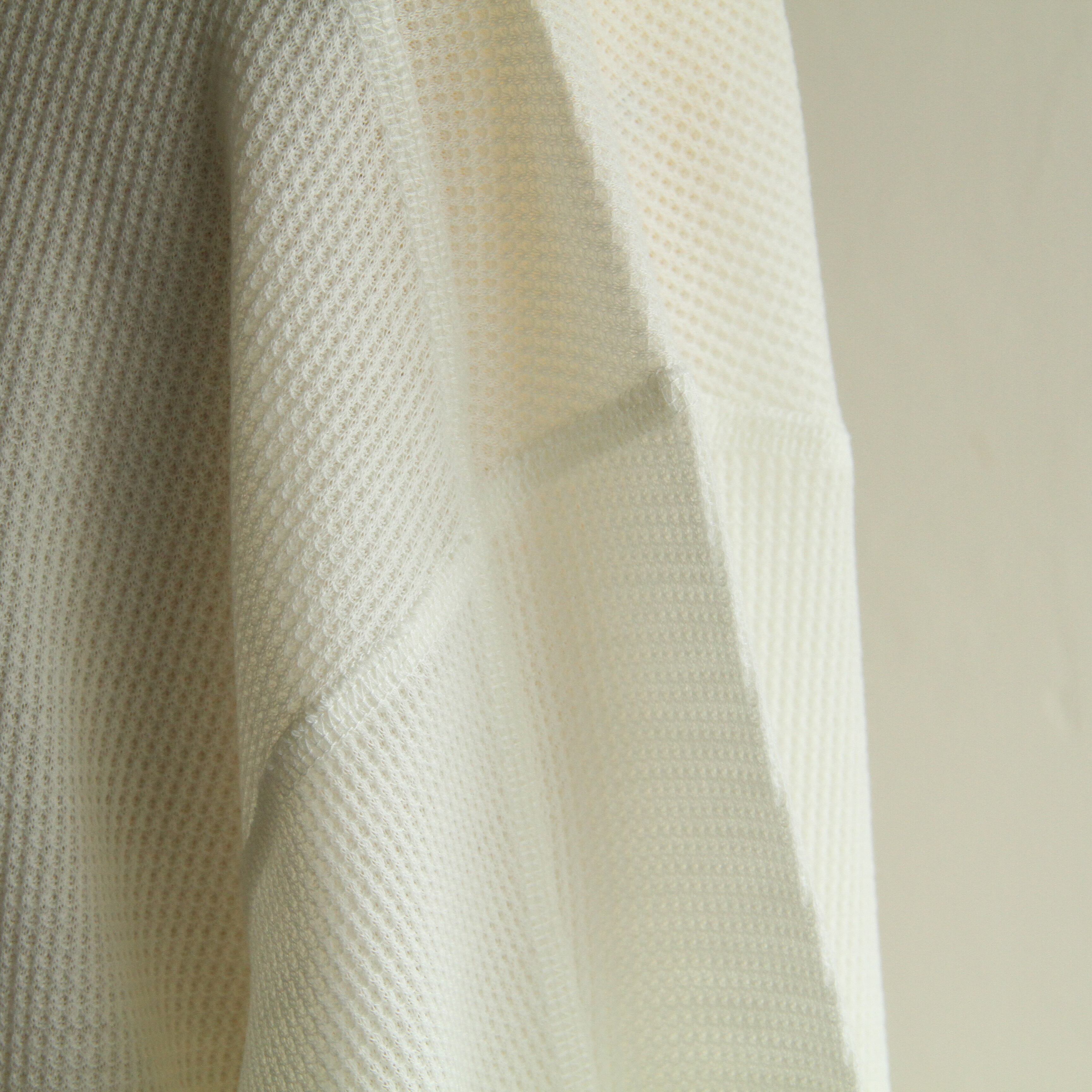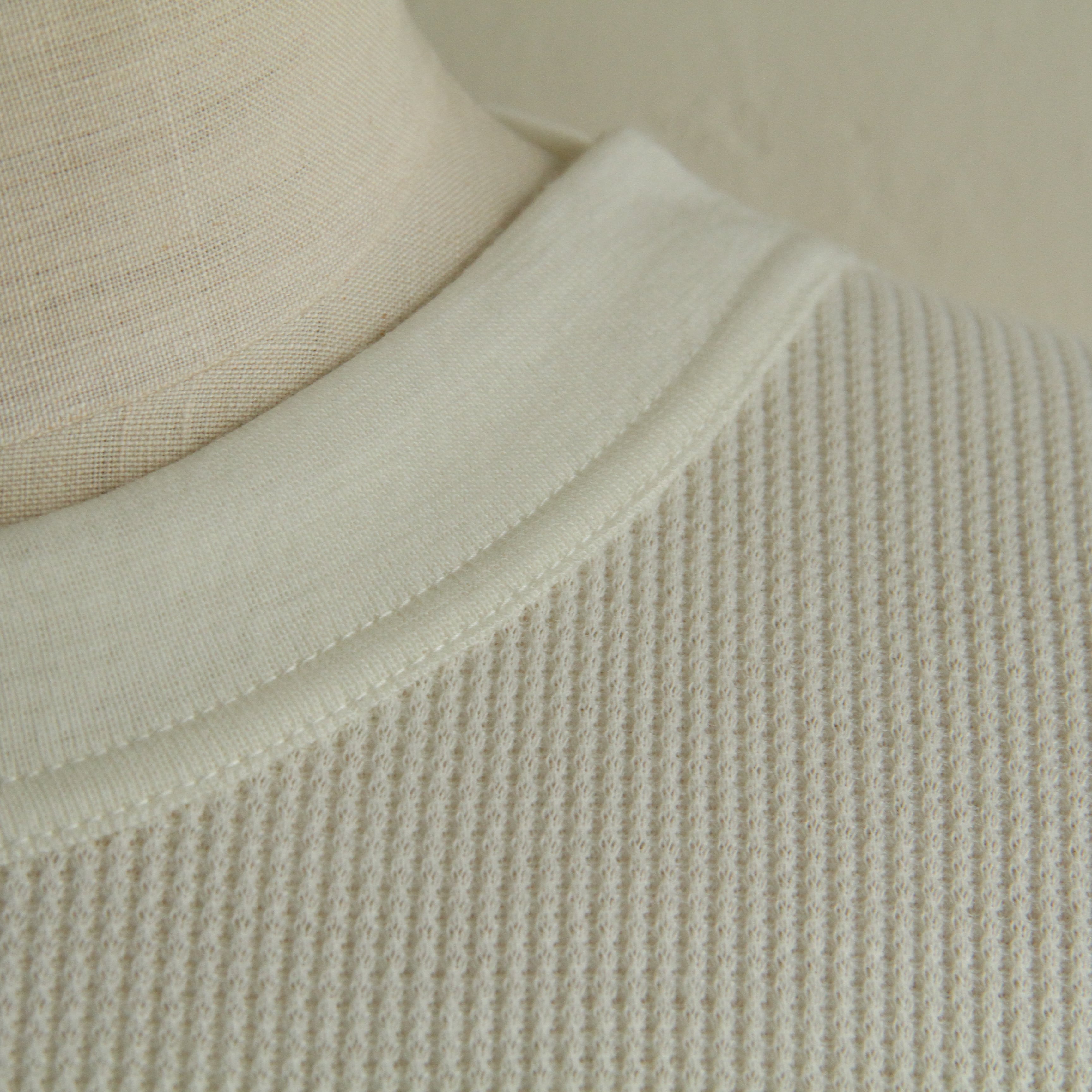 ワッフル構造に編まれたAXIO WOOL WAFFLE TEEは空気層を上手く包み込みながらも、汗をかいた時の肌離れの良さが特長です。