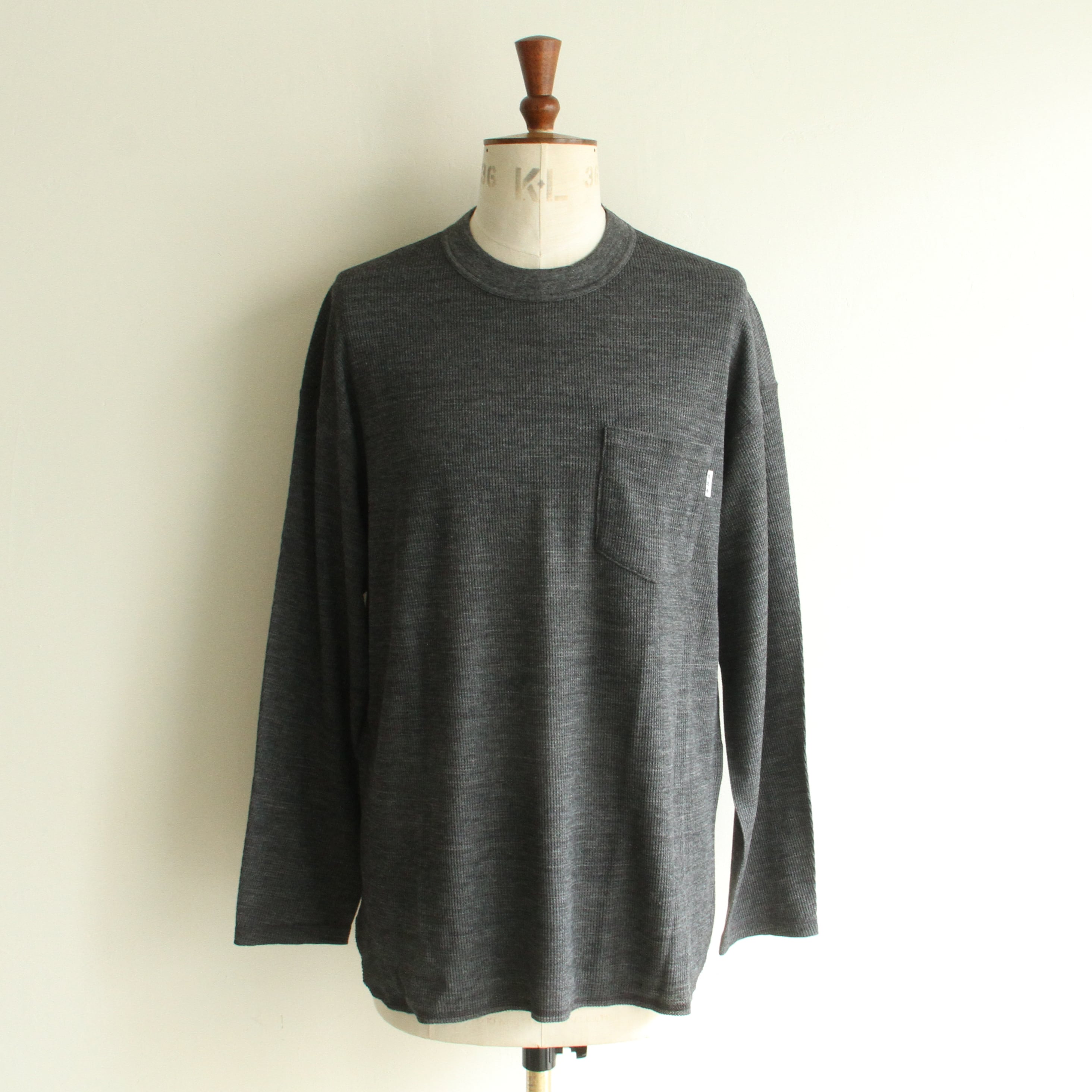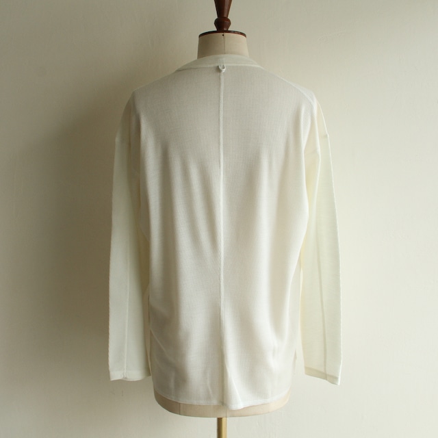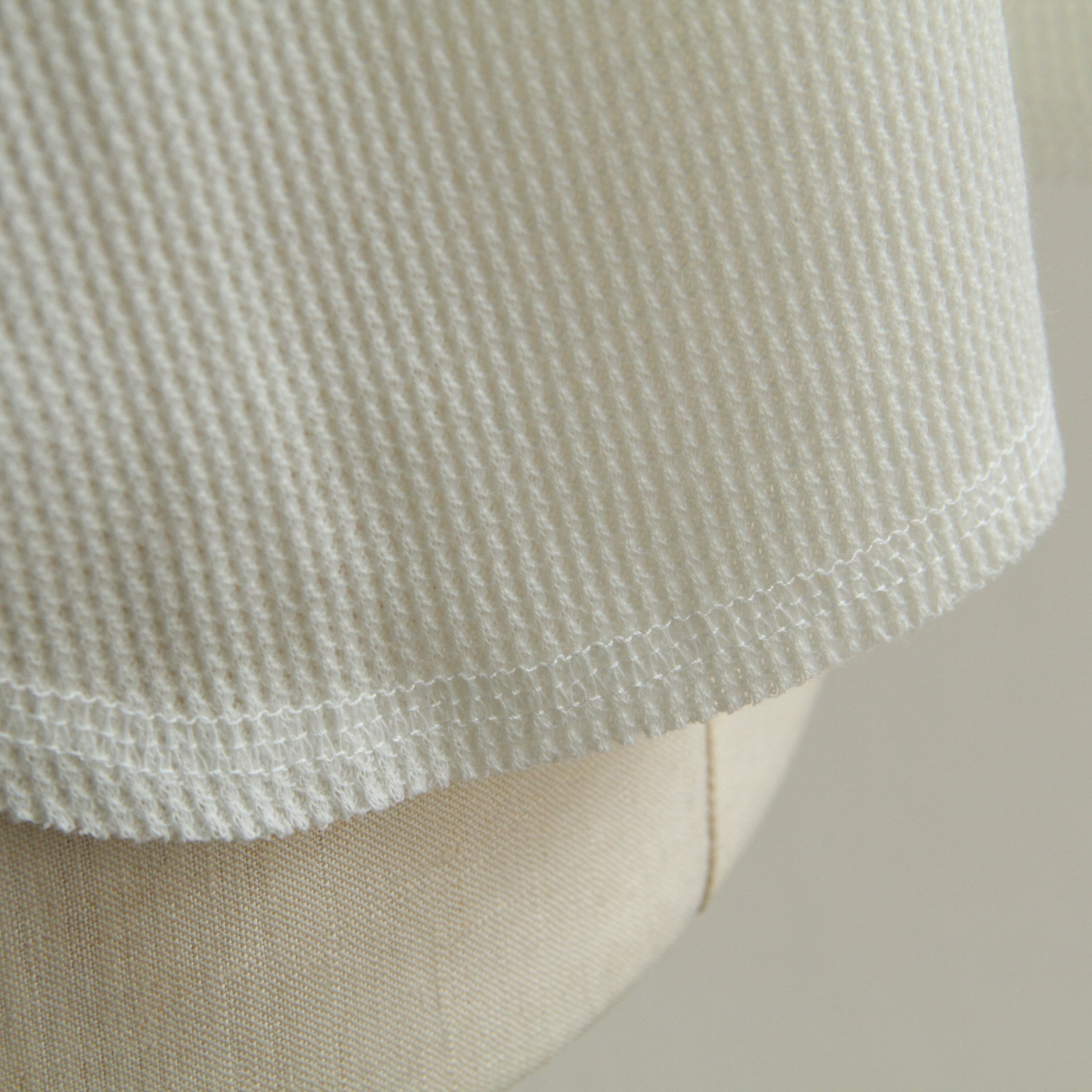 ワッフル構造に編まれたAXIO WOOL WAFFLE TEEは空気層を上手く包み込みながらも、汗をかいた時の肌離れの良さが特長です。
