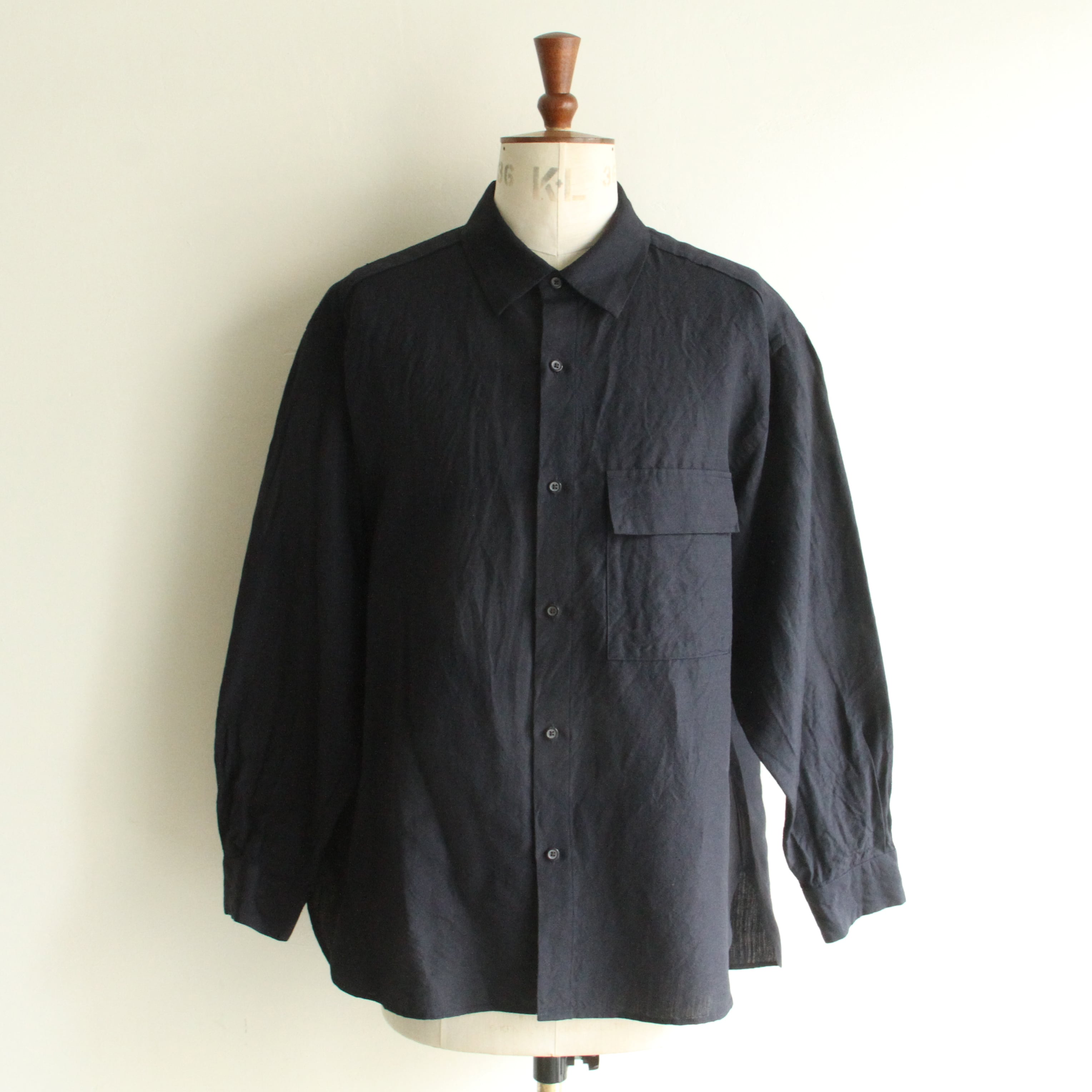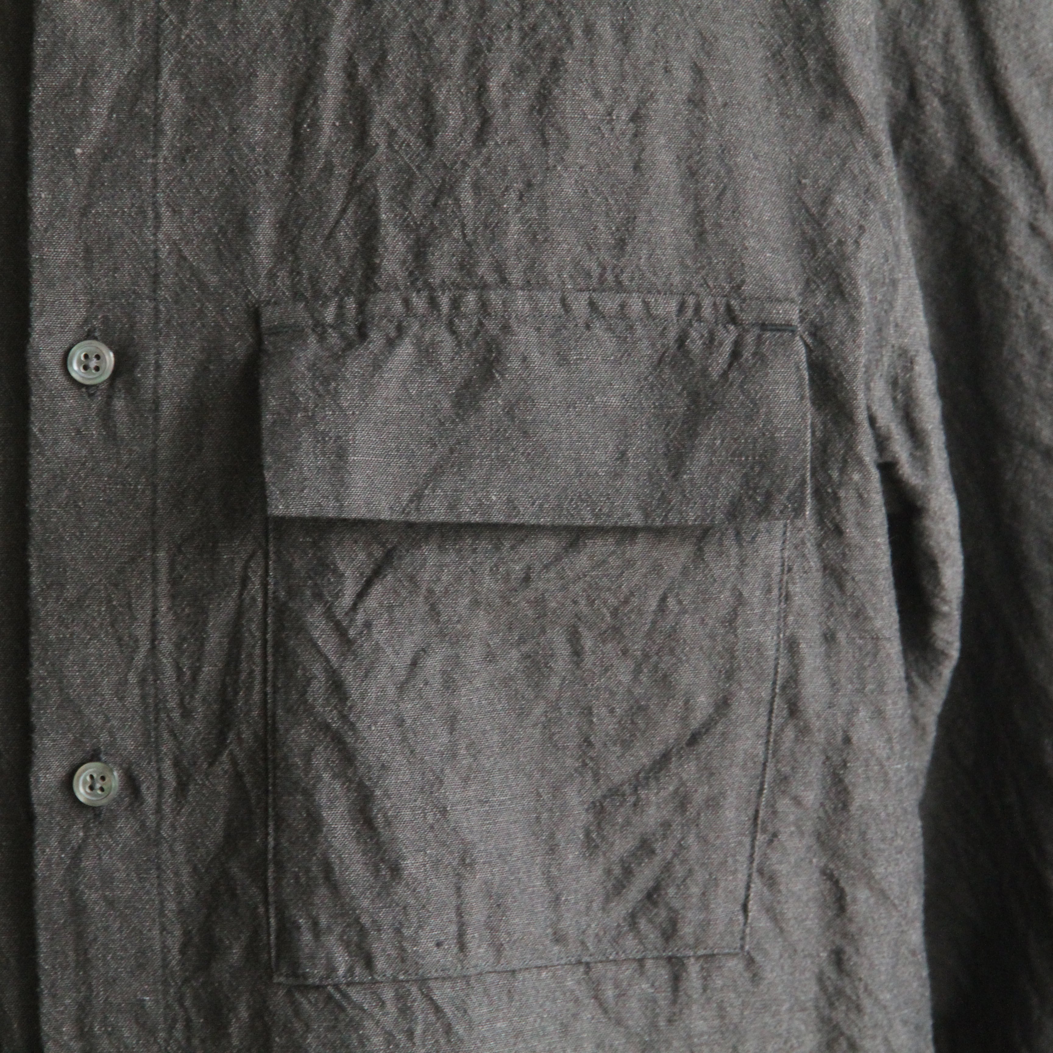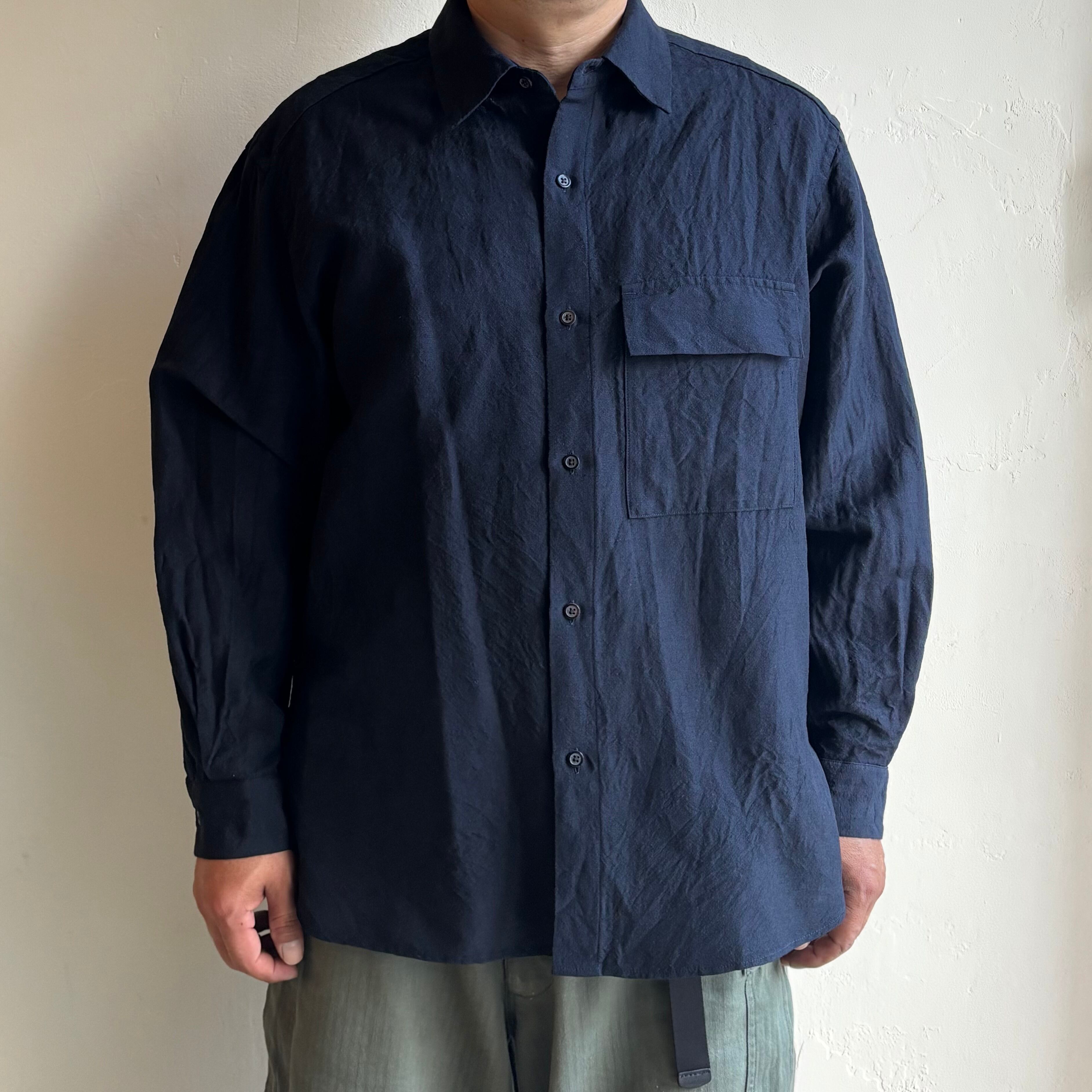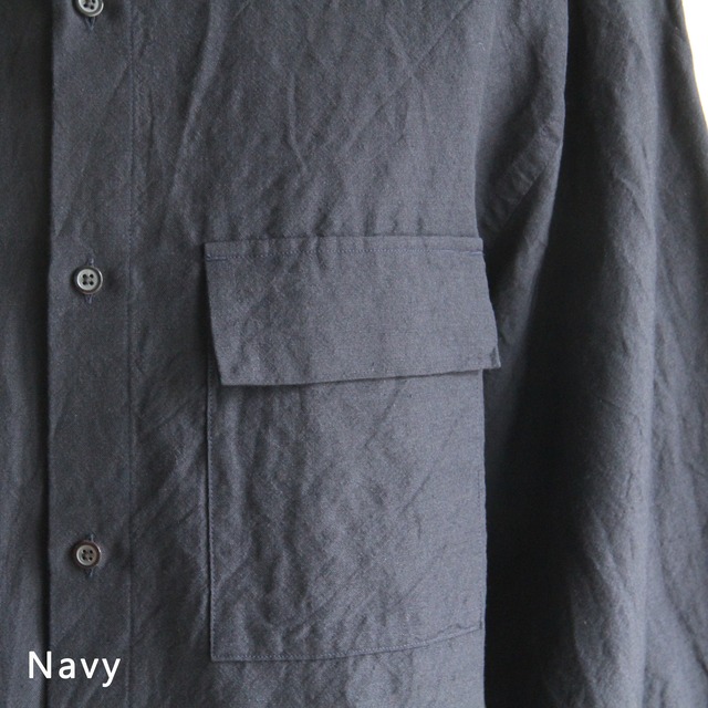 ウール/リネン素材を使用したフラップポケットのレギュラーカラーシャツ。リネン特有の節がありますが、梳毛糸を使用しているシワ感が少なく光沢感があるのが特徴です。暖かくなってから羽織として1枚で着ていただいても様になるアイテムです。