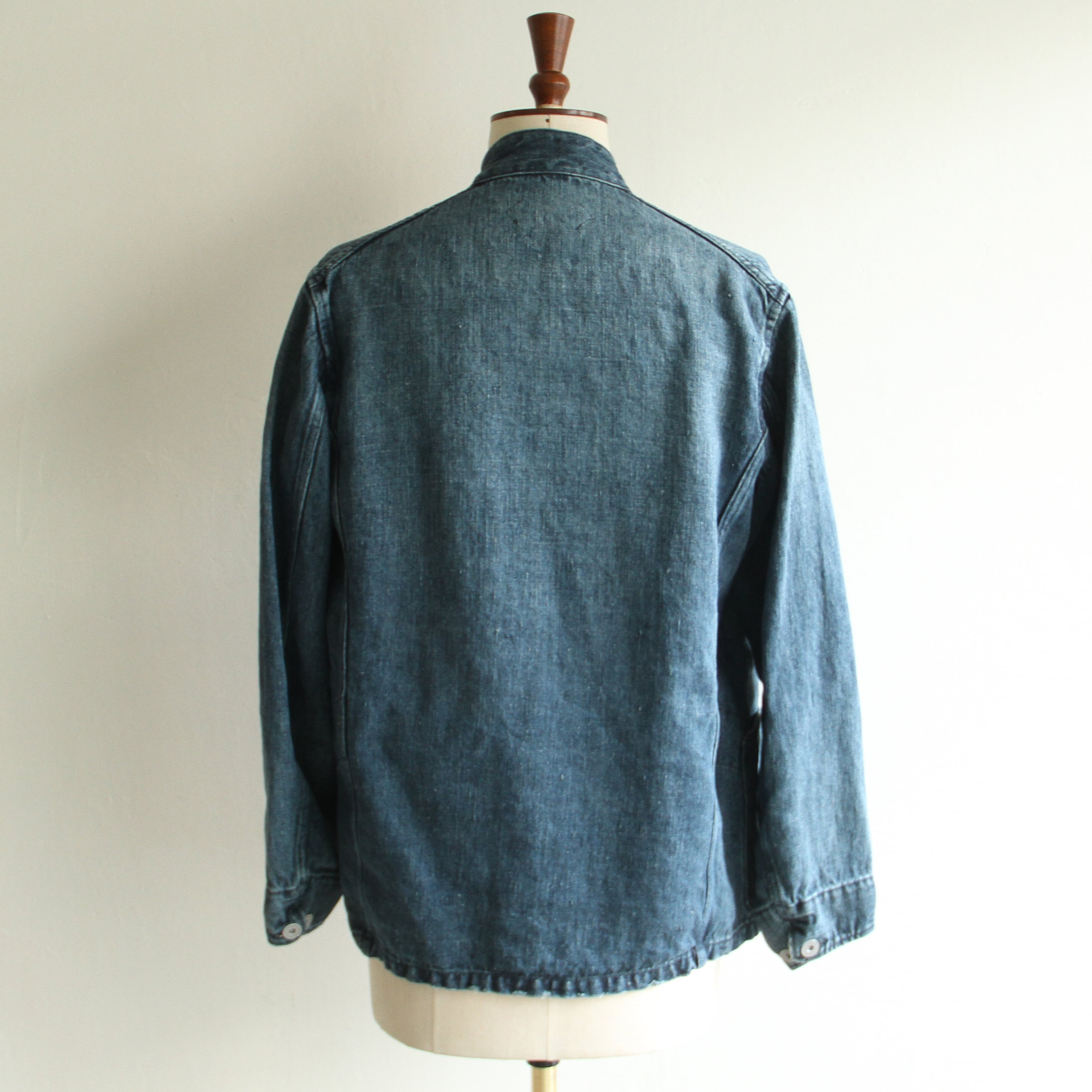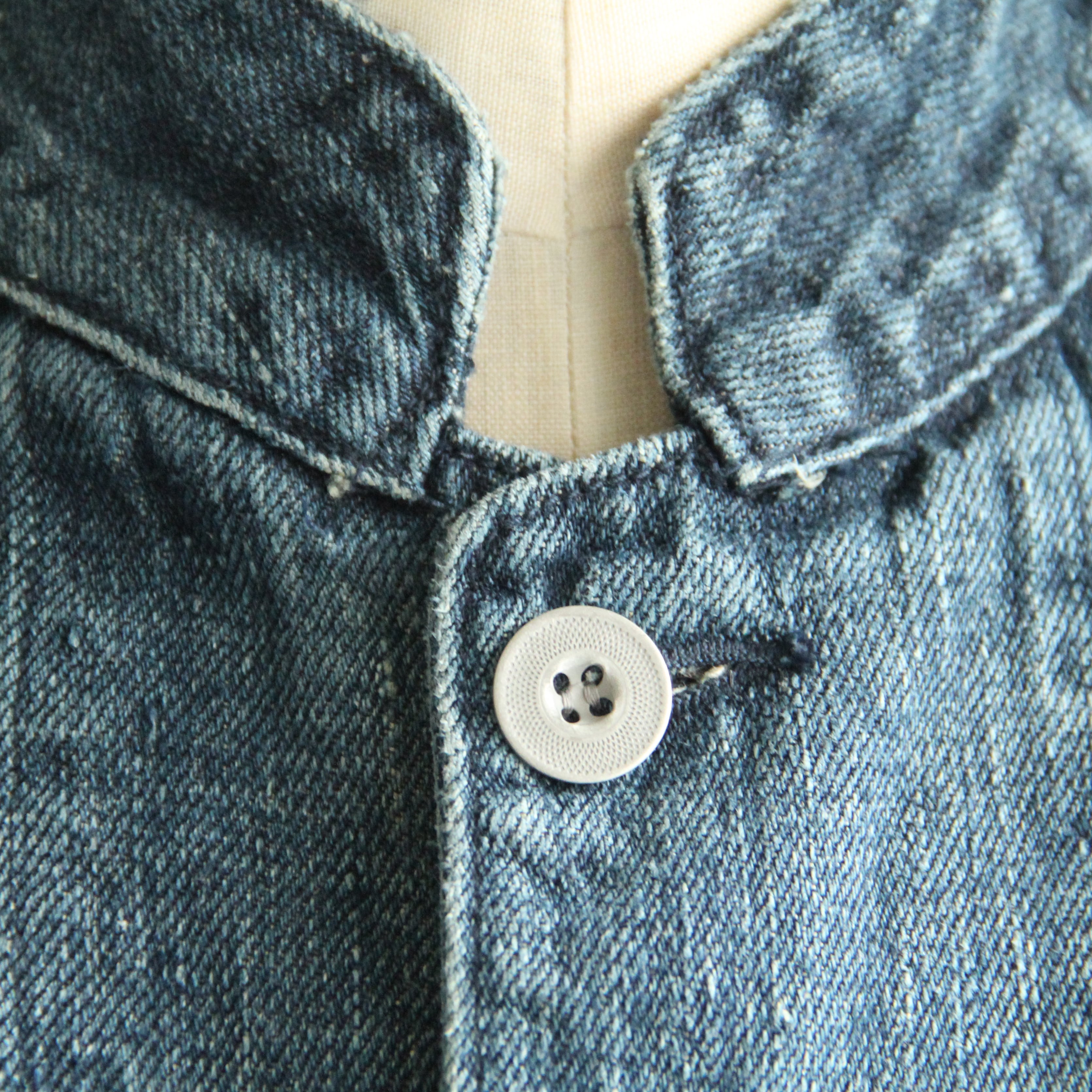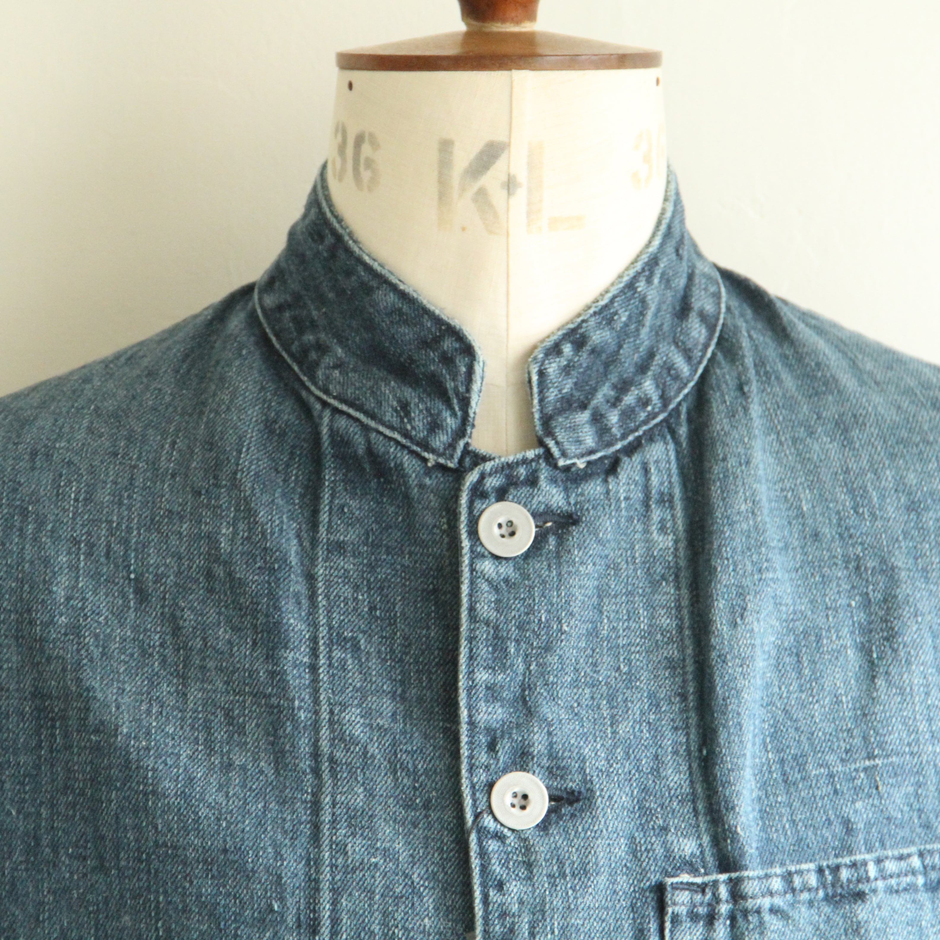 麻原料+インディゴの生地はアメリカにはあまり流通しておらず、フランス、ヨーロッパが19世紀まではメインであったことから、UKワークウエア界の異端児「Fabram」社のスタンドカラーセットアップをイメージ致しました。イギリス独特のワークでありながら前に振る袖もしっかり型紙に反映しております。