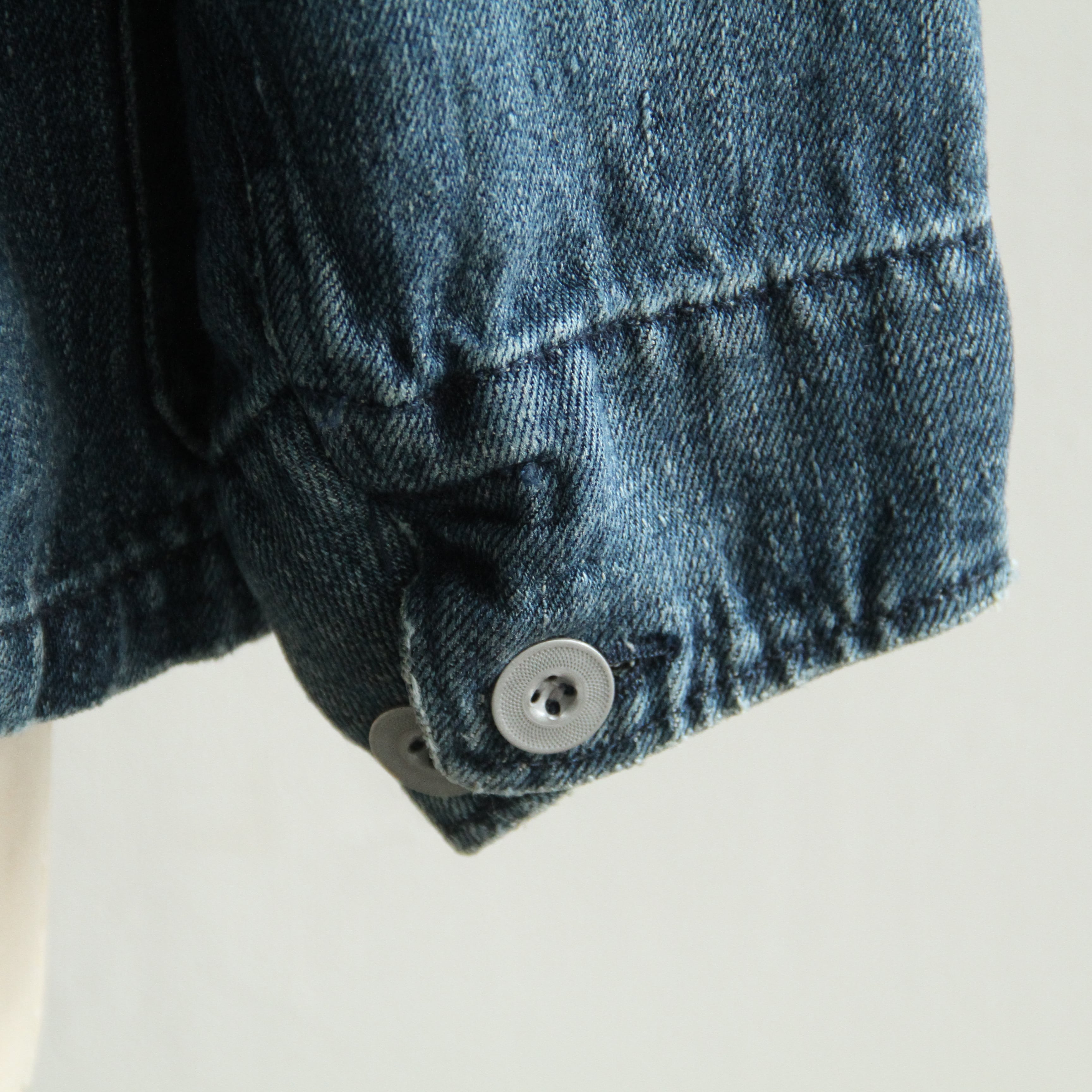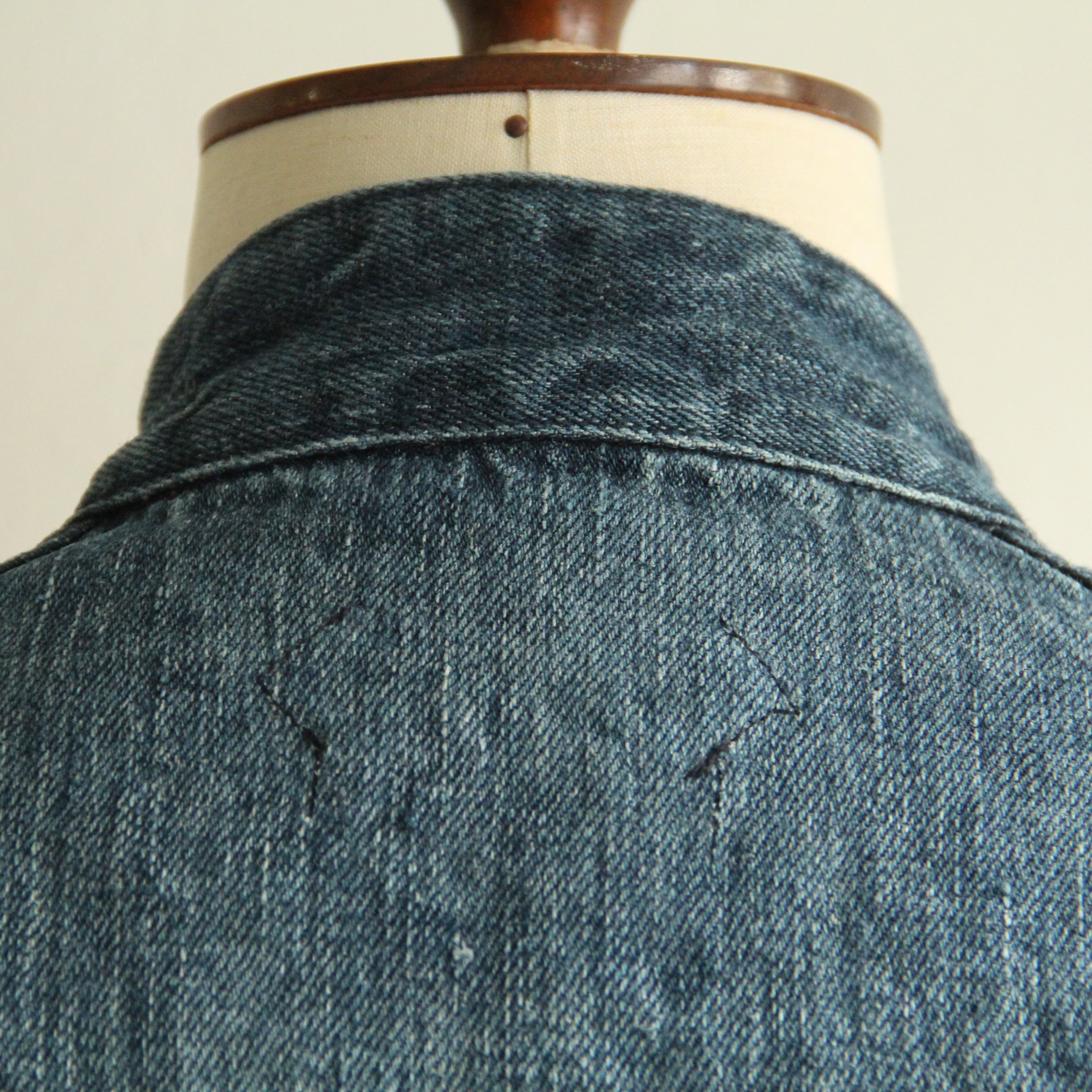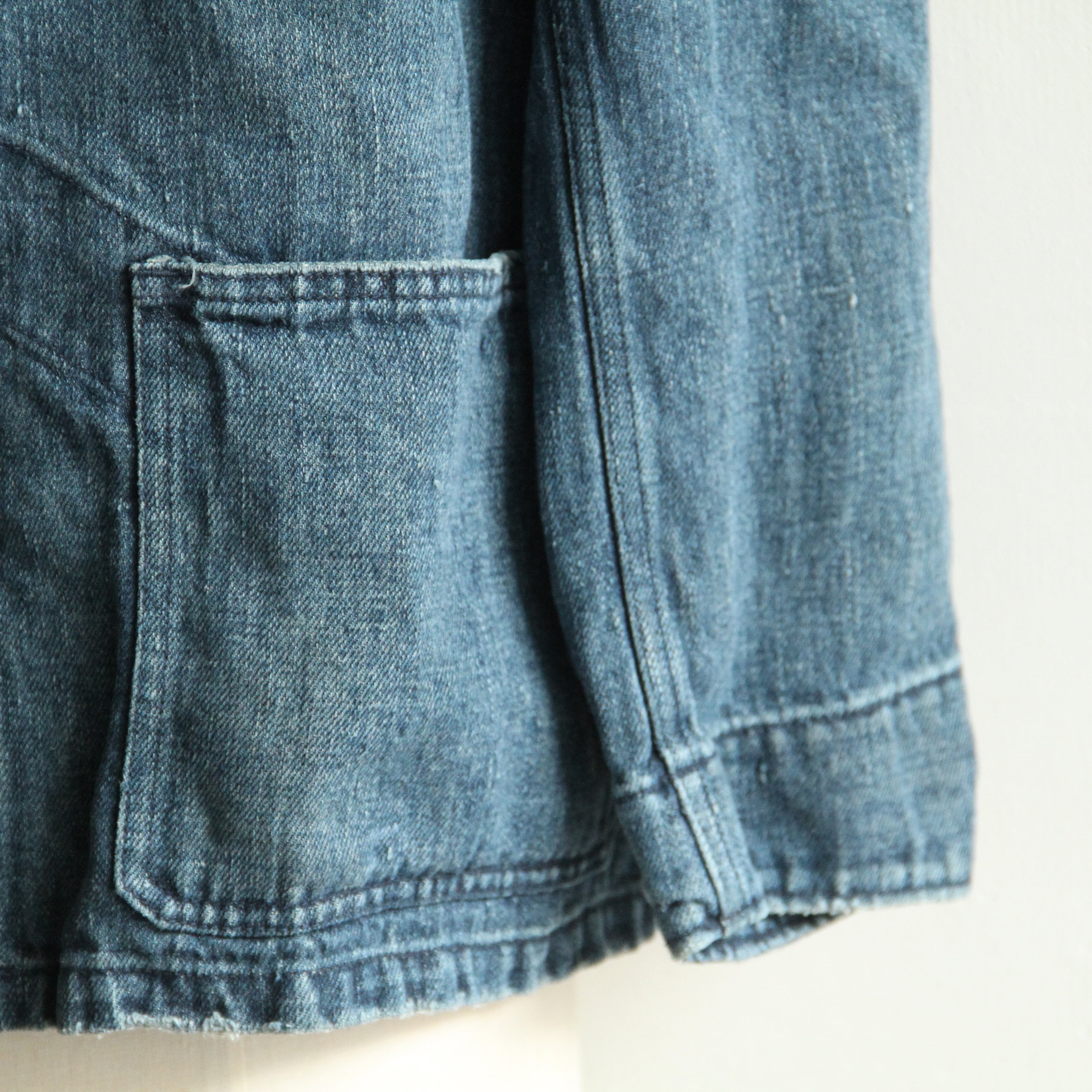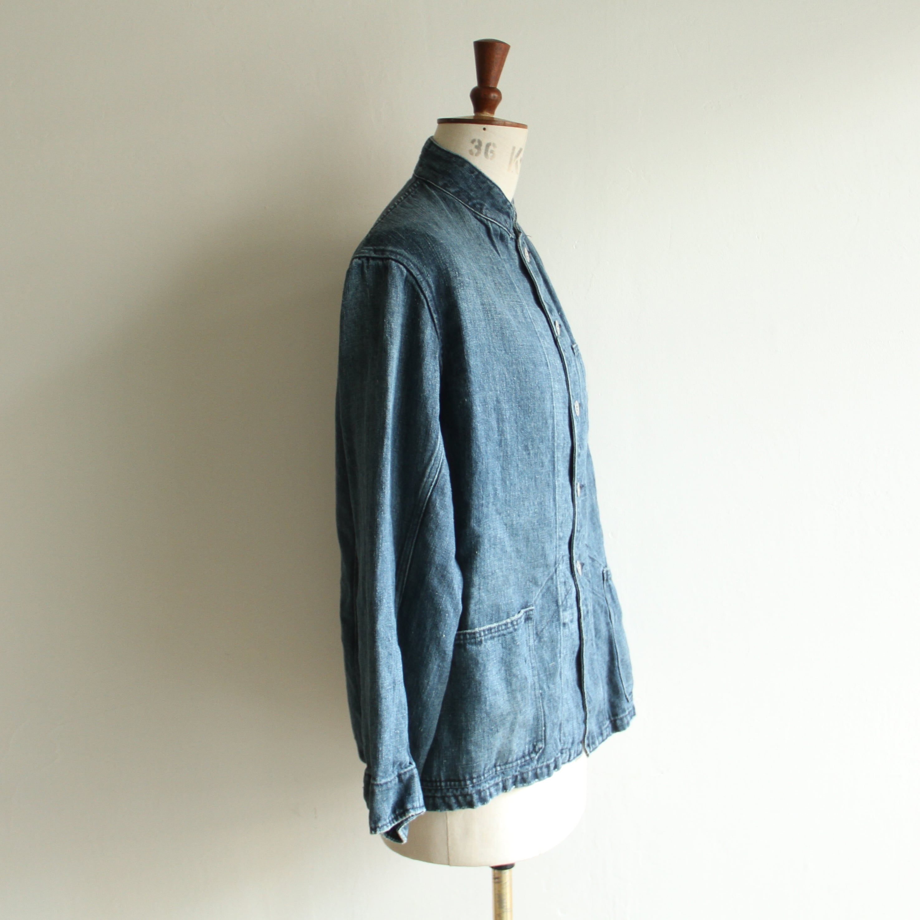 麻原料+インディゴの生地はアメリカにはあまり流通しておらず、フランス、ヨーロッパが19世紀まではメインであったことから、UKワークウエア界の異端児「Fabram」社のスタンドカラーセットアップをイメージ致しました。イギリス独特のワークでありながら前に振る袖もしっかり型紙に反映しております。