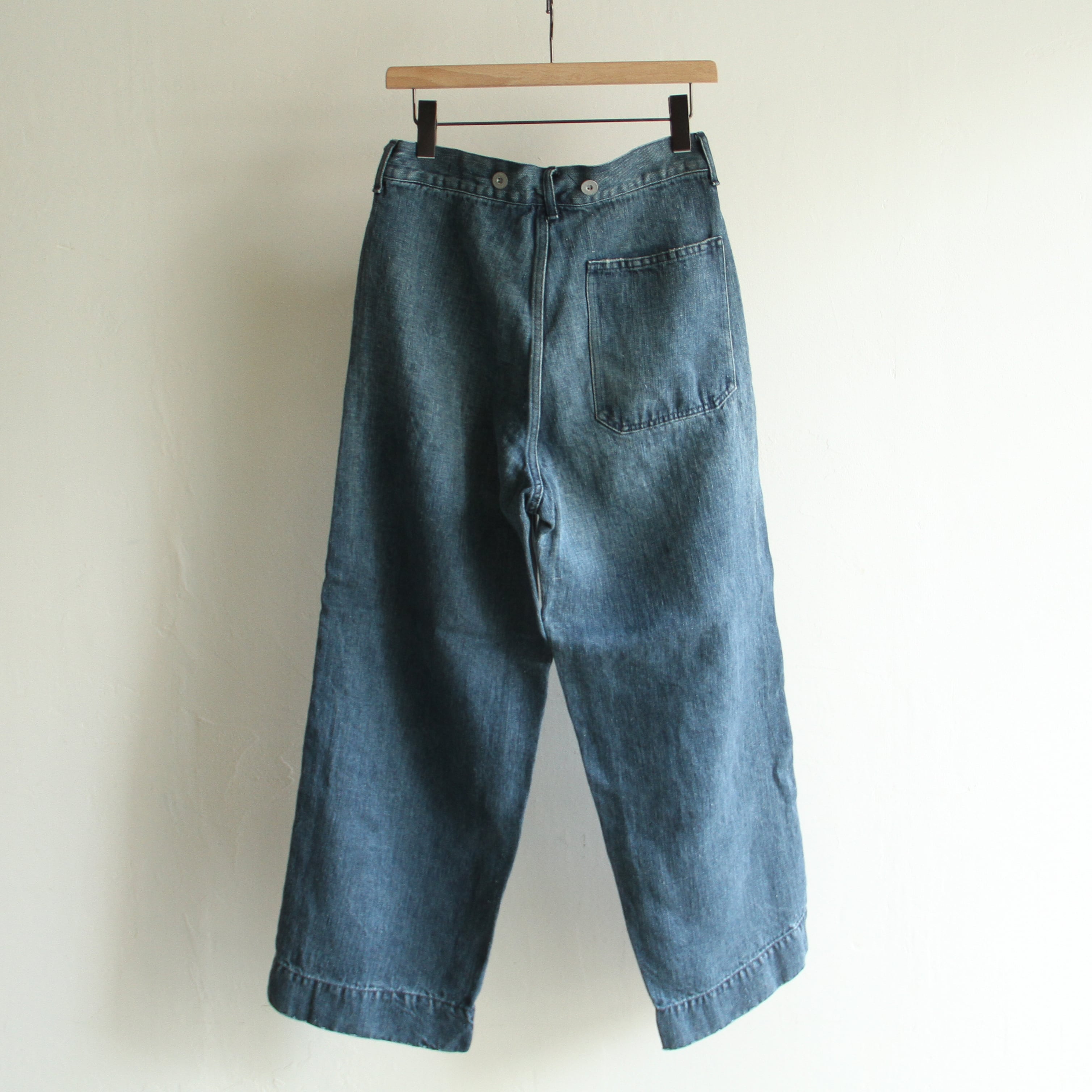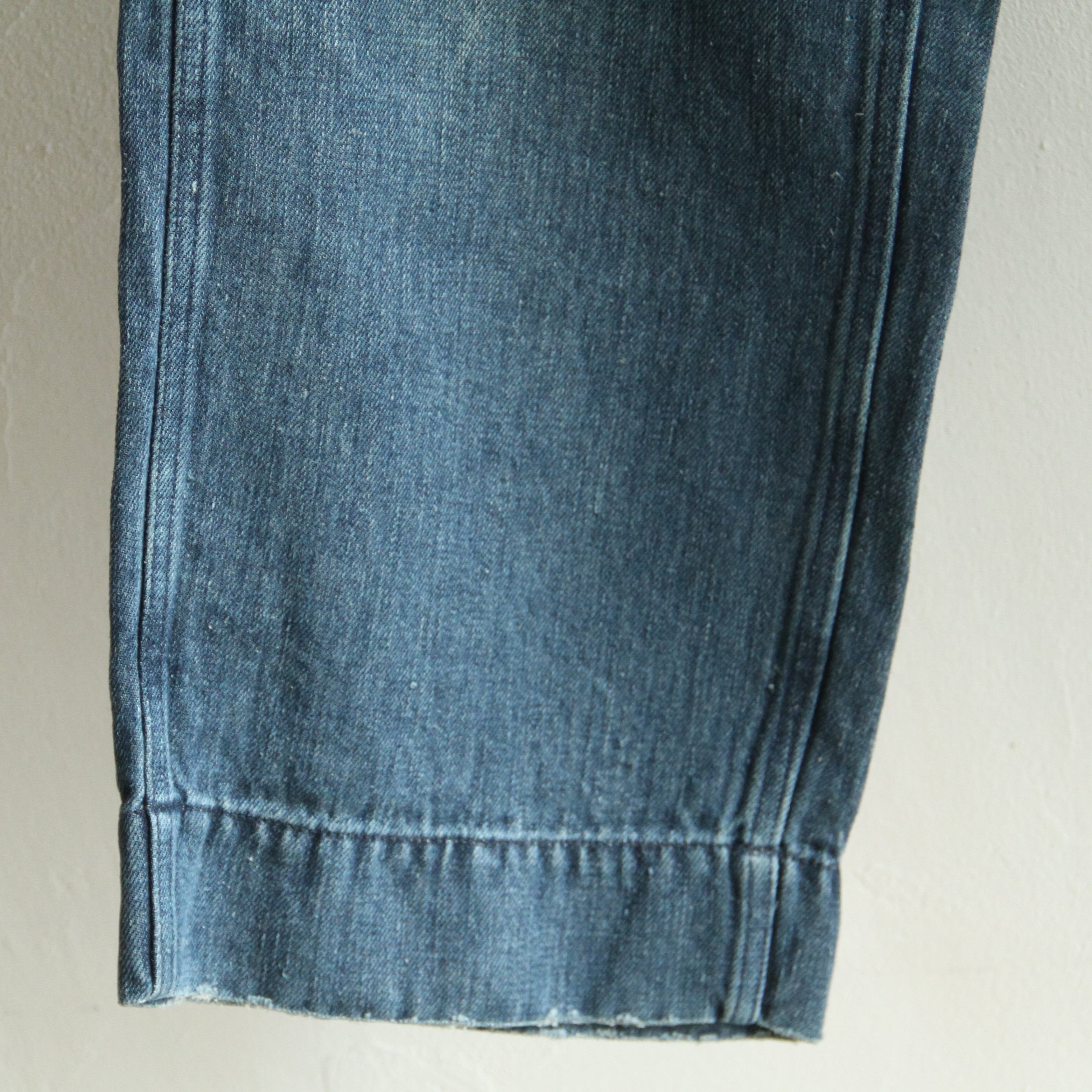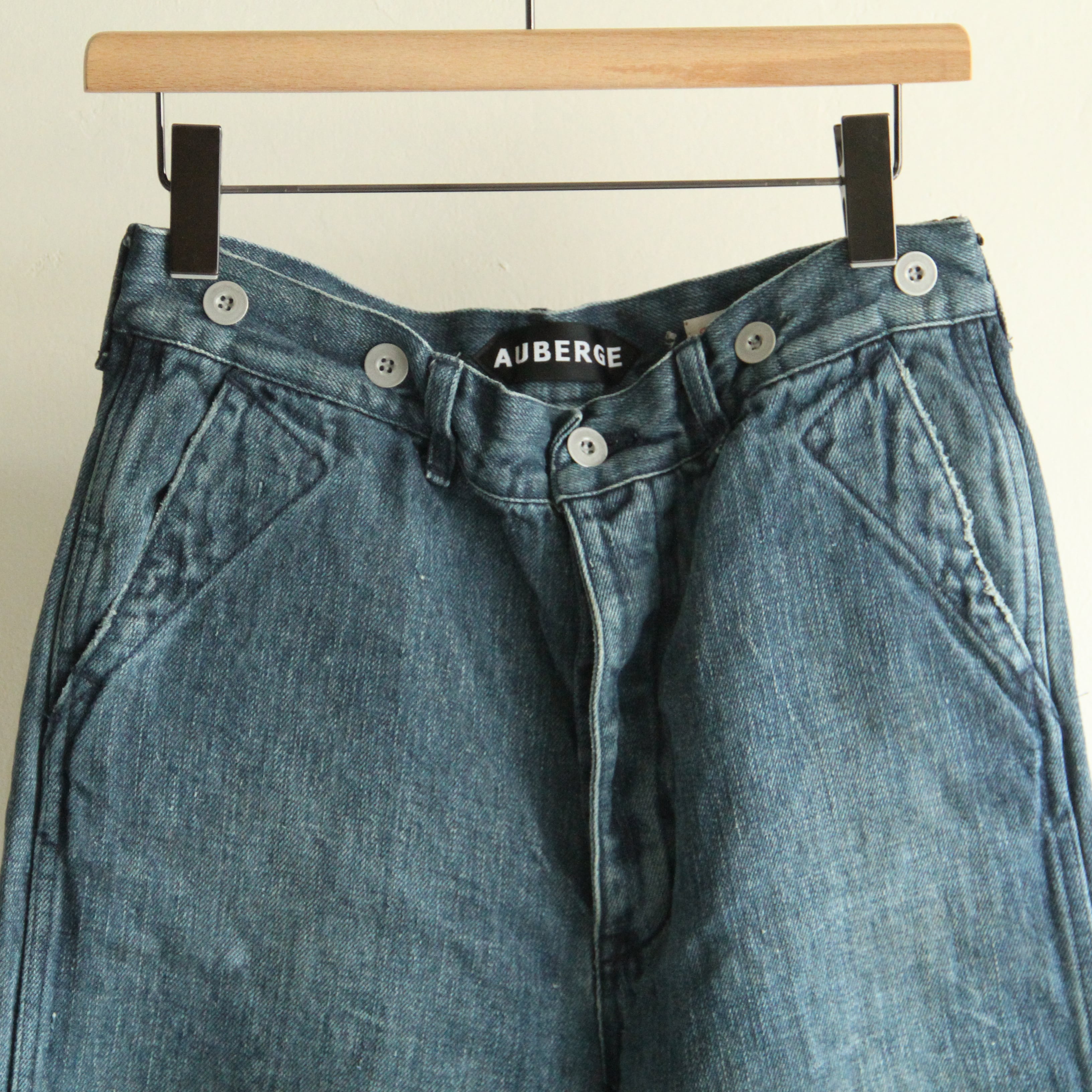 こちらもUKファブラム社のインディゴワークスラックスをデザインベースにしております。シルエットはAUBERGEの41チノに近いワイドバギータイプで素材の迫力と相まって存在感のある1本です。加工は岡山・豊和でのスーパーリアル洗い。