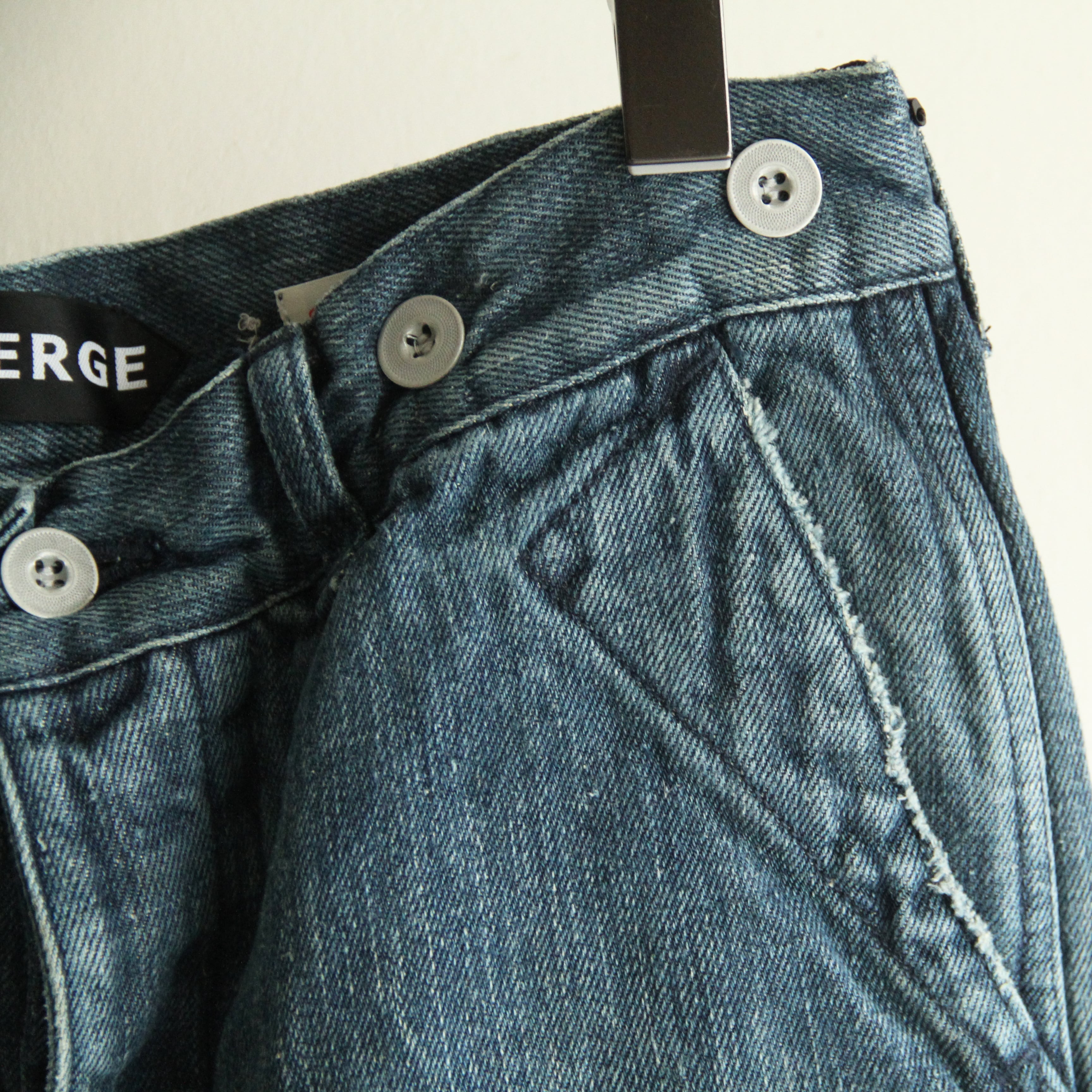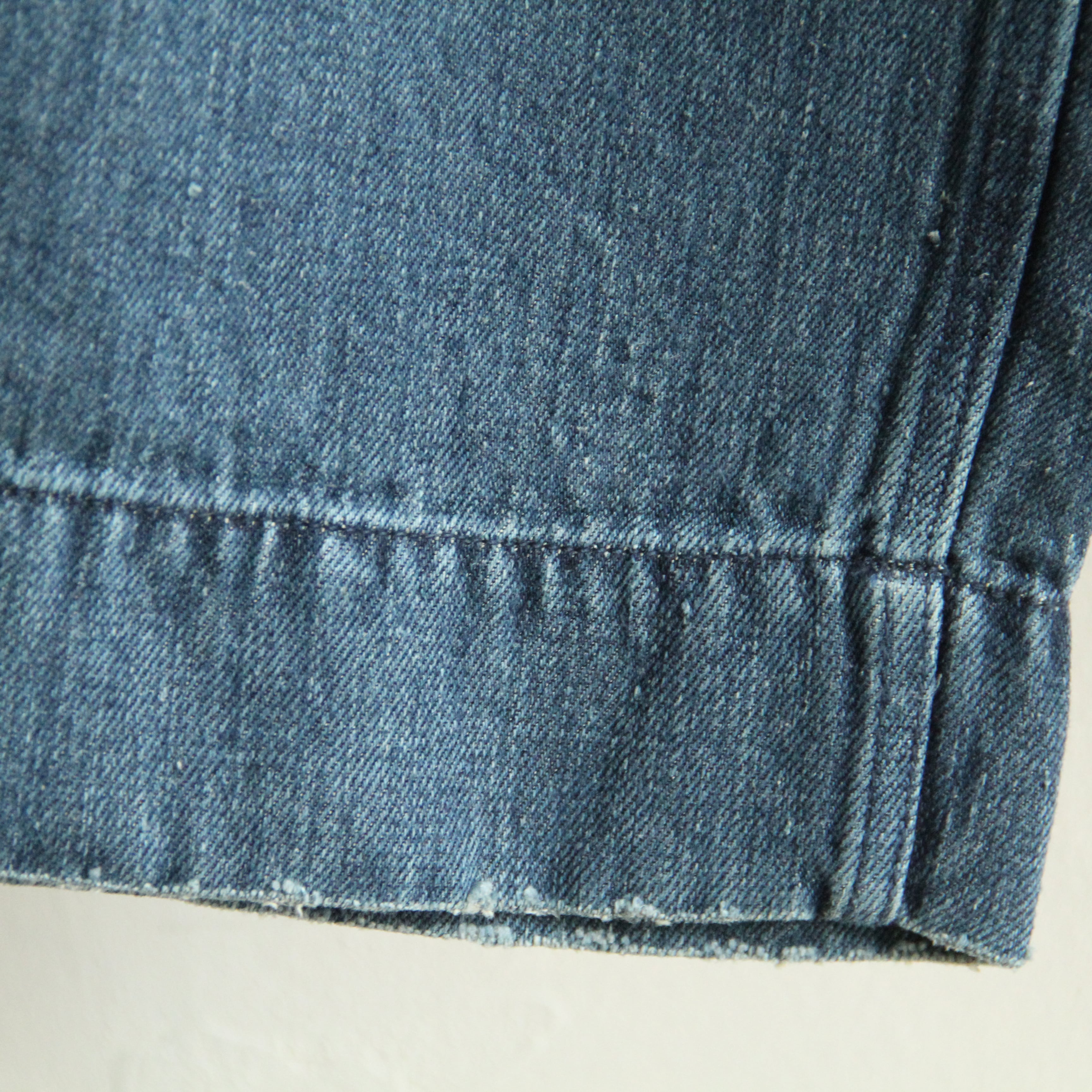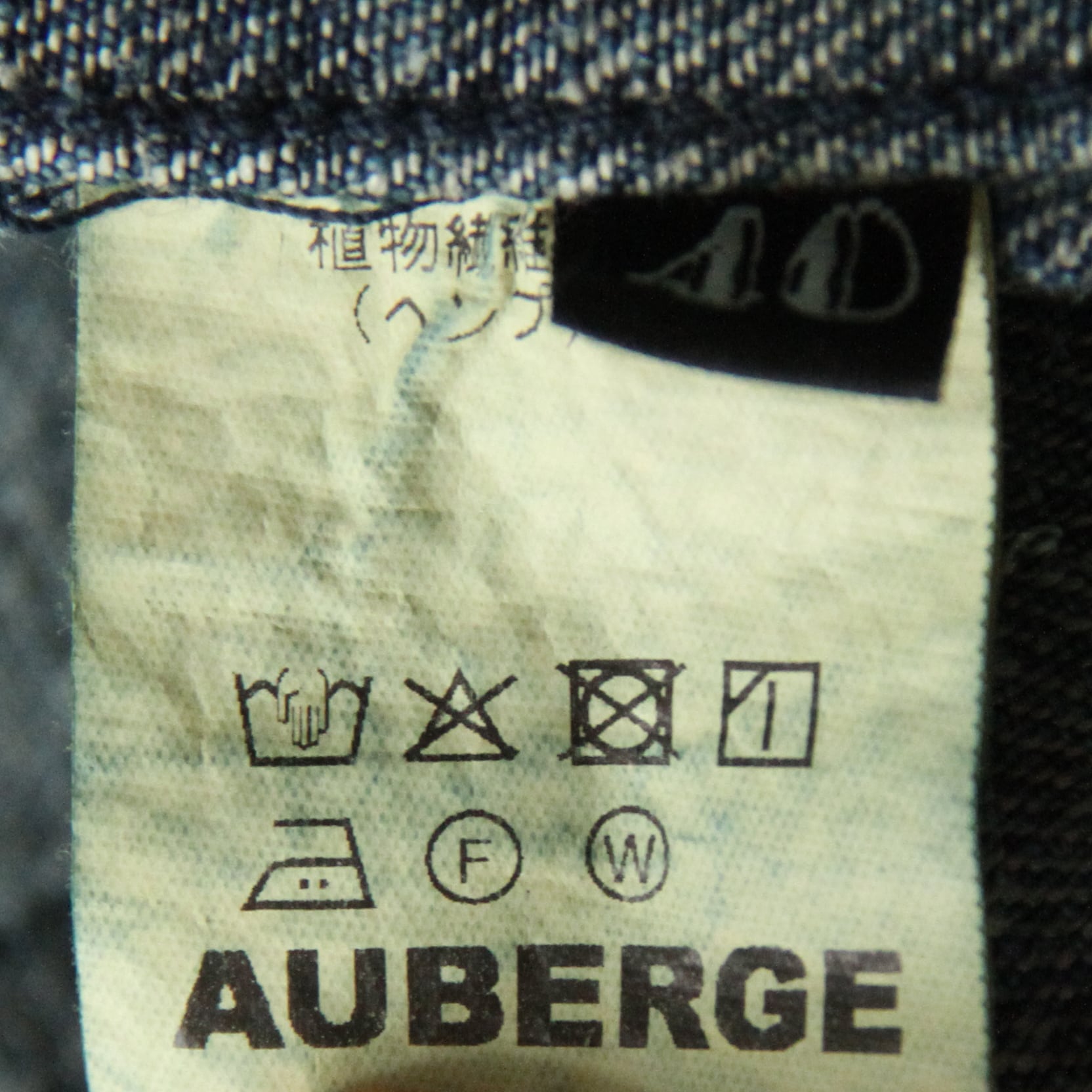 こちらもUKファブラム社のインディゴワークスラックスをデザインベースにしております。シルエットはAUBERGEの41チノに近いワイドバギータイプで素材の迫力と相まって存在感のある1本です。加工は岡山・豊和でのスーパーリアル洗い。