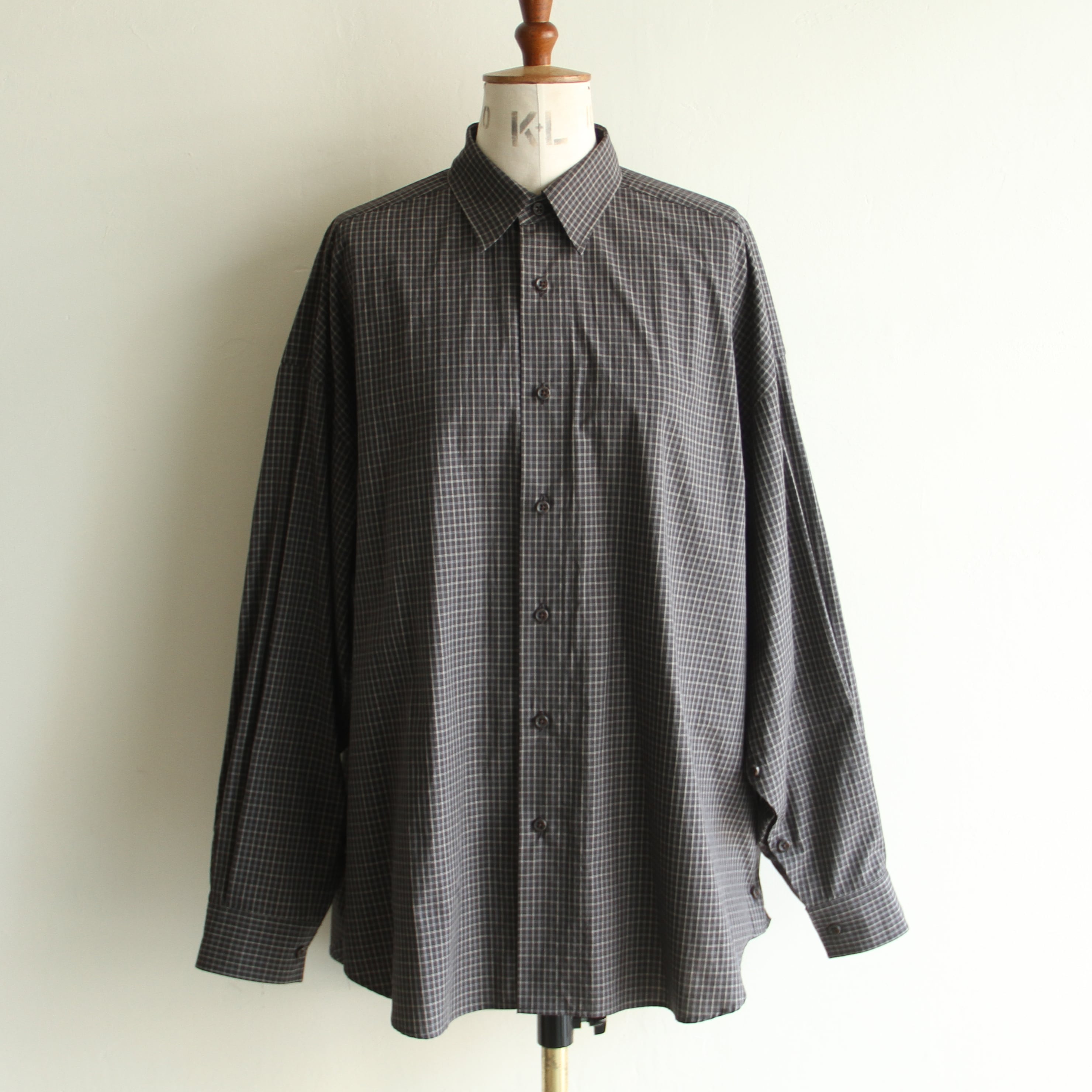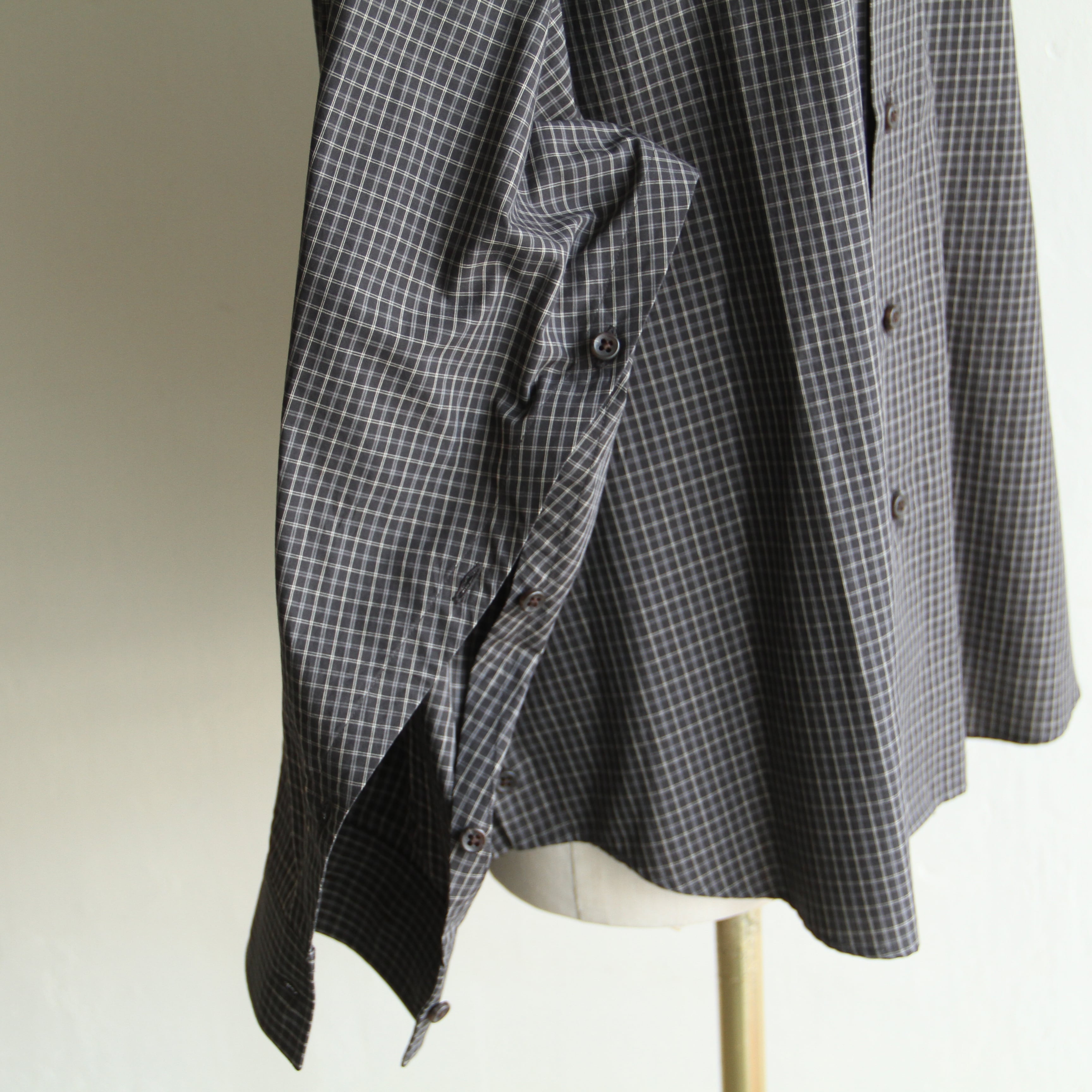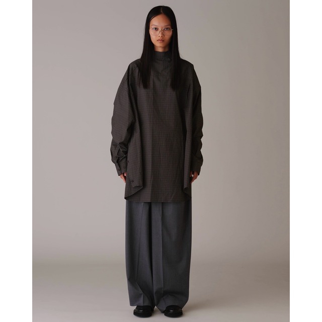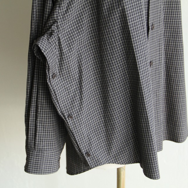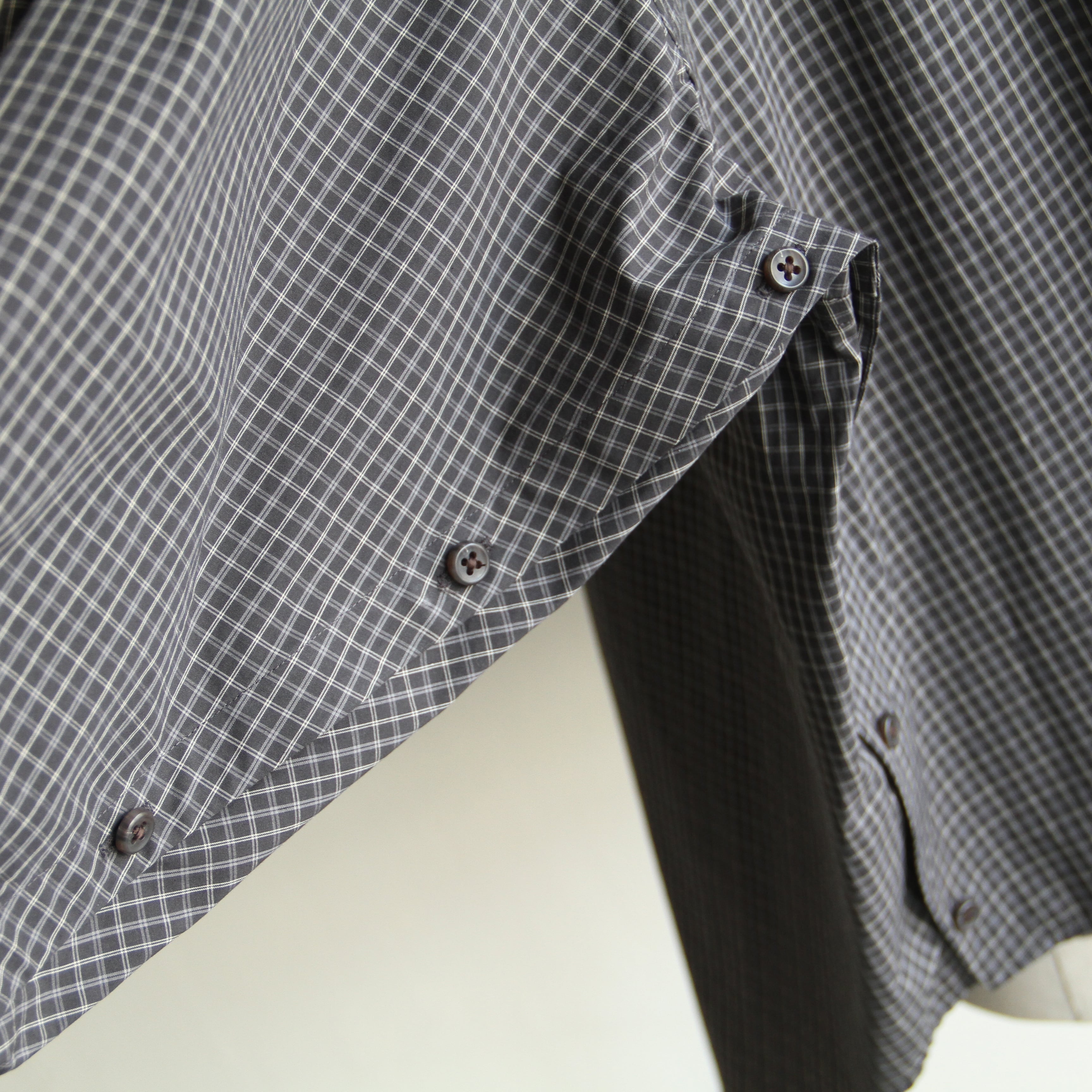 シンプルなオーバーサイズシャツながら、袖下から脇にかけてボタン開きになっており、開け方次第でシルエットを自由にアレンジできる遊び心のあるデザインです。