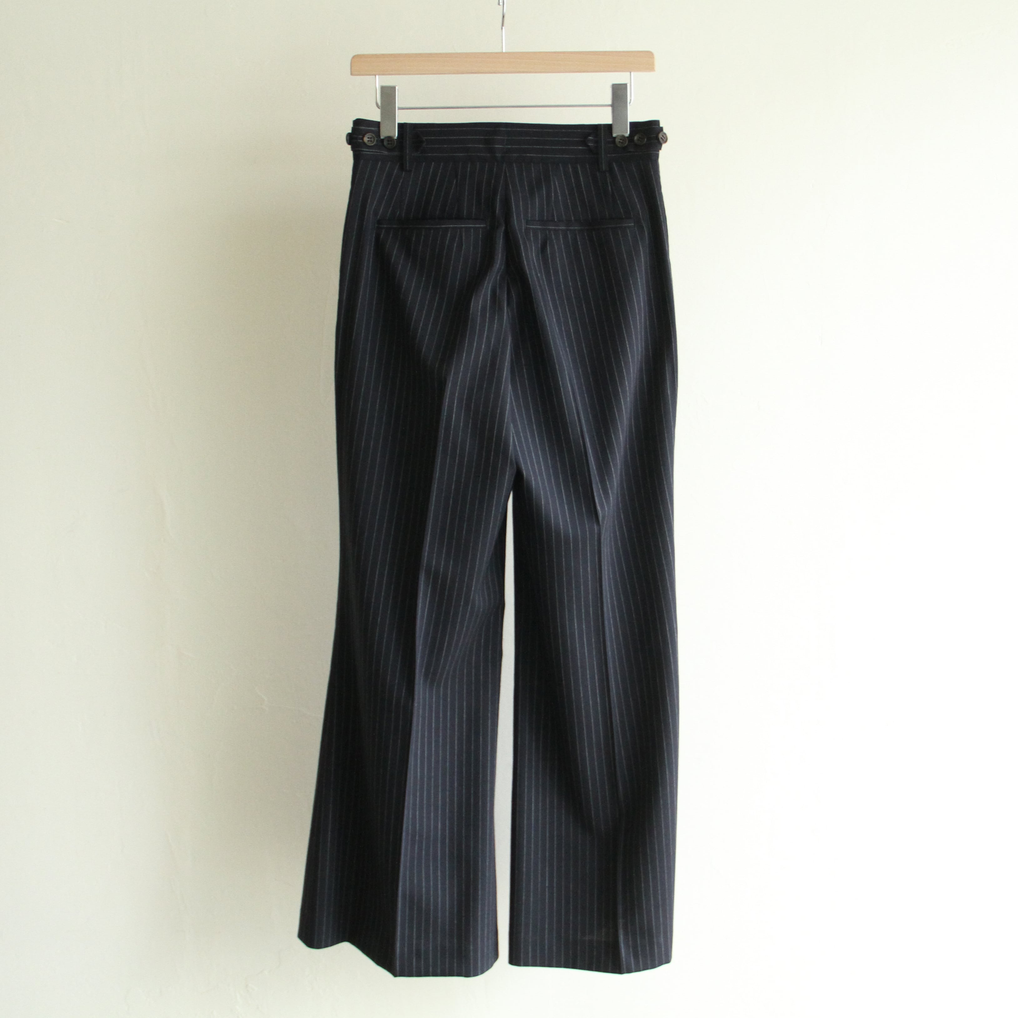 細いストライプ柄と、少しフレア気味のシルエットで脚のラインを綺麗に見せてくれます。