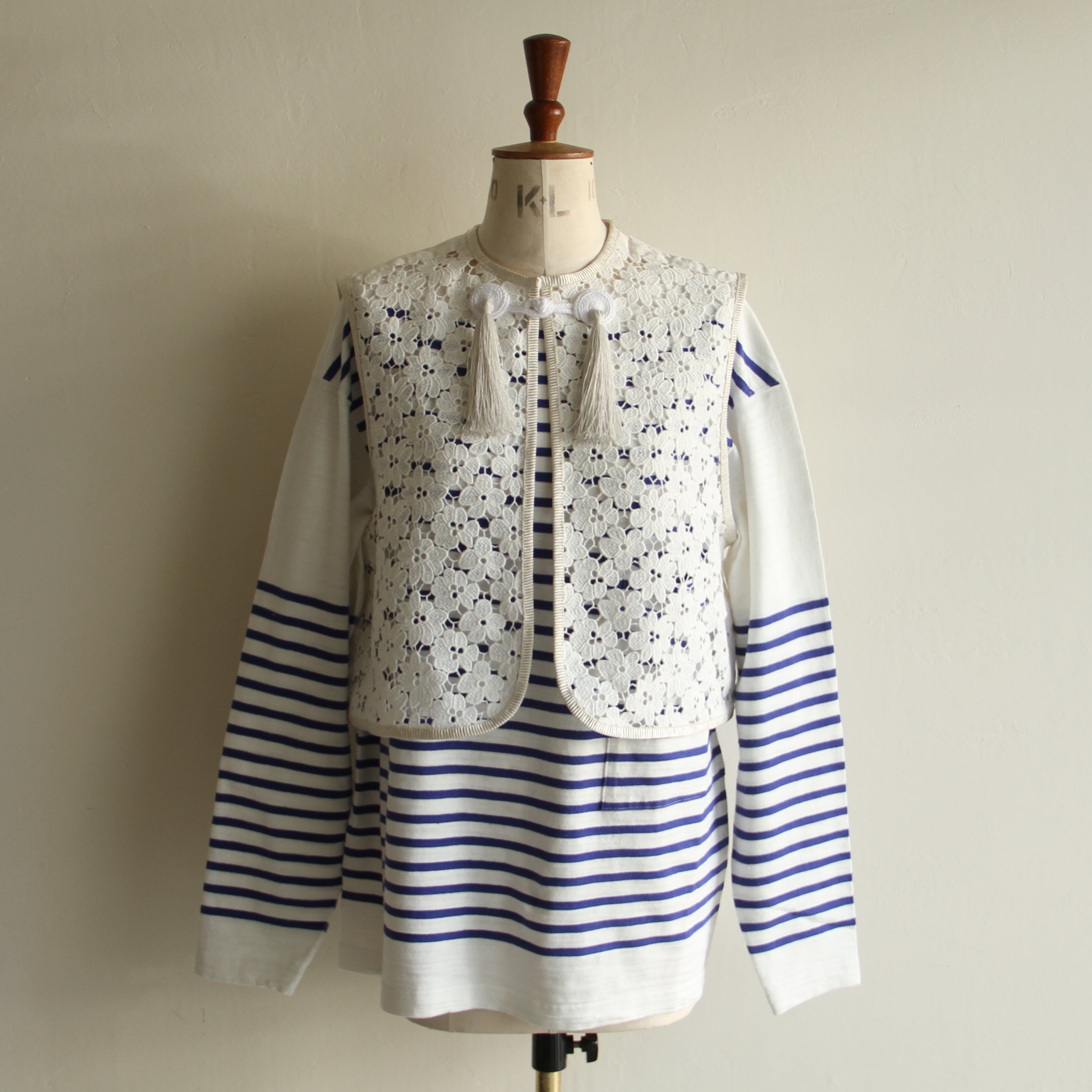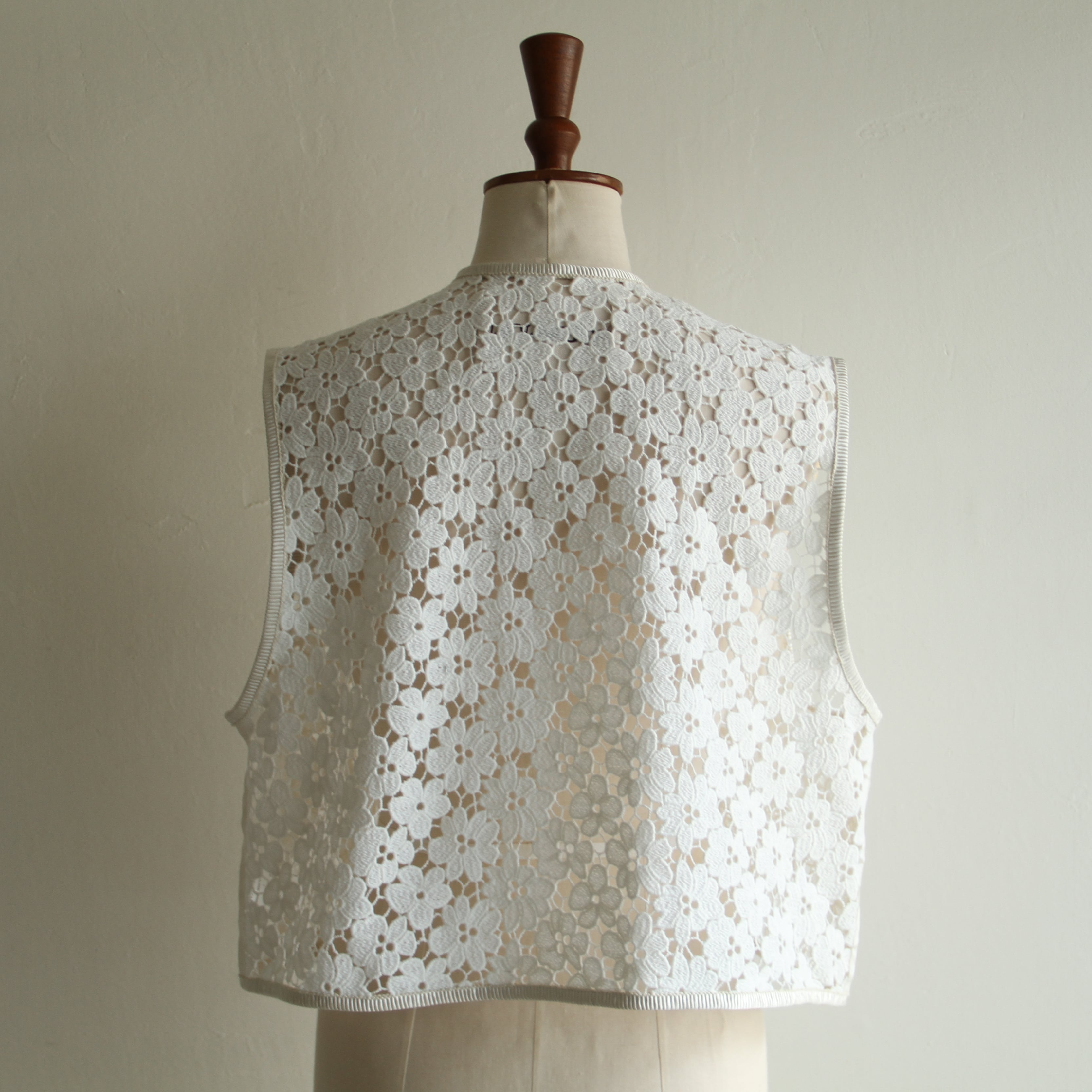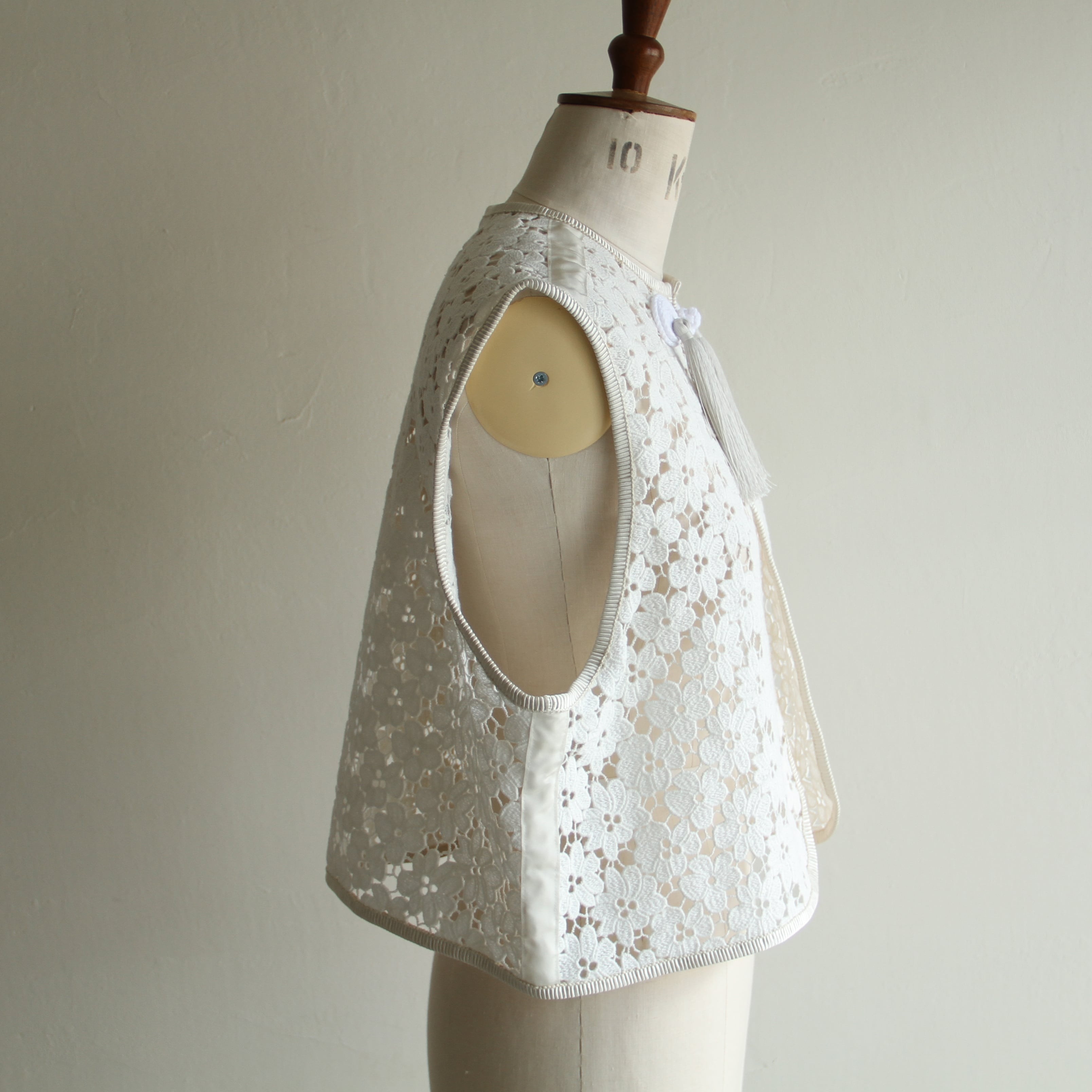 国内の老舗レース工場にて作成されたオリジナルのコットンのケミカルレースを使用したベスト。