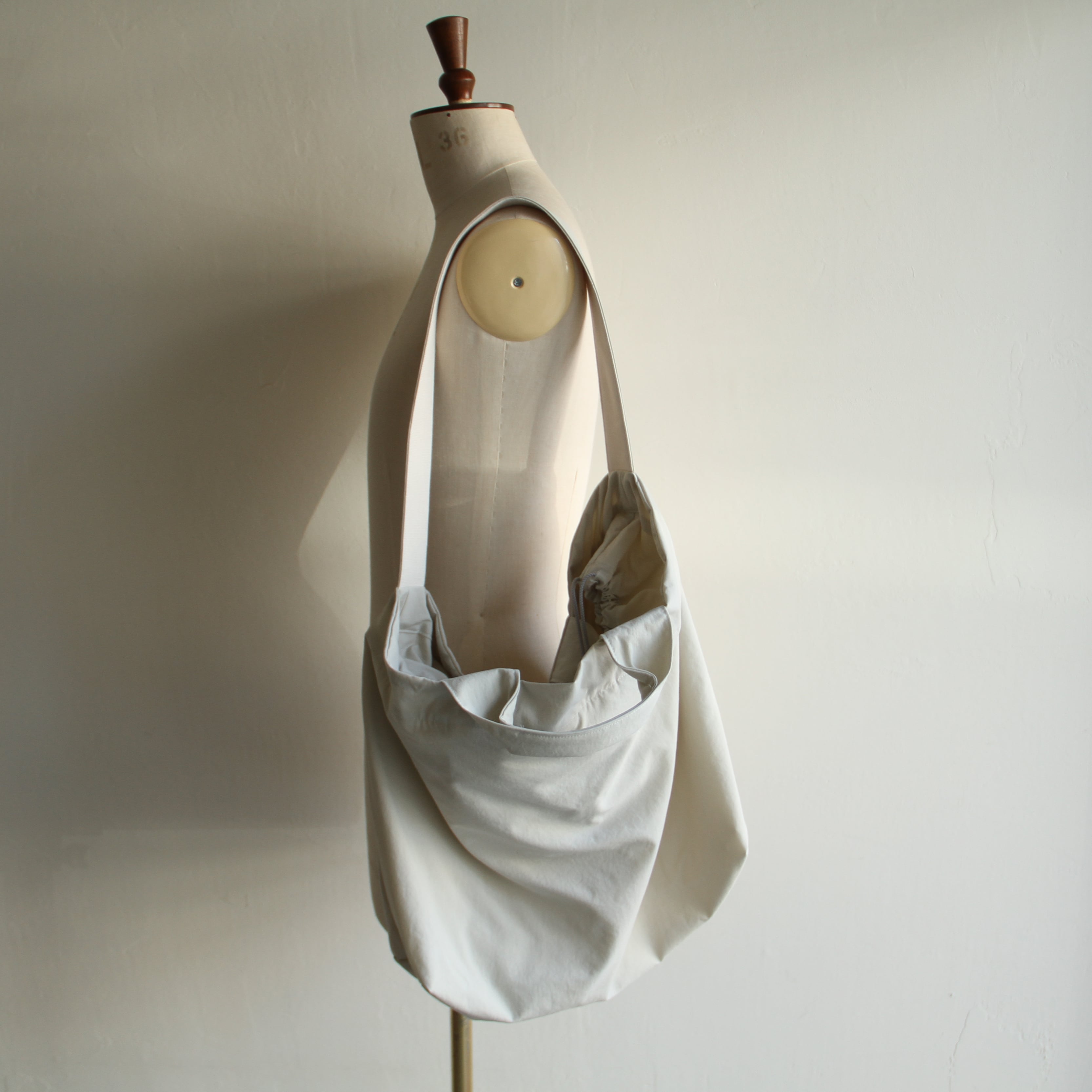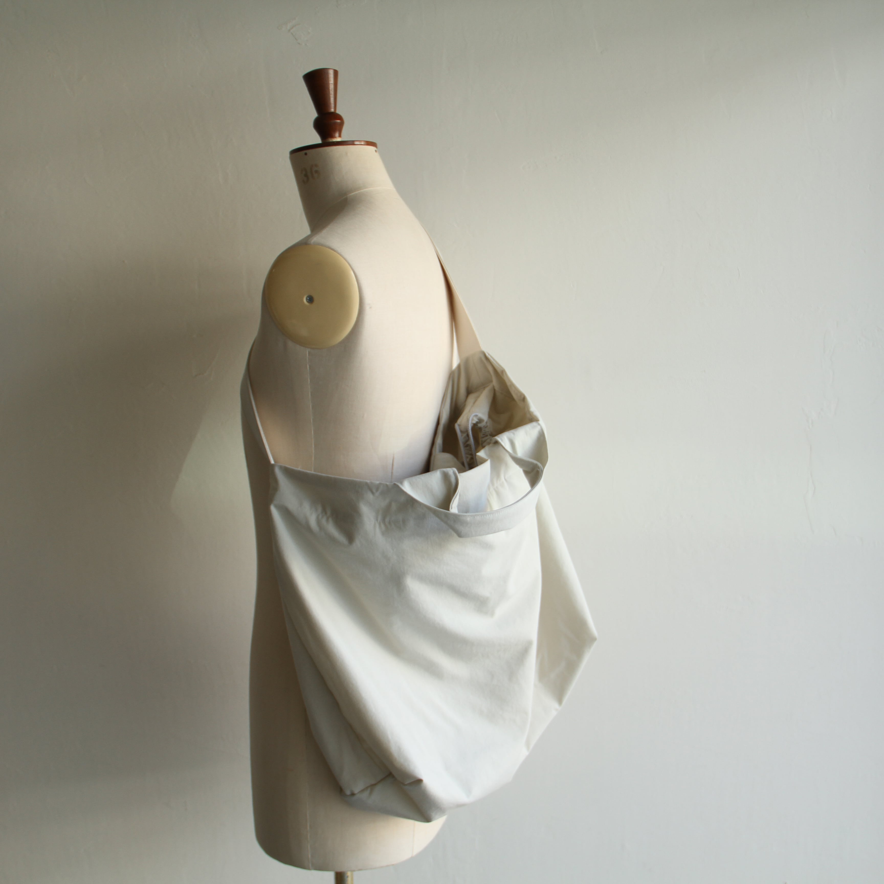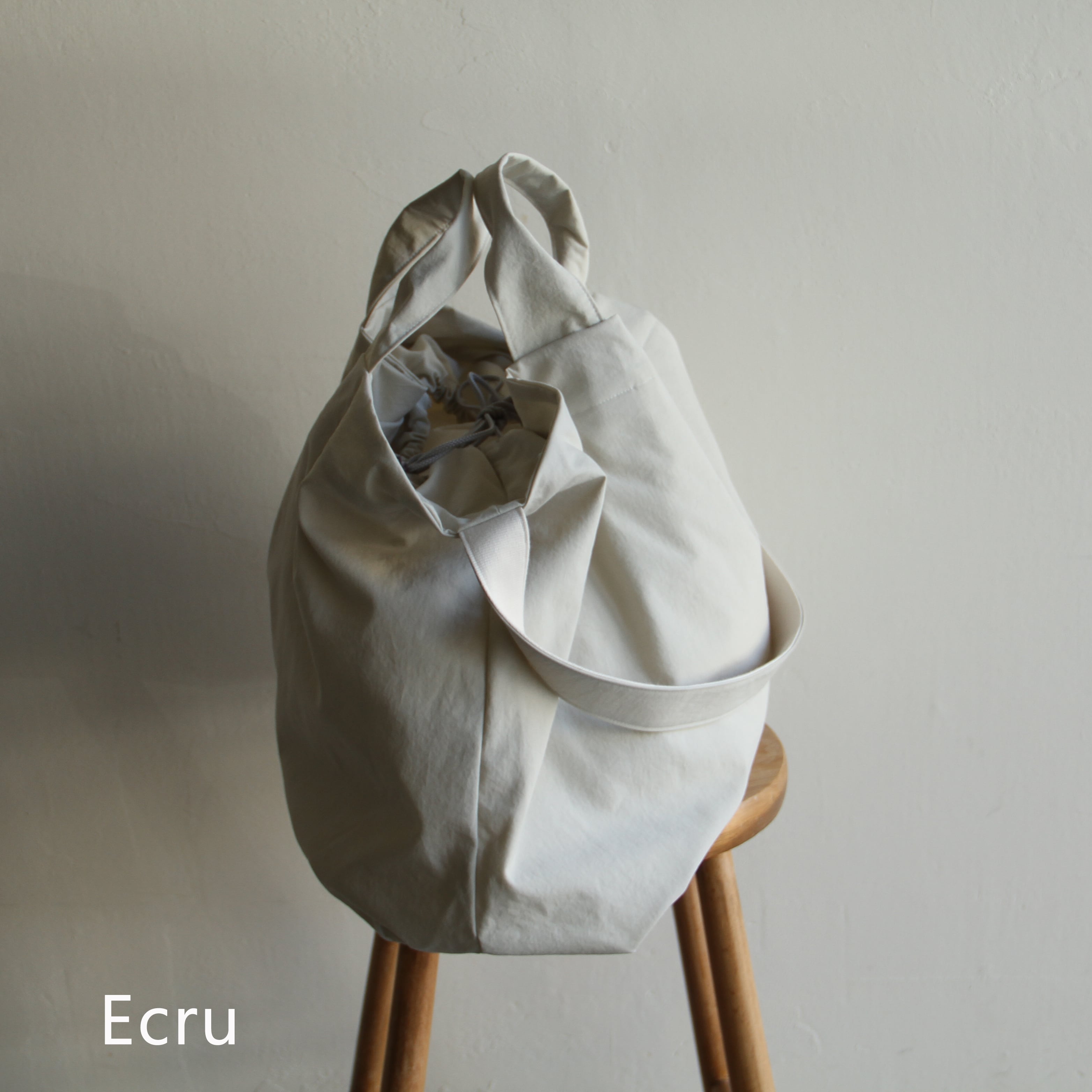 口部分についている巾着ディテールを絞るとフォルムを変えれるのも面白い特徴です。撥水性のある素材を使用しています。
