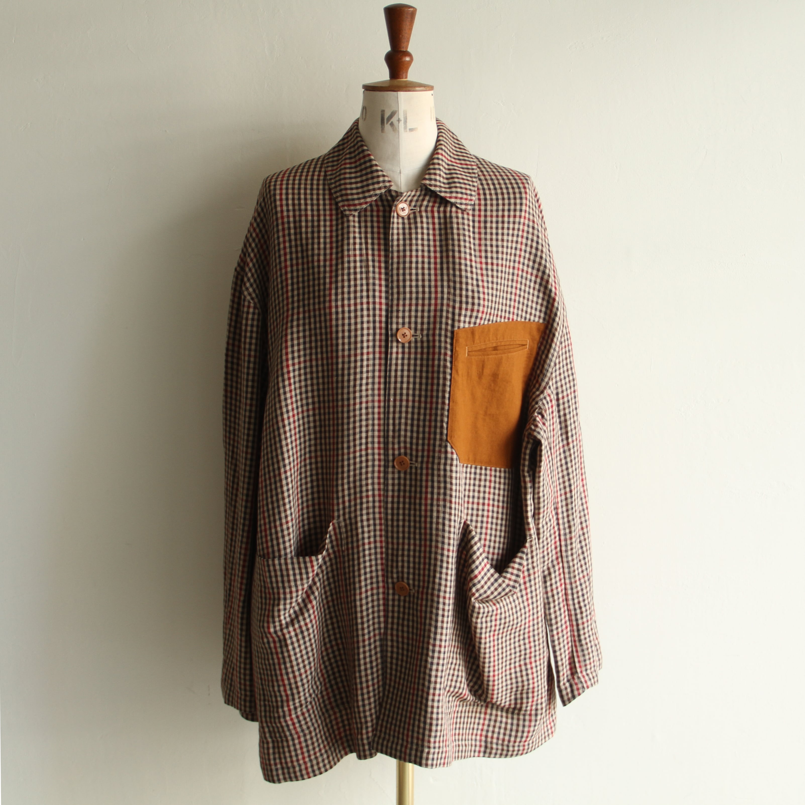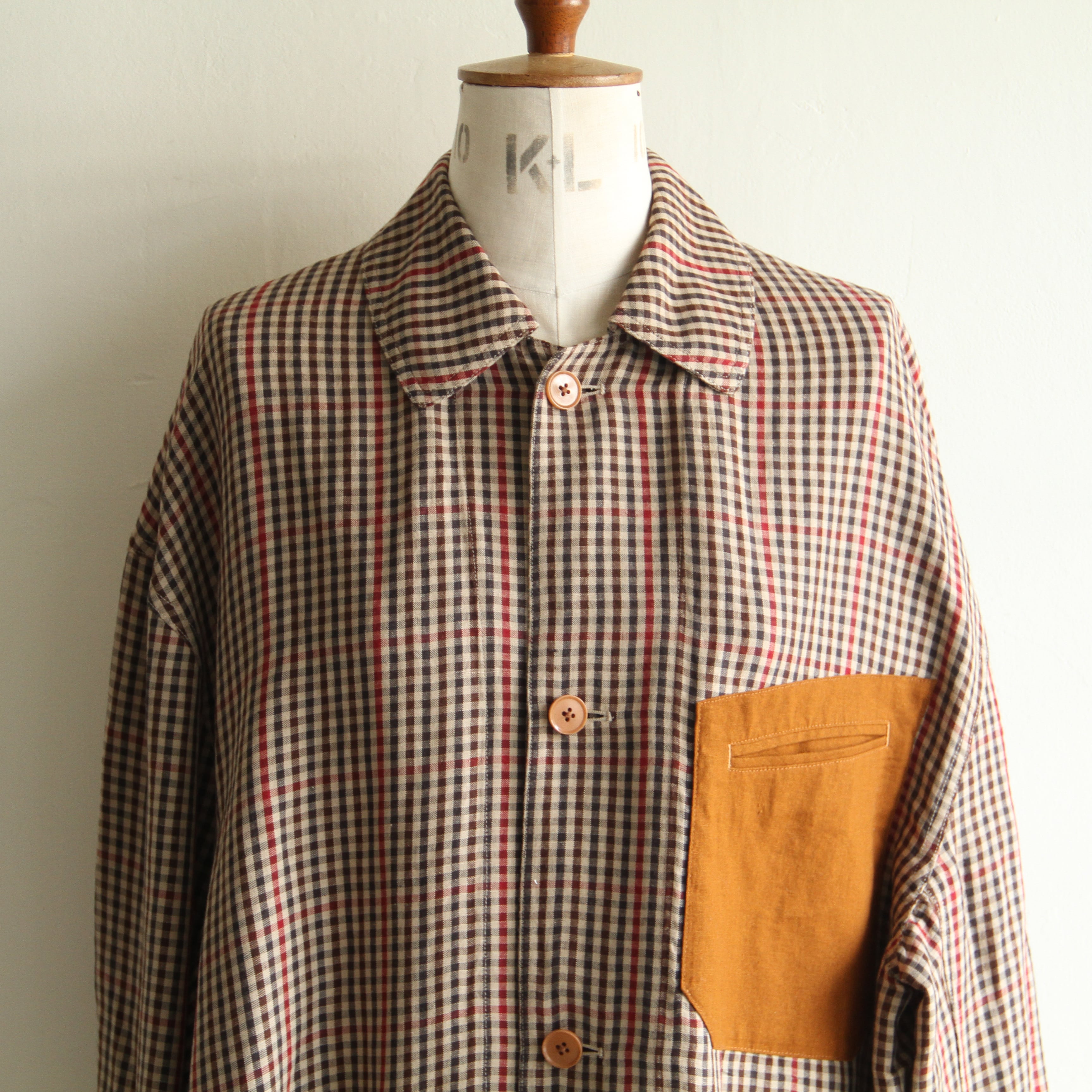 フレンチカバーオールをベースに、別布使いのパッチポケットや色味を揃えたナットボタンなど、細部のデザインにこだわりを感じる1着です。
