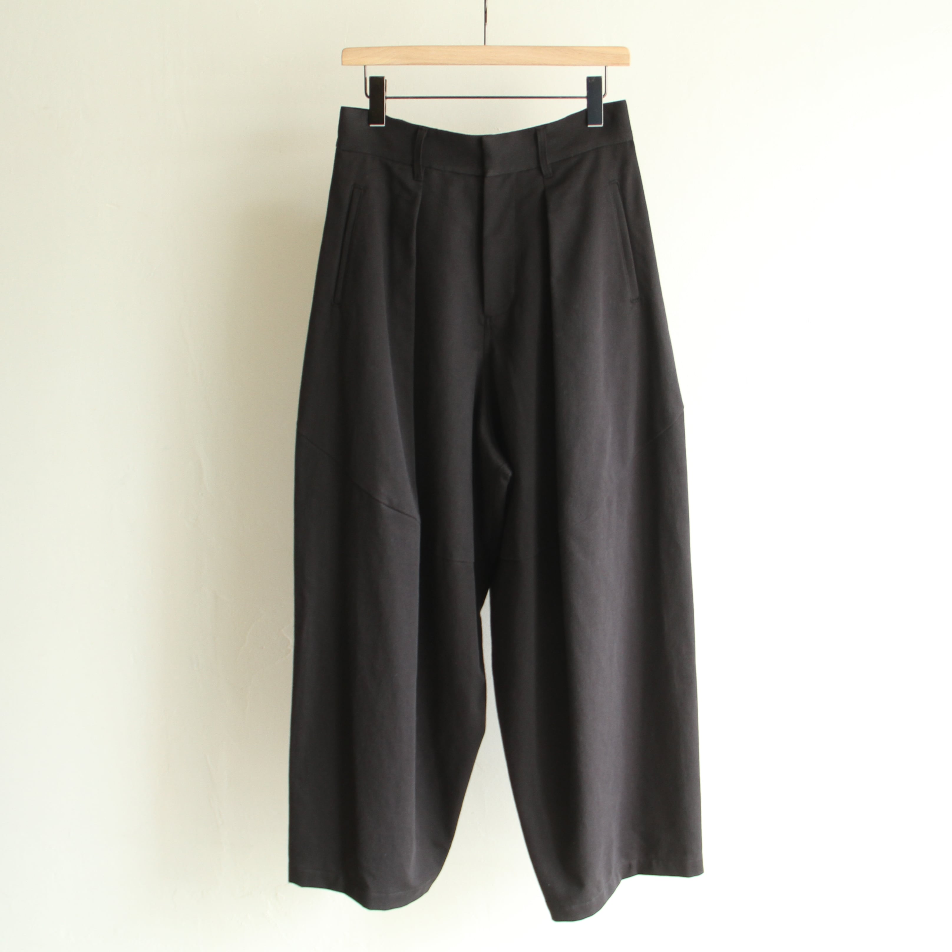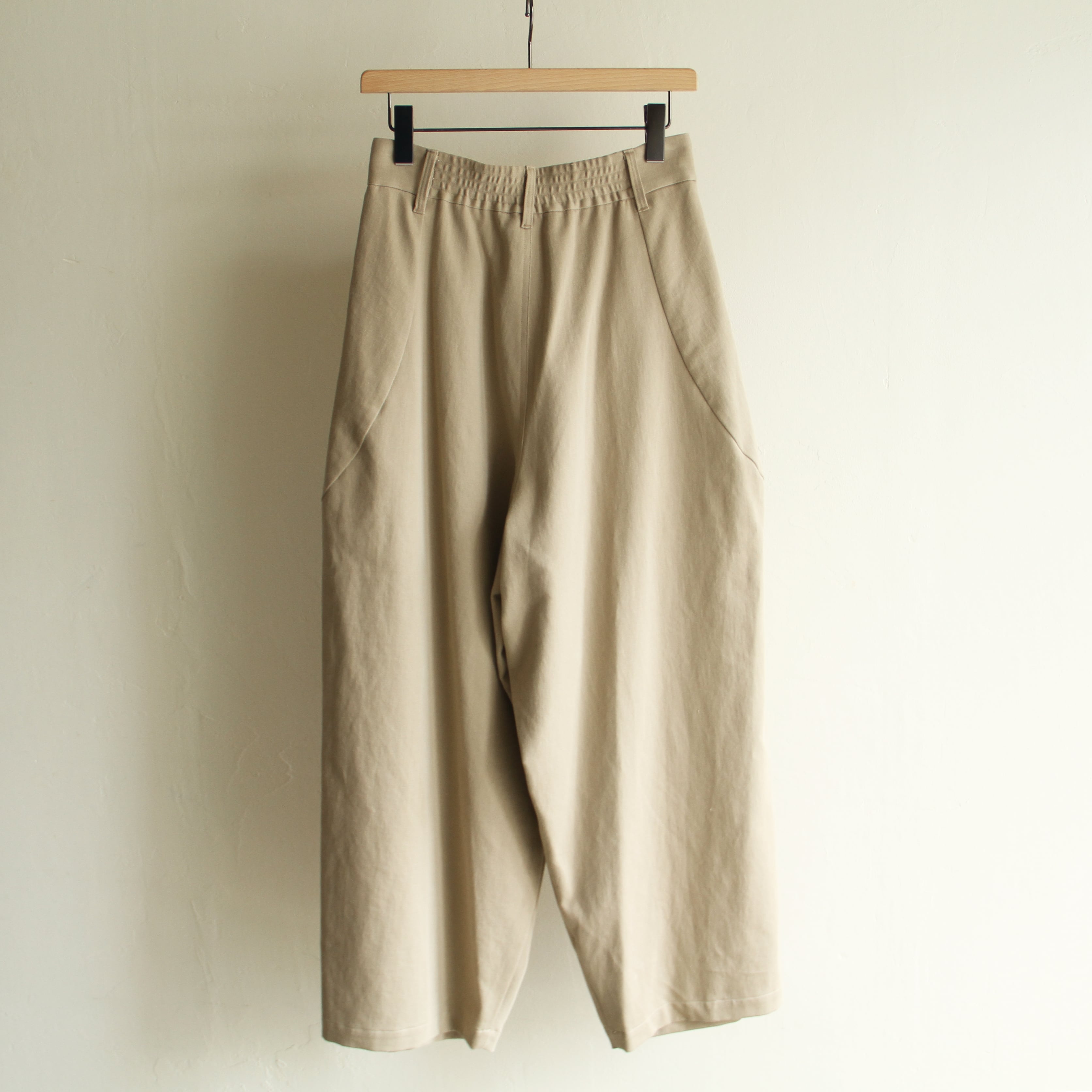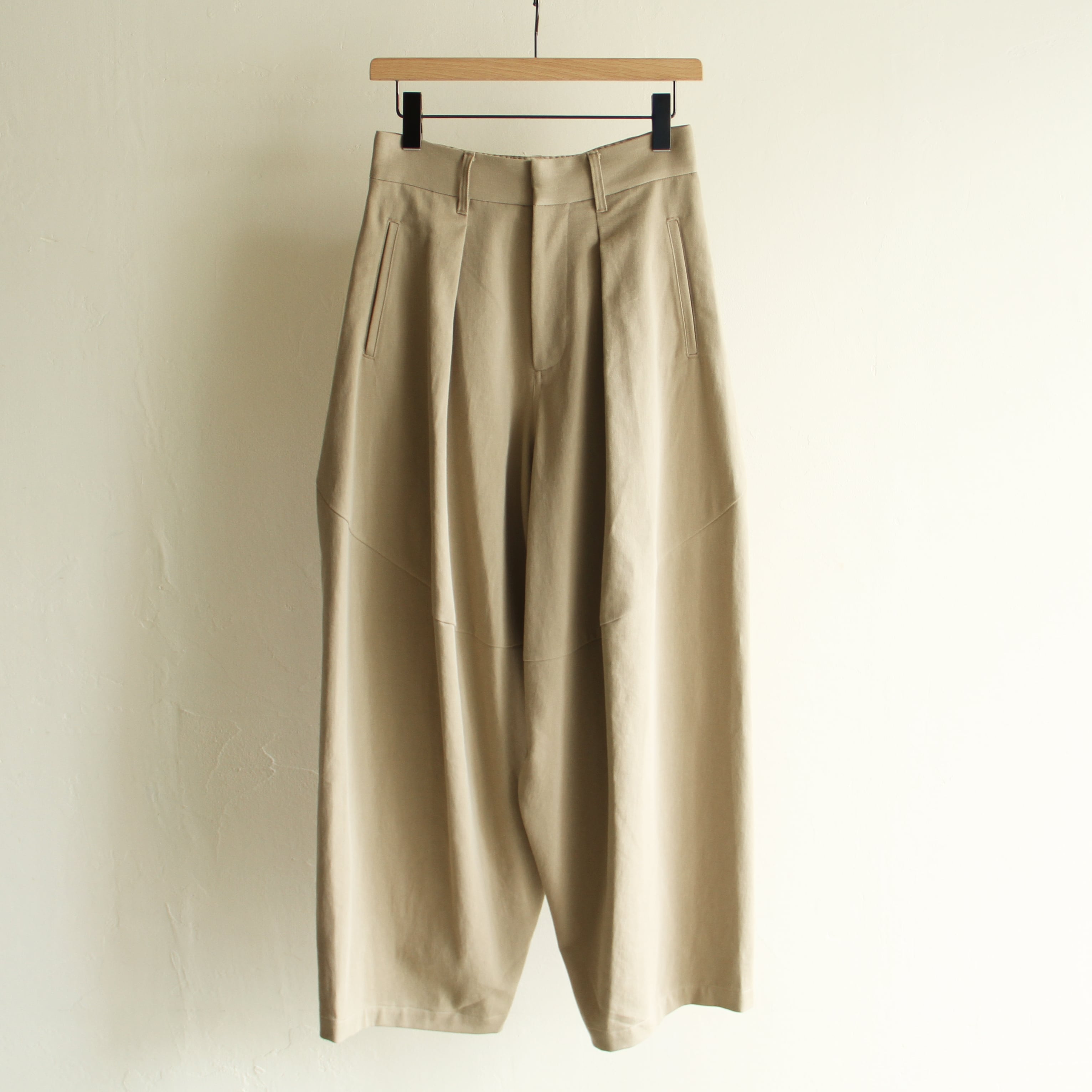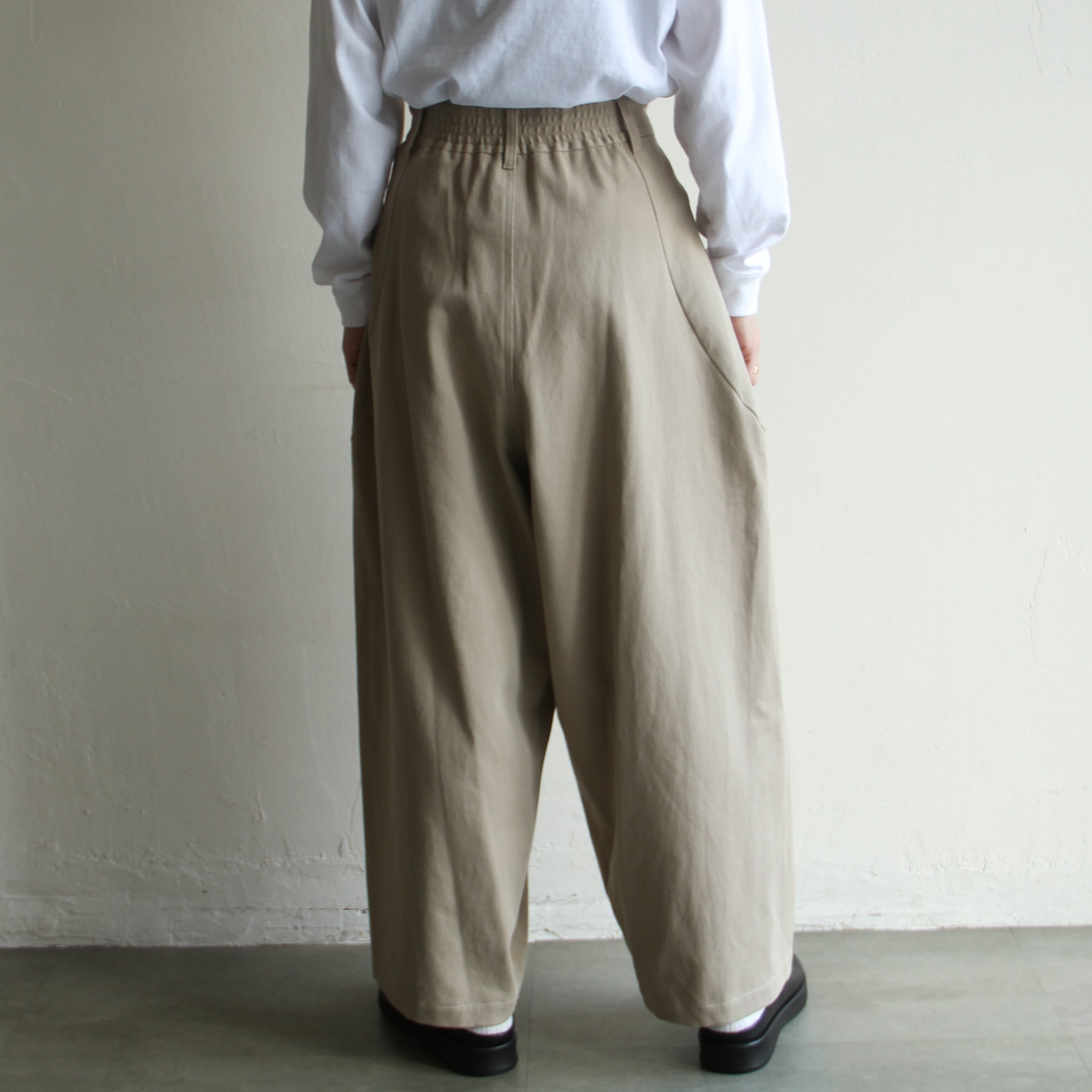 柔らかで落ち感のあるコットンバックサテン生地を使用したバレルパンツ。