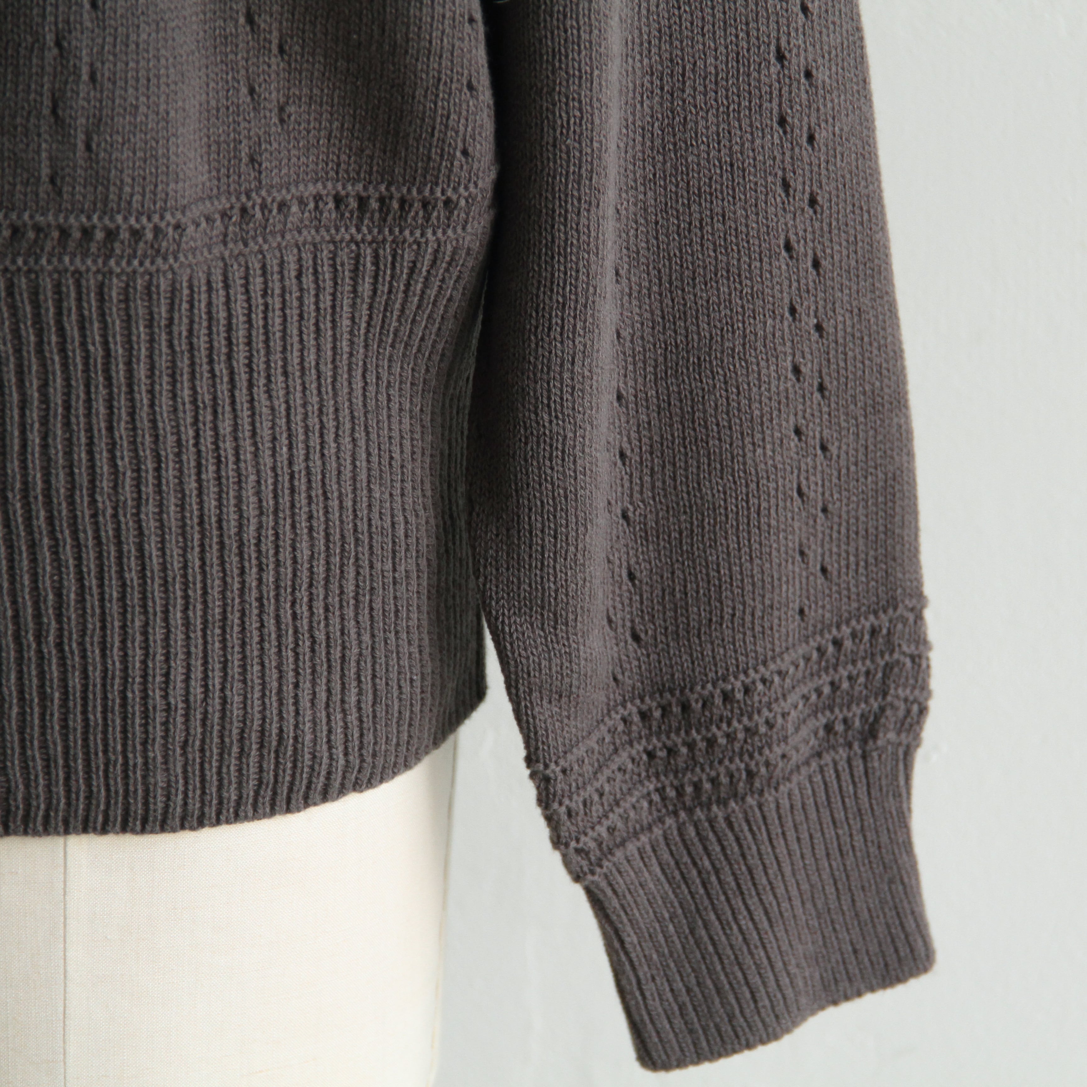 幾何学模様を思わせる立体的な編み柄が、素朴の中に奥行を添える1枚。