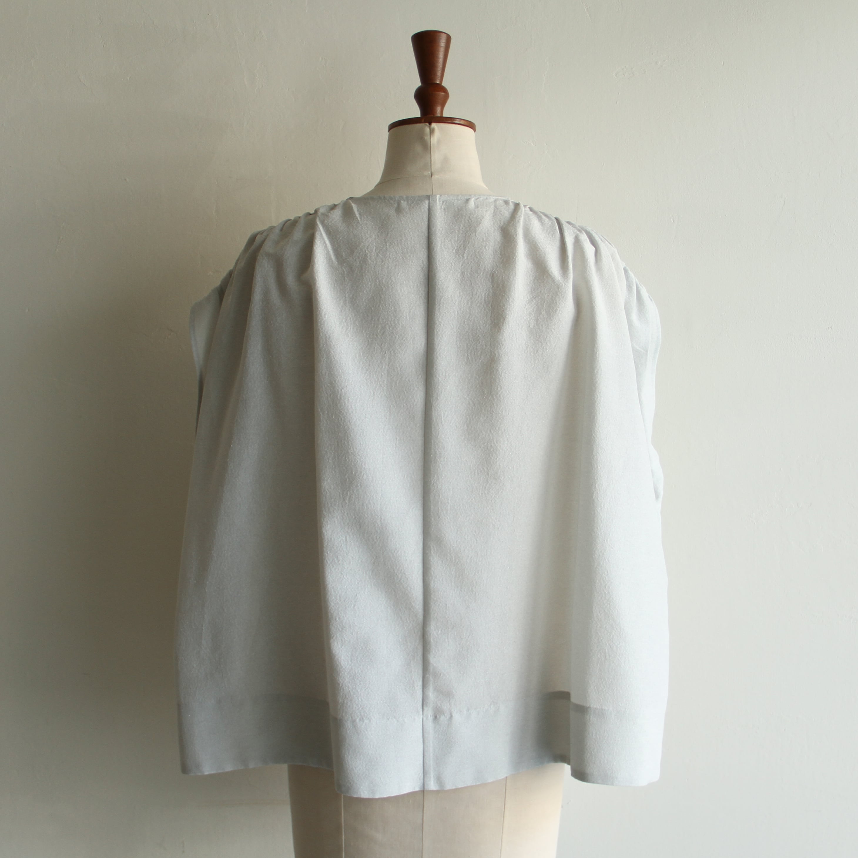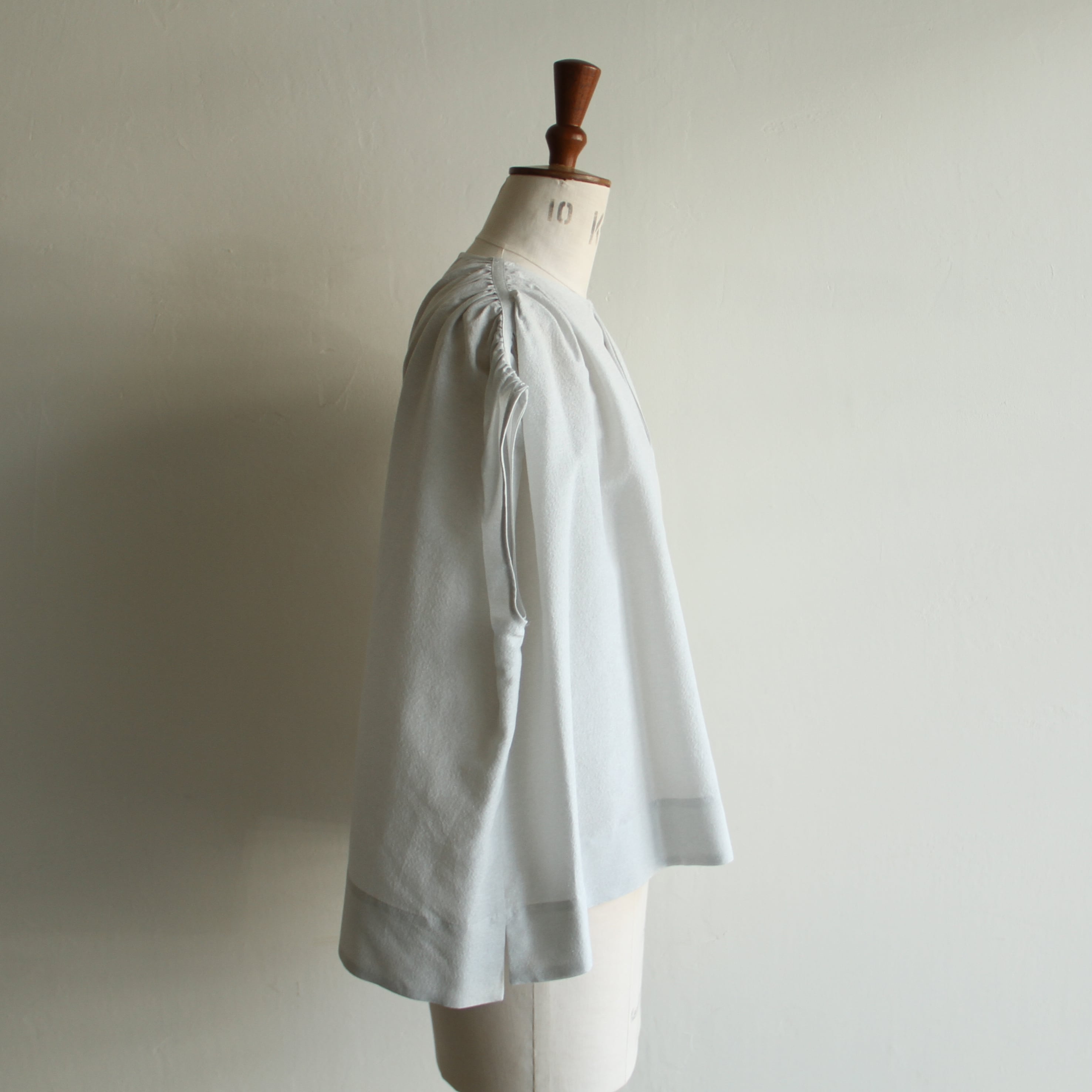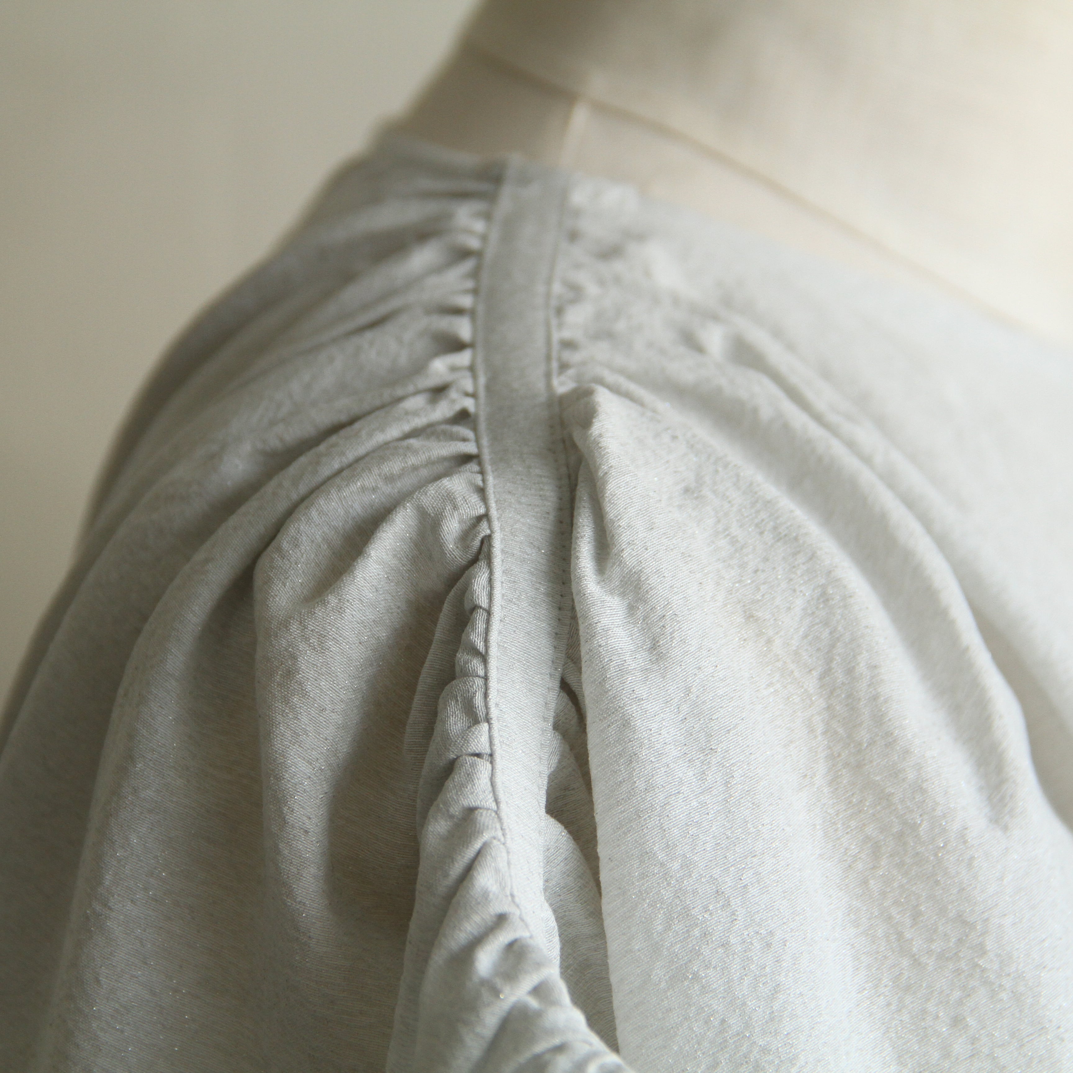袖のギャザーがとても美しく、二の腕がかくれるくらいの長さになっております。
