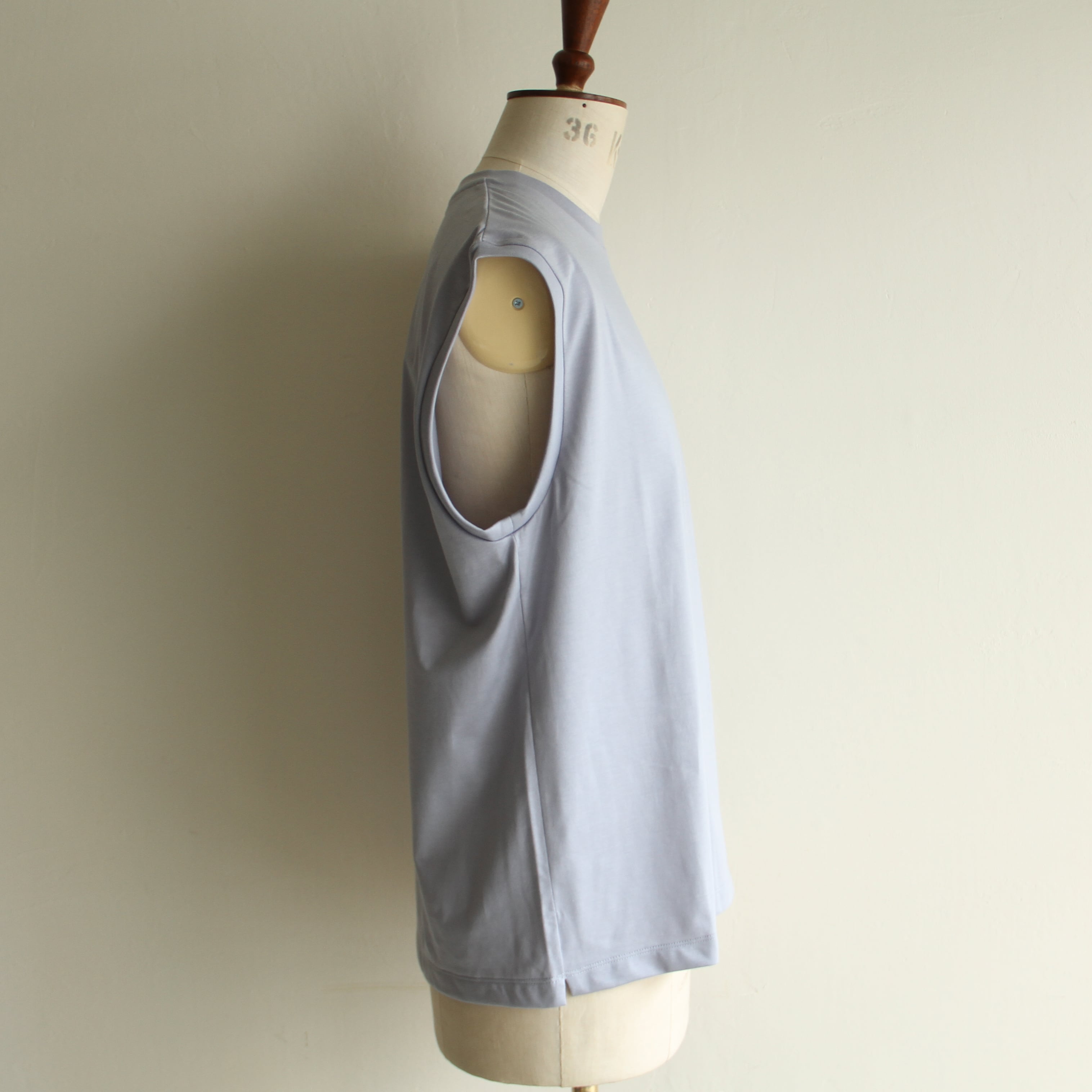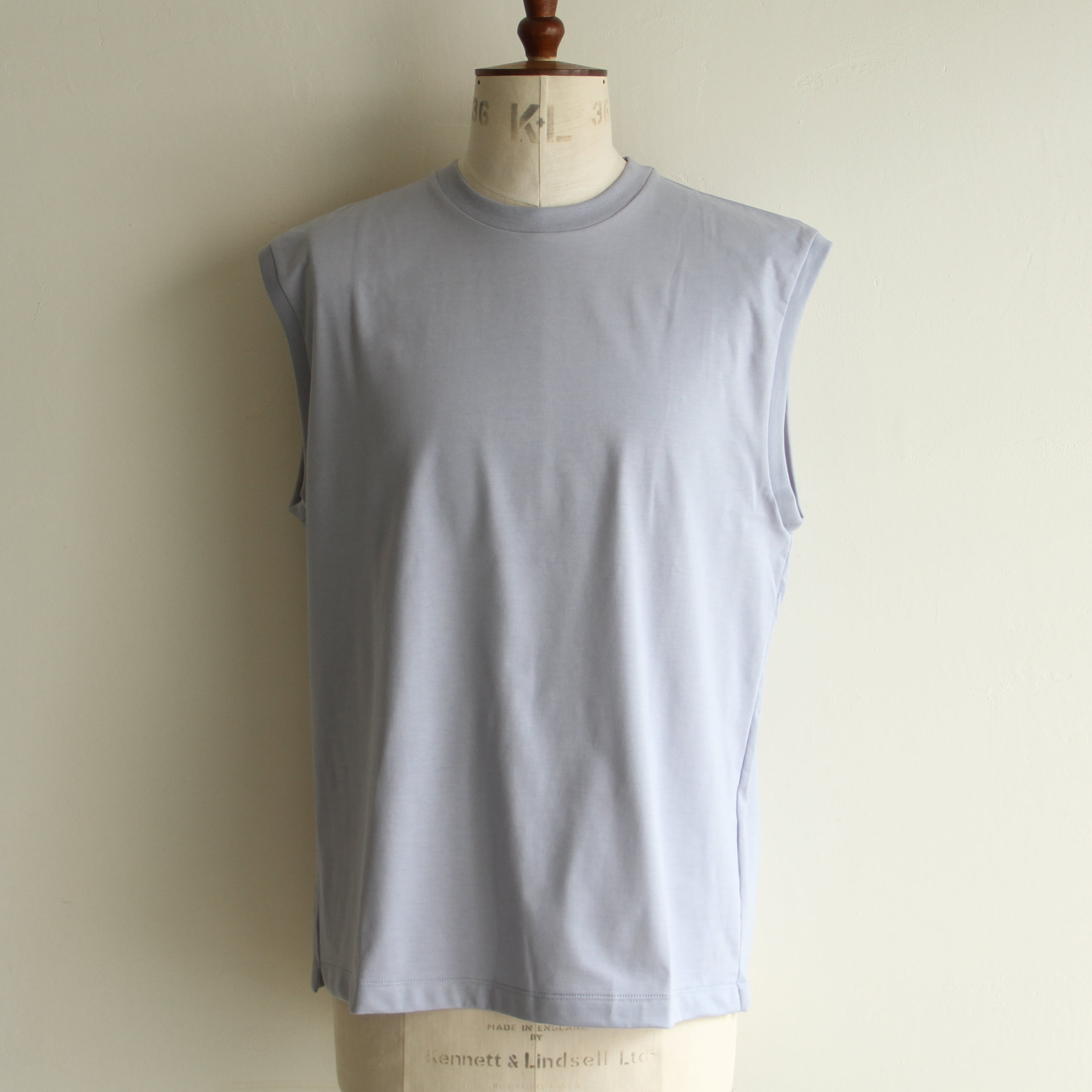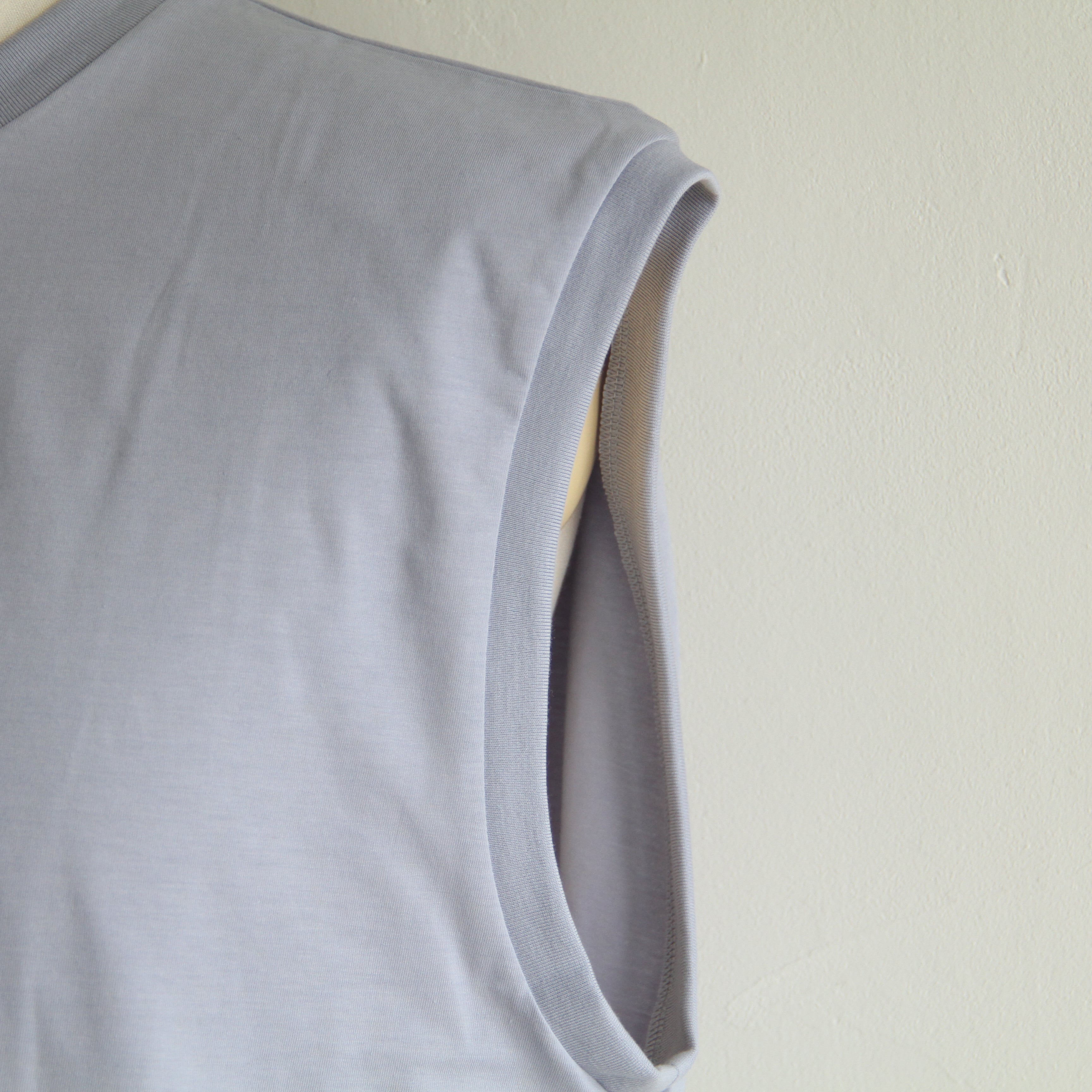昨今の酷暑を乗り切るためのノースリーブT企画。このデザインは肩幅の落ち具合と身幅が勝負の極めてデリケートなアイテム。