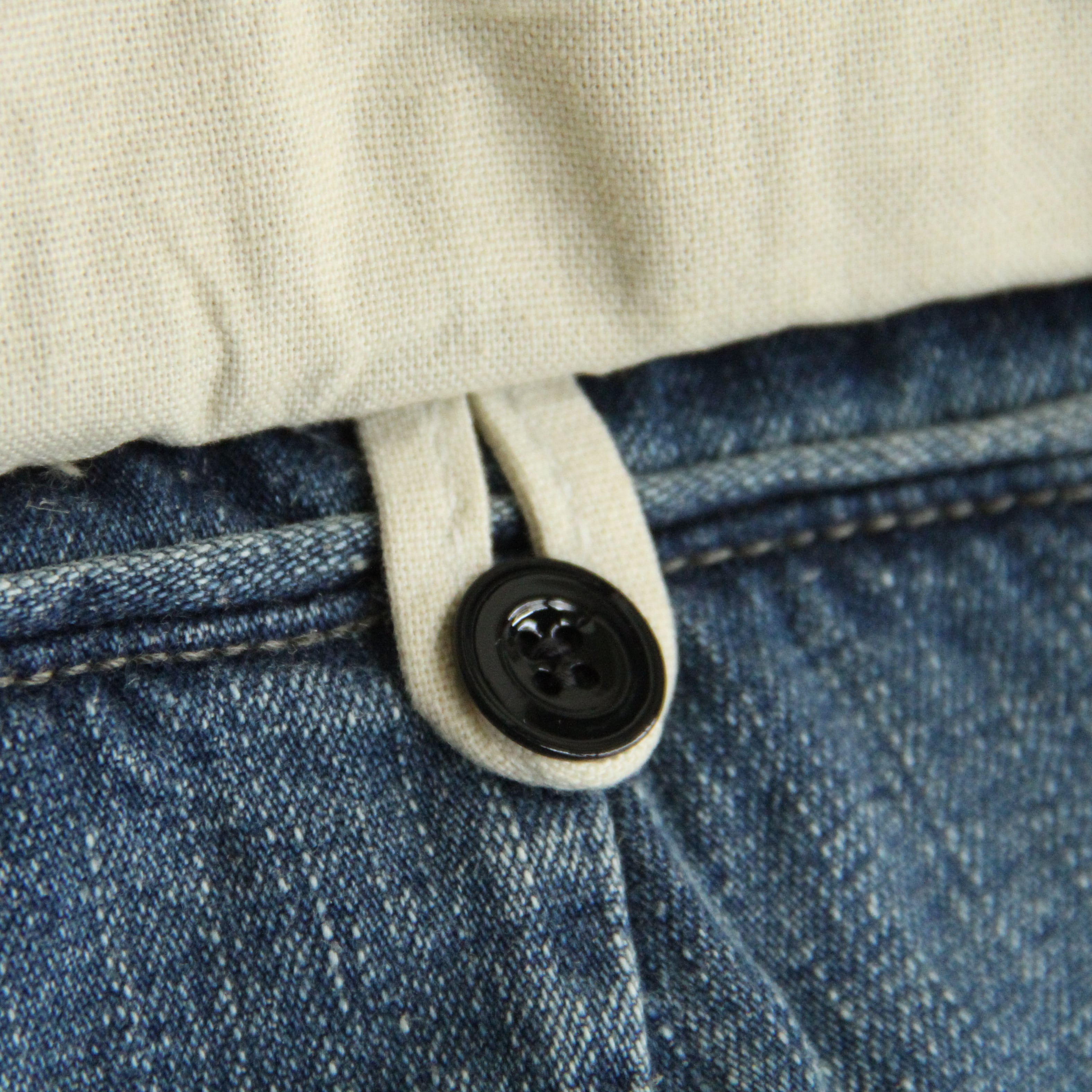 縦糸に天然藍でロープ染めを施し、緯糸に綿とヘンプの混紡糸を打ち込んだ OUTIL オリジナルの生地を使用しています。