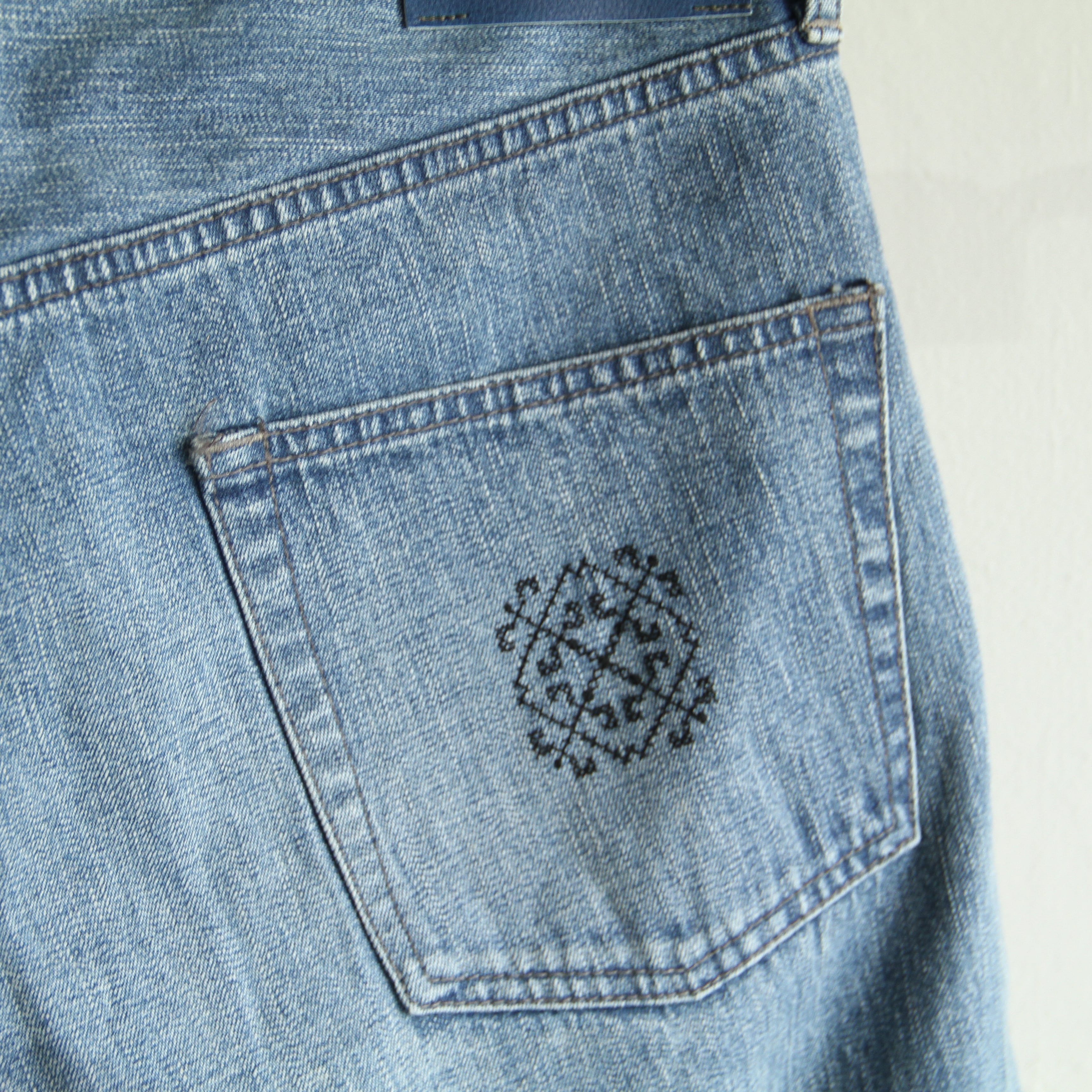 縦糸に天然藍でロープ染めを施し、緯糸に綿とヘンプの混紡糸を打ち込んだオリジナルのデニム生地です。