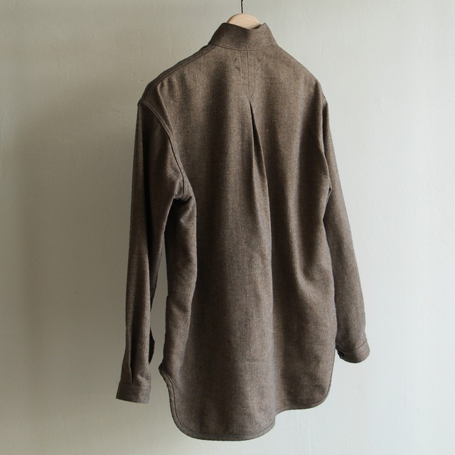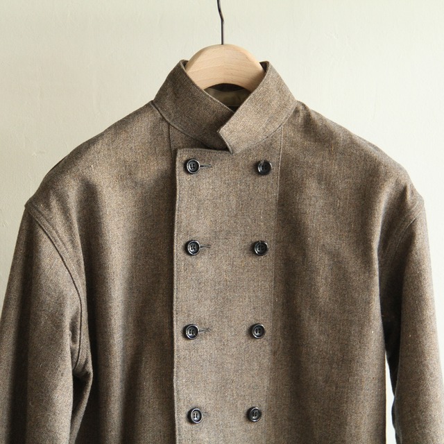 一見ツイード調ですが、玉虫状にカラーが変化するクラシックでありながらモードな素材感の生地を、AUBERGE定番のKOLLAR型、1930年代にフレンチワーカーの間で流行した浅いダブル仕立てのシャツジャケット。