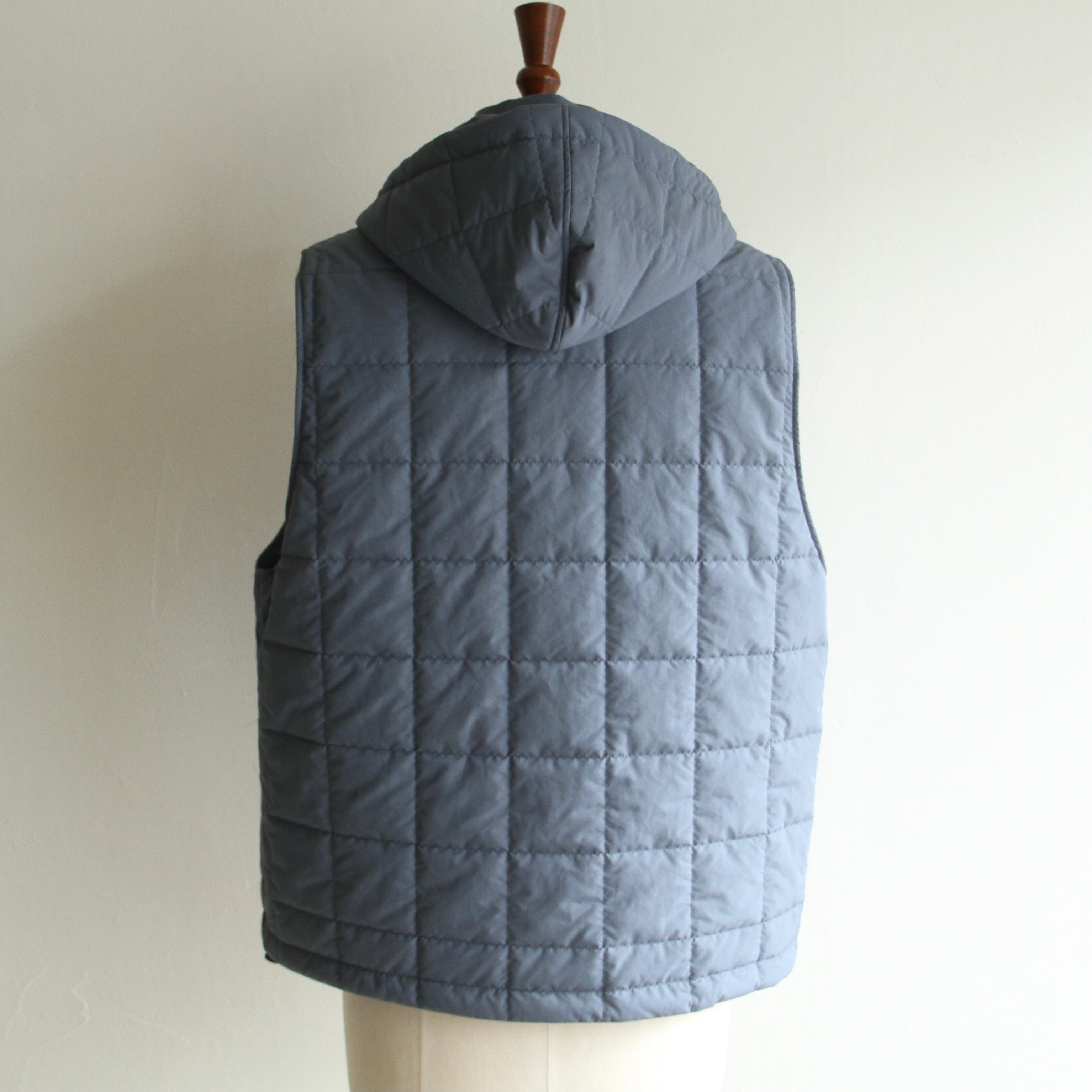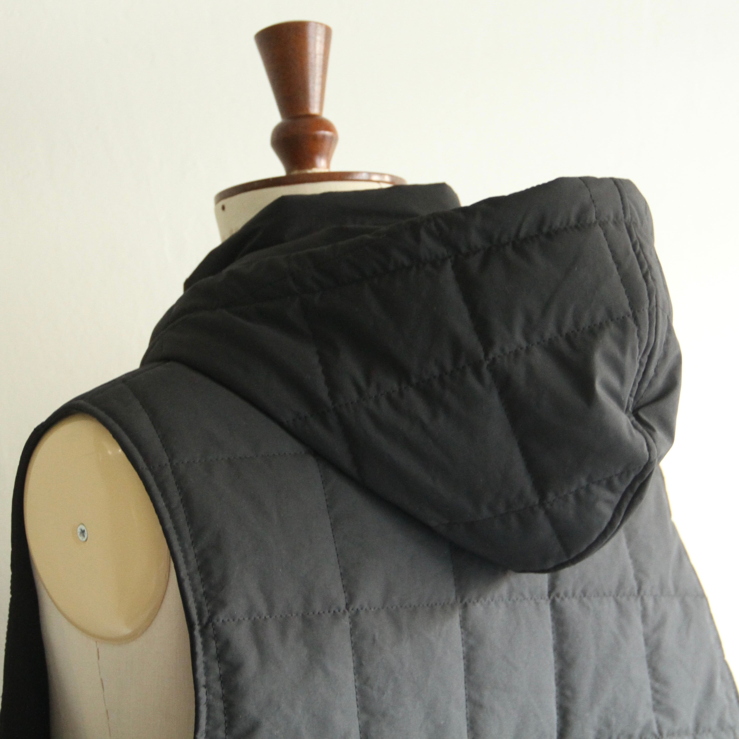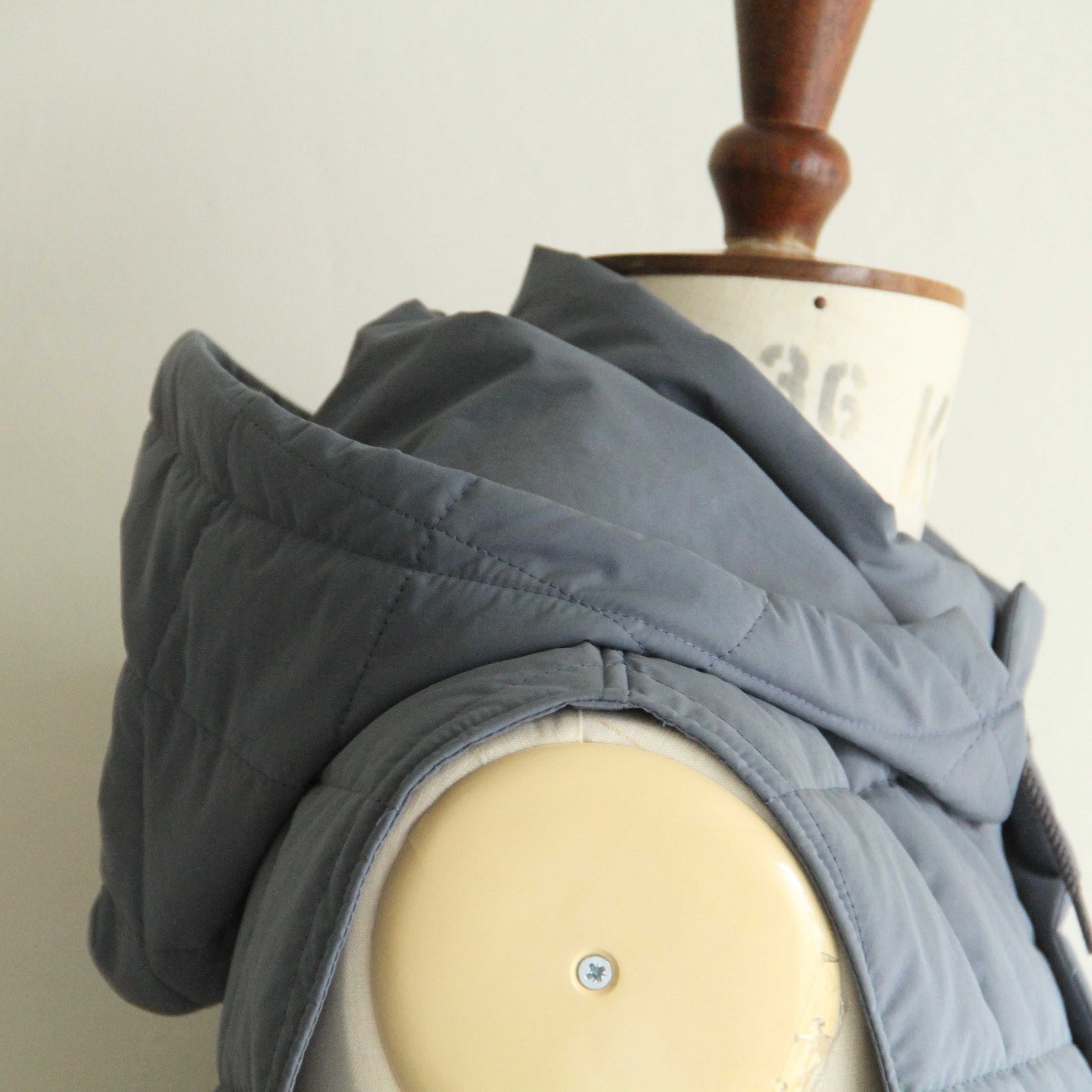 洗いざらしのコットンの様な表情のポリエステルを、シンサレートでキルト加工をしたフード付きのアウターベスト。