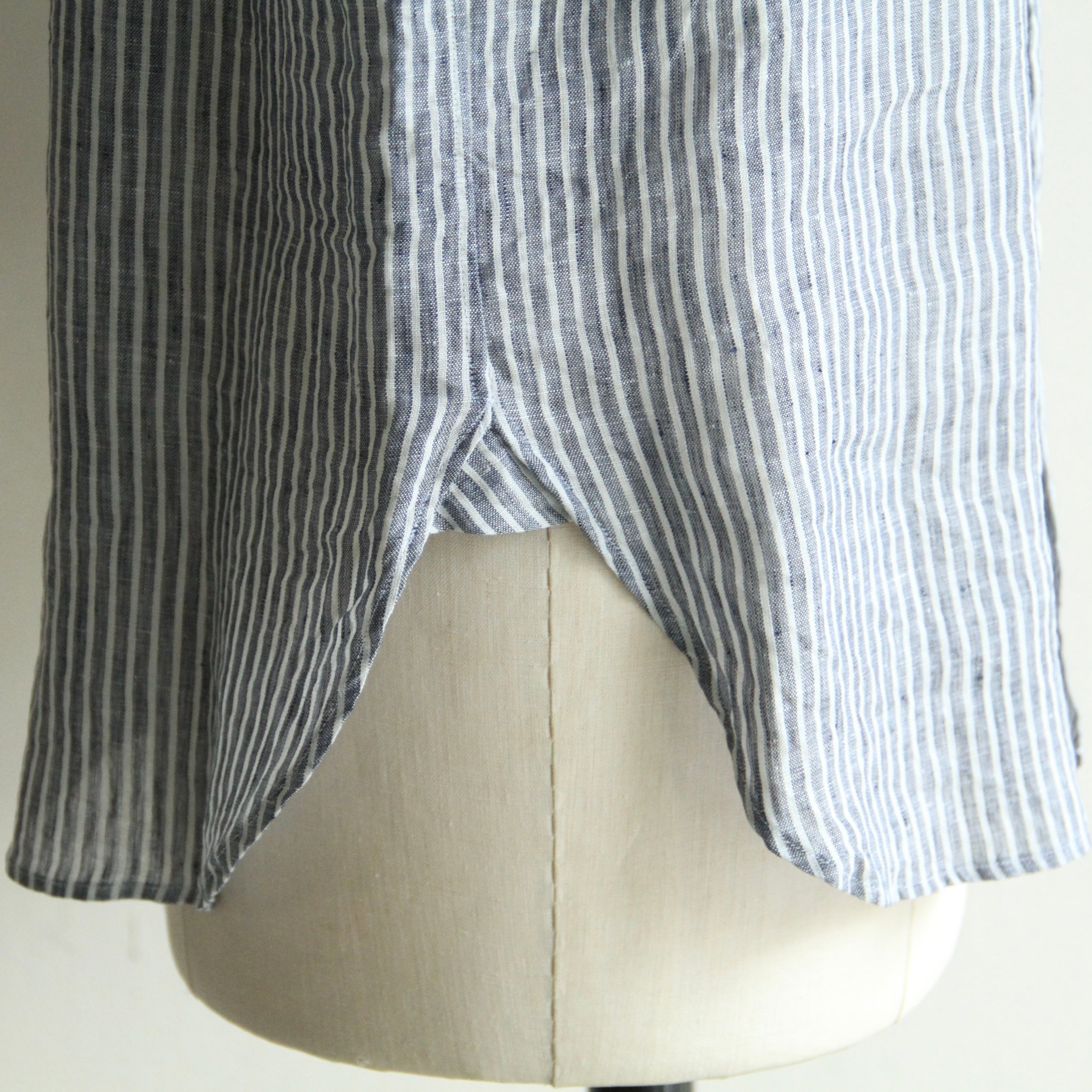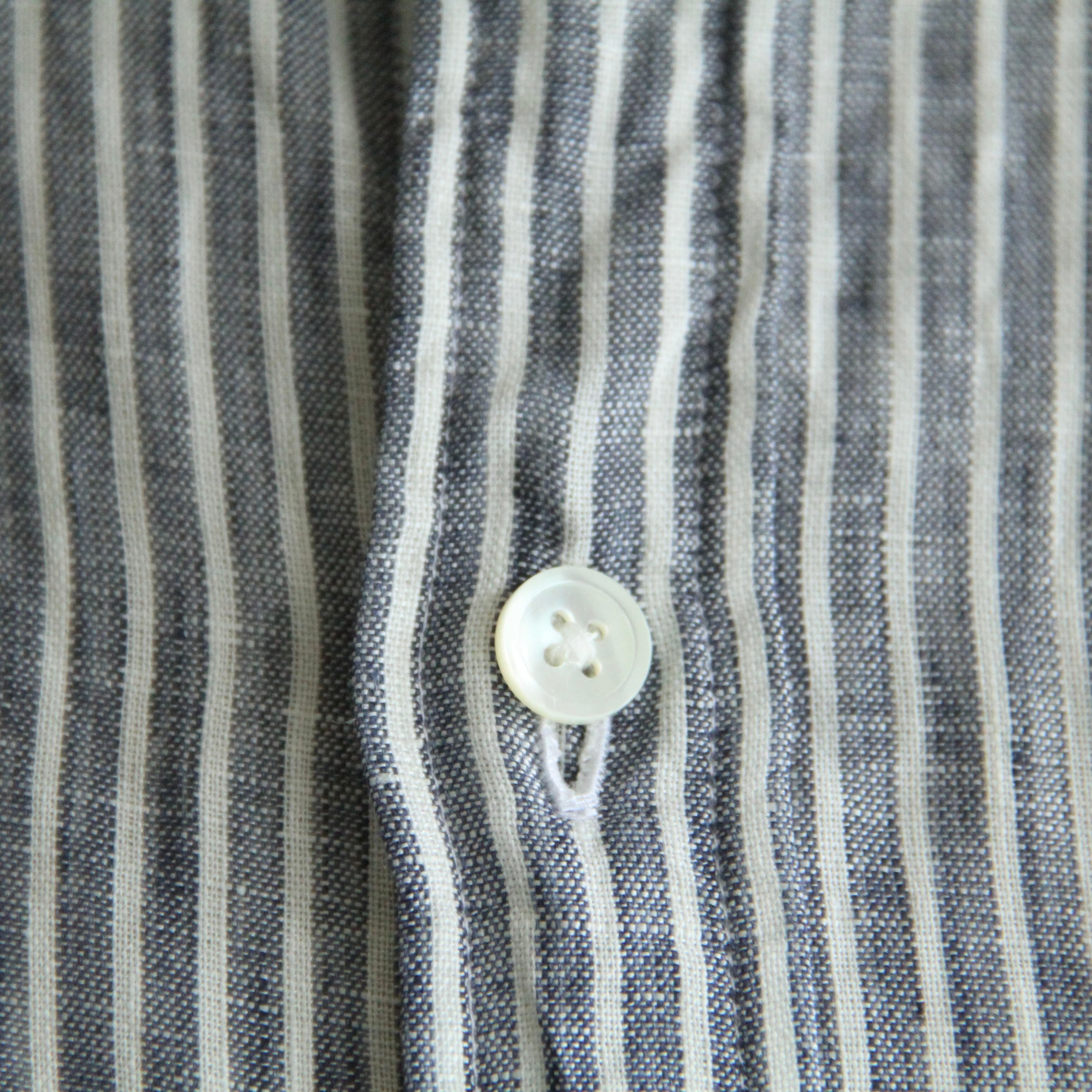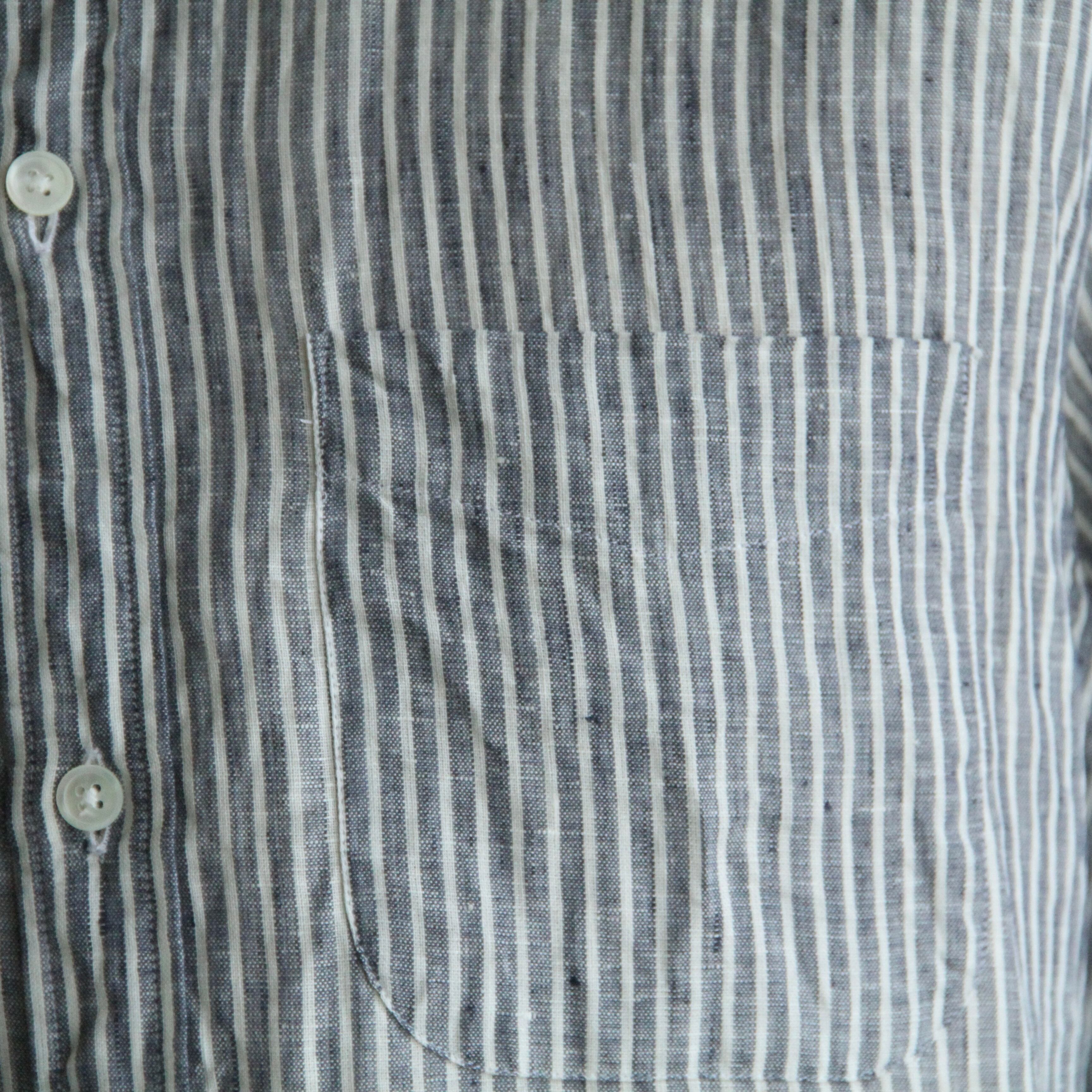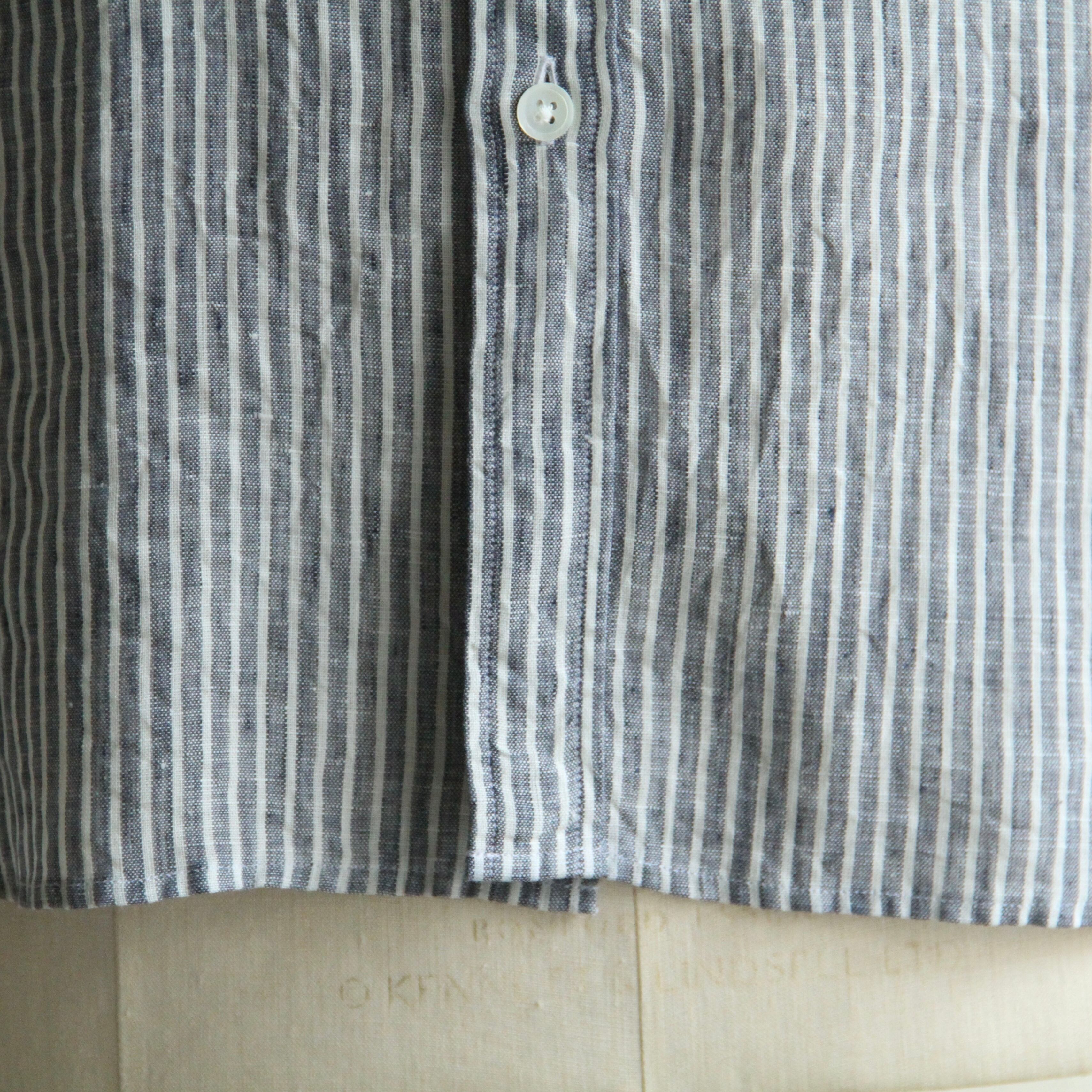 生地は最高品質フレンチリネン100%のアルビニ社の生地を使用。亜麻の堅い茎を地面から引き抜いたあと、自然な劣化を生じさせるため、2週間から3週間は水に浸す工程を入れています。その工程により繊維が柔らかくなり、さらに繊維を叩いてほぐす工程を経て、手選別にて厳選された最高品質のフレンチリネンを使用しています。アルビニ社のフレンチリネンならではの光沢感があり、独特なムラ感とナチュラルな風合いながらも、肌さわりと着心地の良さを併せ持っている上品かつ気持ちよさが魅力のシャツです。