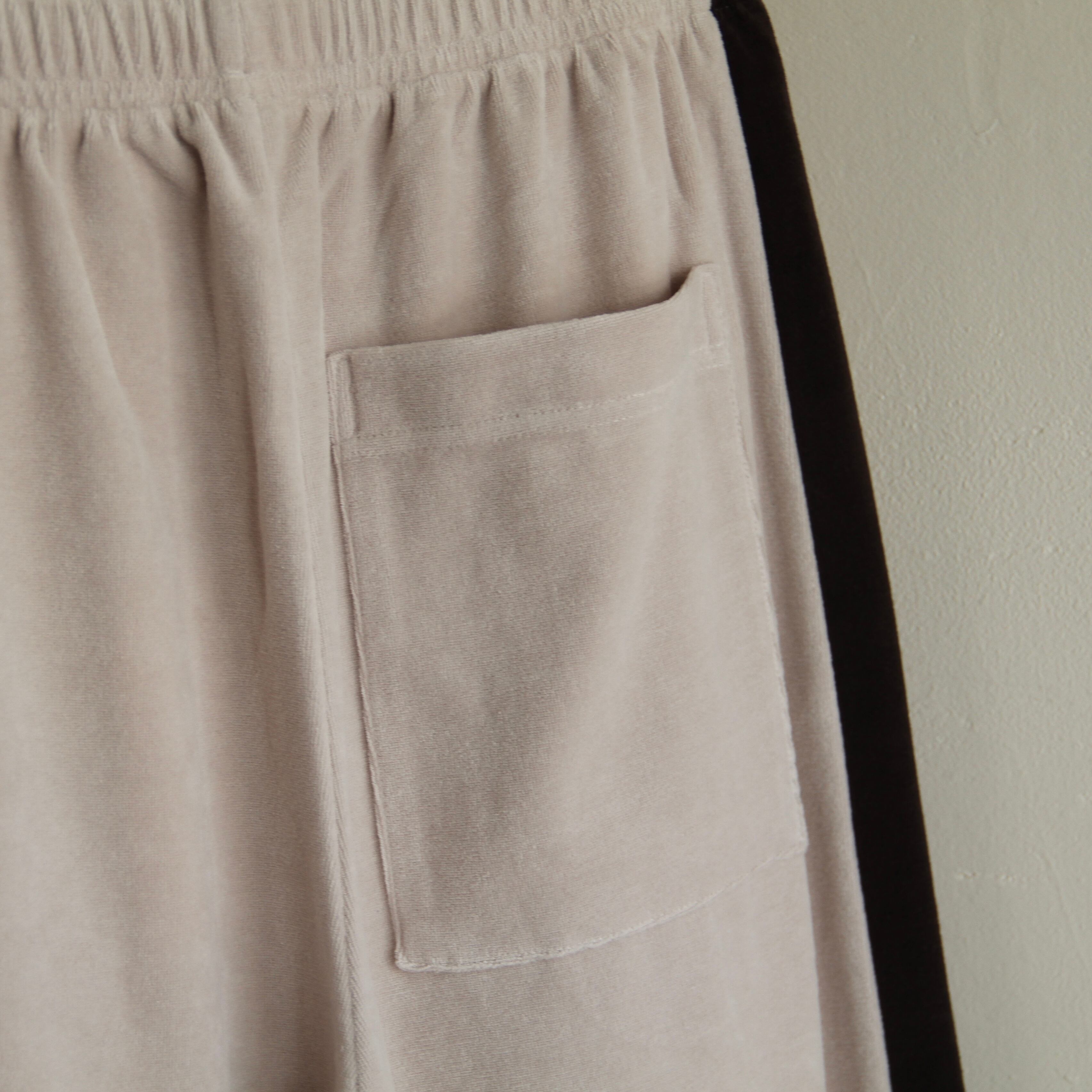 ウエストはゴム仕様、内側にドローストリングを 配置しているのでリラクシーな履き心地。